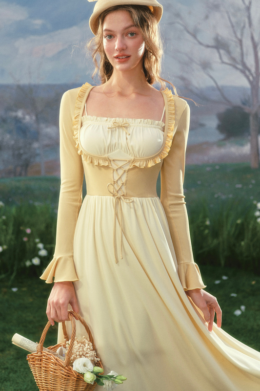 레이스 옐로우 레트로 롱 원피스
