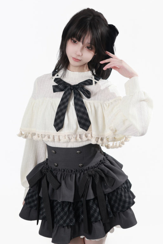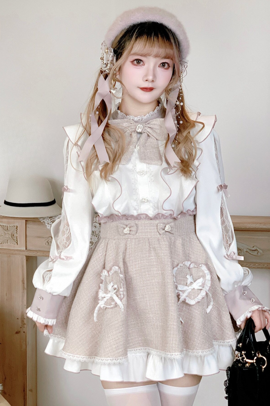 레이스 어깨 리본 블라우스 + 스커트