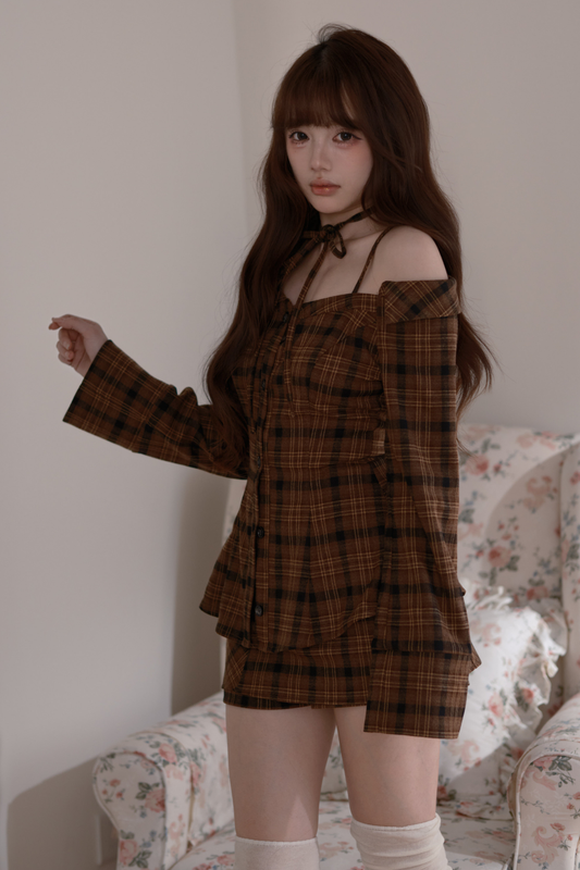 체크 오프숄더 탑 + 반바지