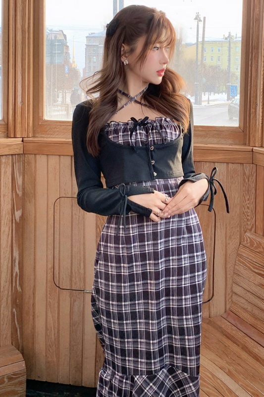 체크 슬림 원피스 + 가디건