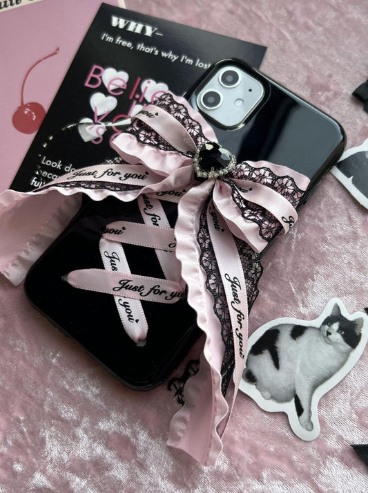 걸리 래빗 모피볼 펜던트 리본 라인석 핸드폰 케이스 (여성용)