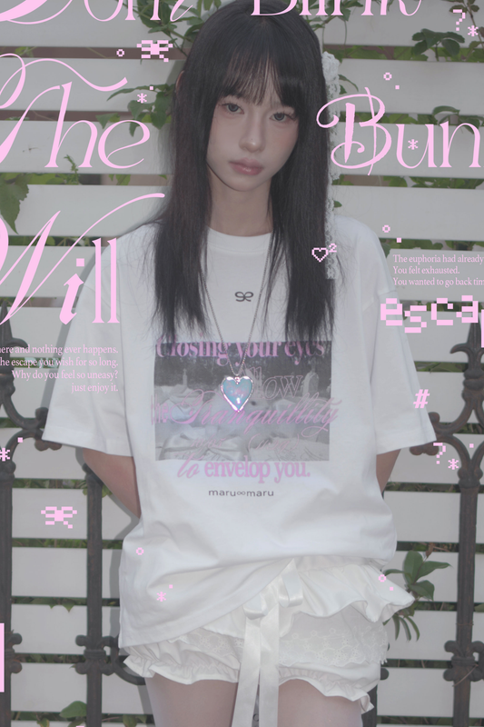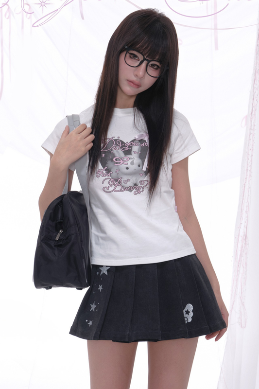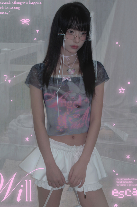 バニーケーキプリントアッシュシアーメッシュスリムトップス