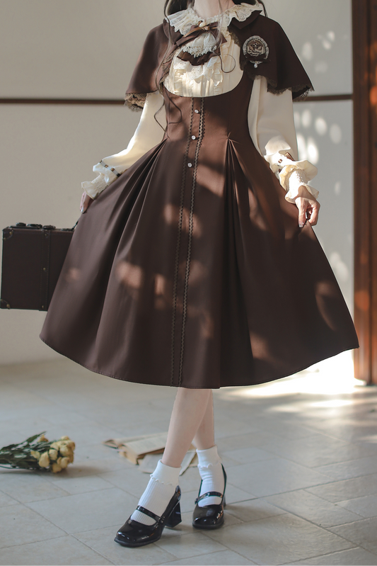 フレンチブラウンヴィンテージロリータドレス+ケープ+ベレー帽+バッジ