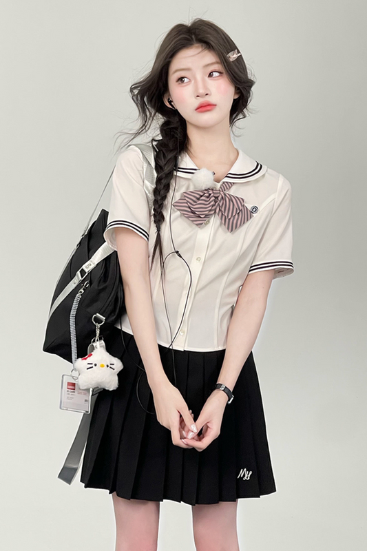 カレッジポロカラーシャツ+ストライプシャツ+プリーツショートスカート+ベーシックロングスカート