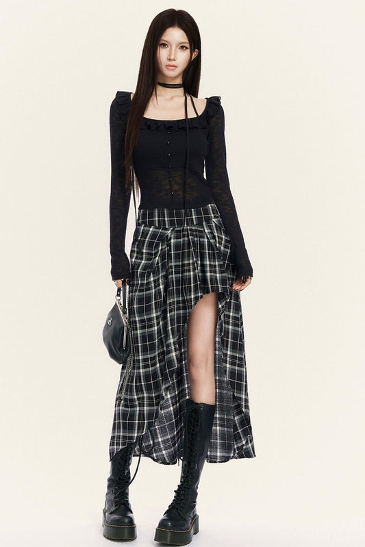 레트로 카키 체크 상의 + 스커트