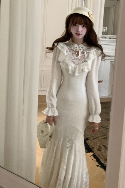 パフスリーブニットレースワンピース