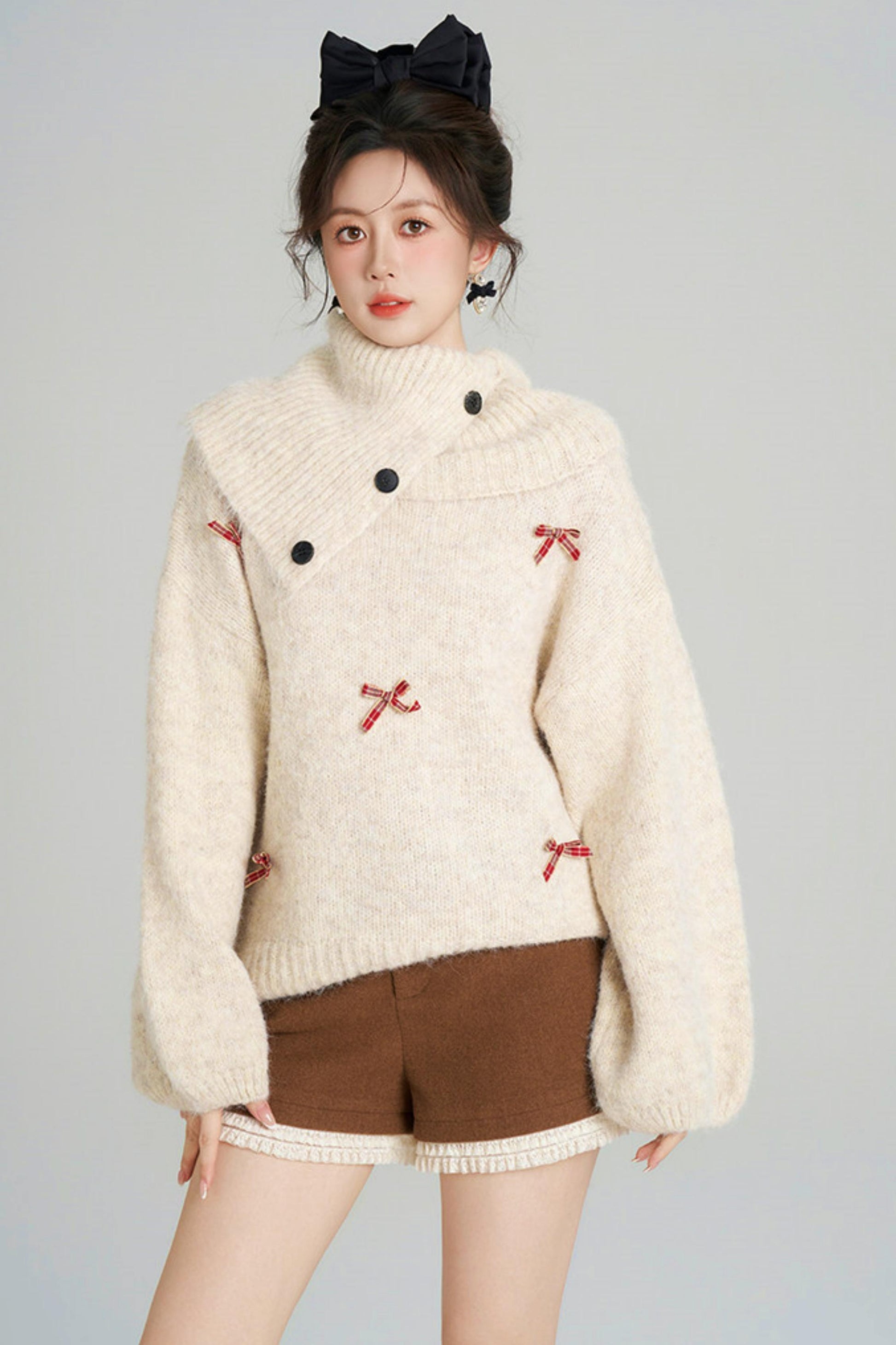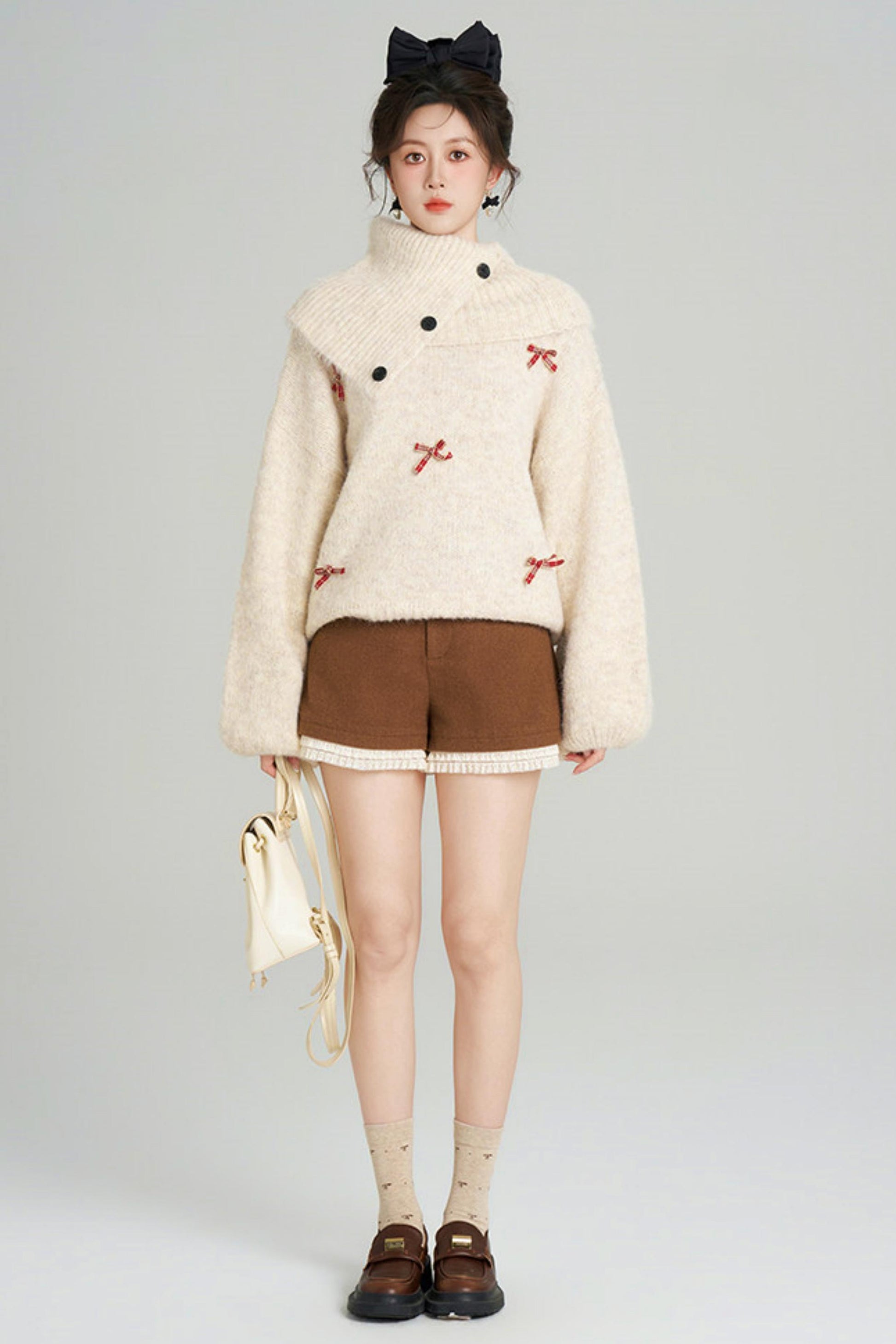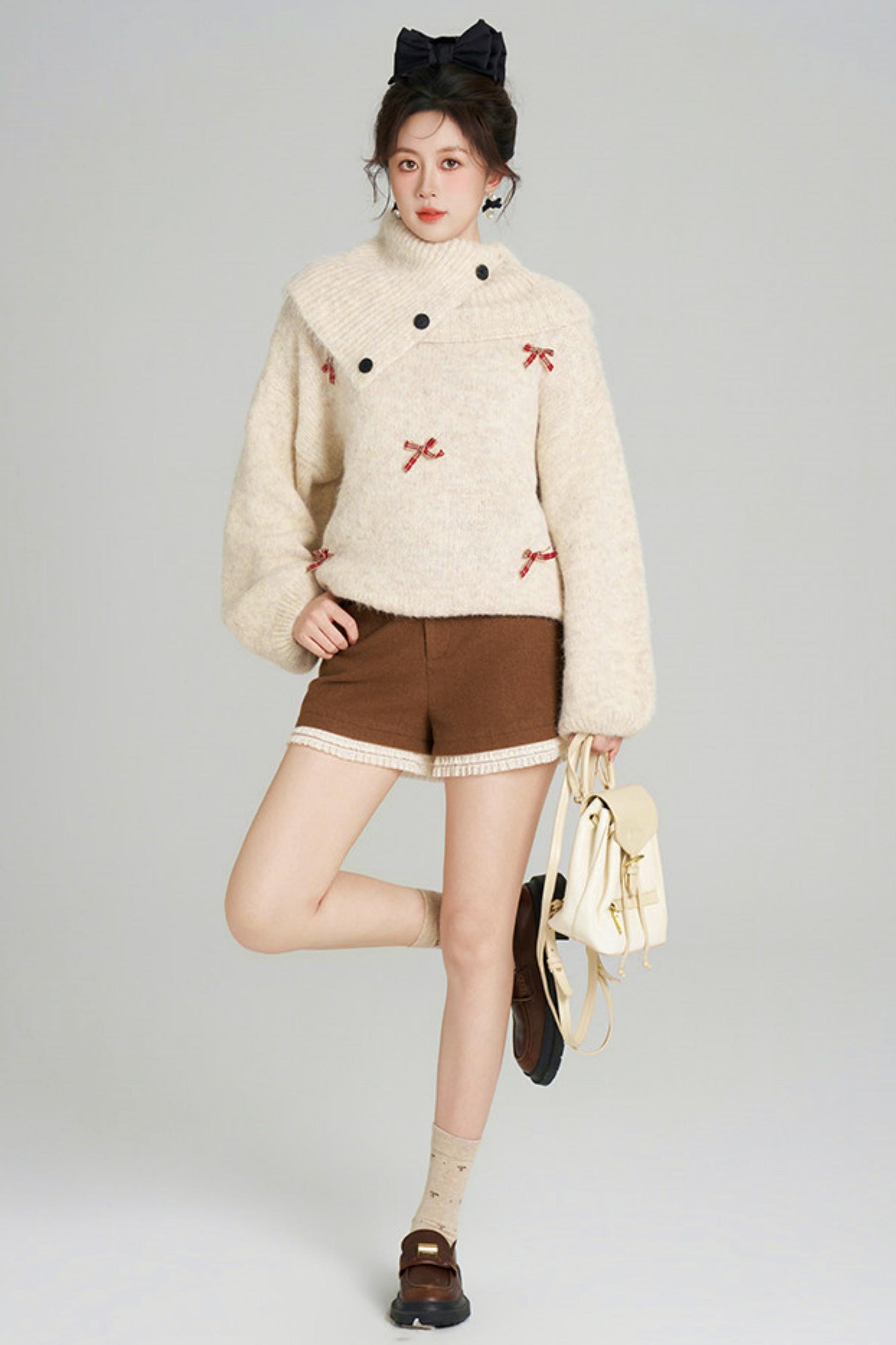 リボンフレンチニットセーター+ショートパンツ