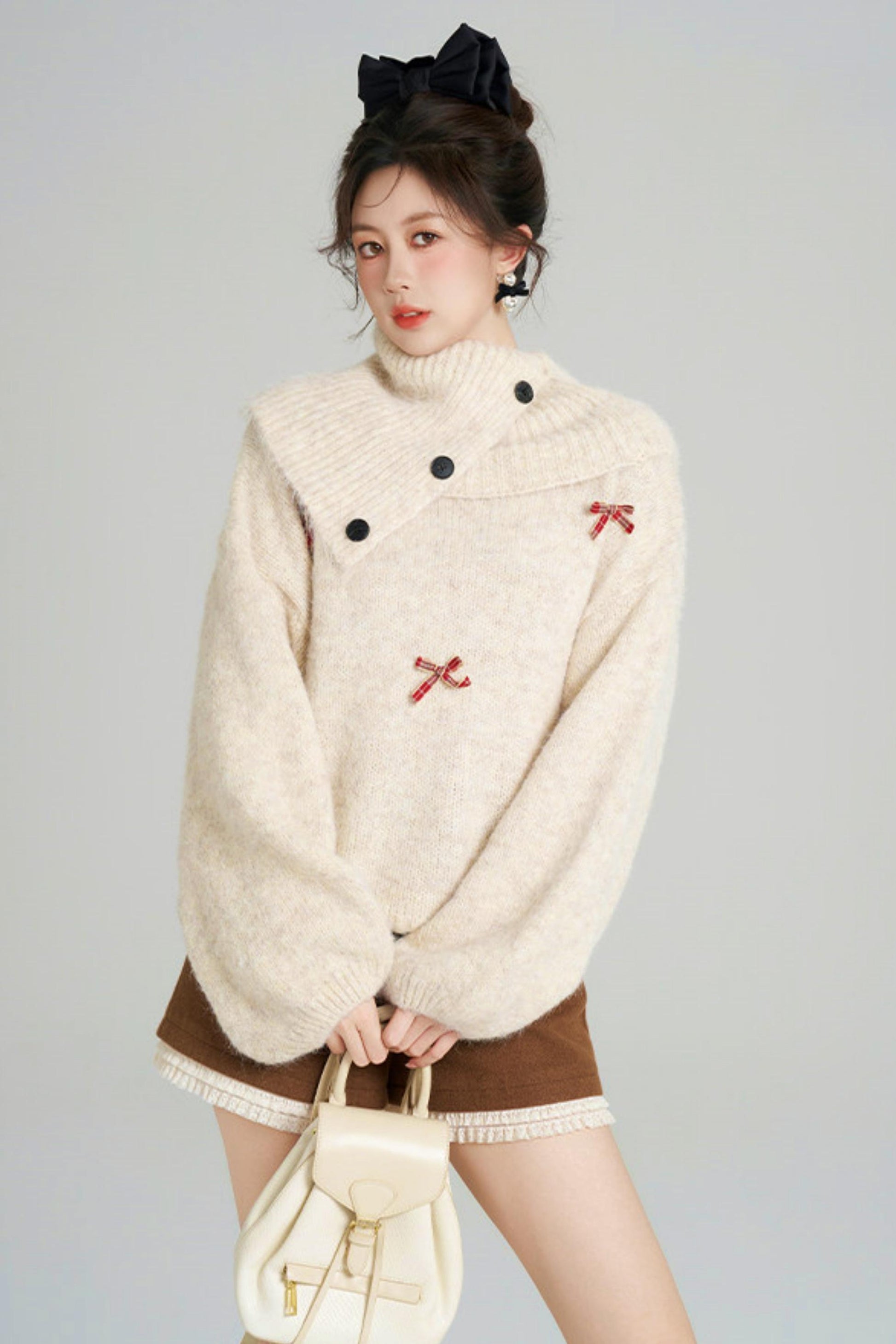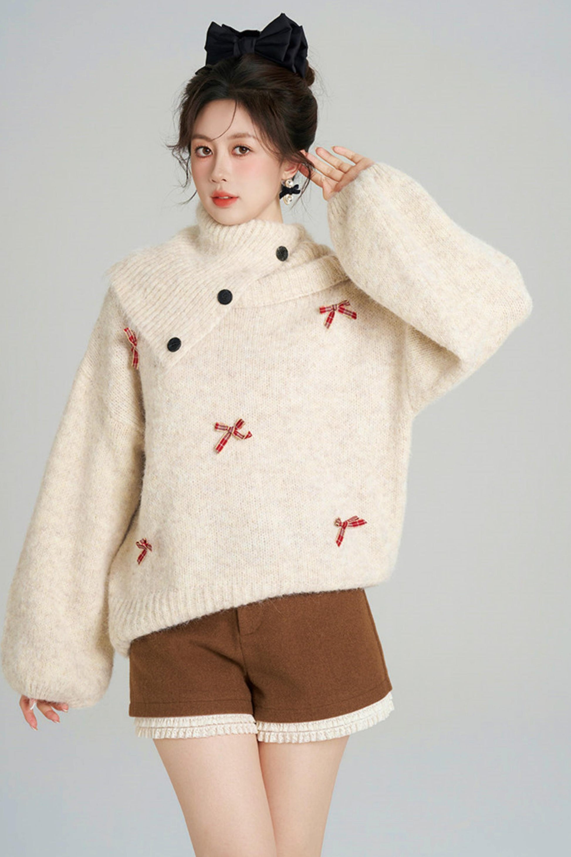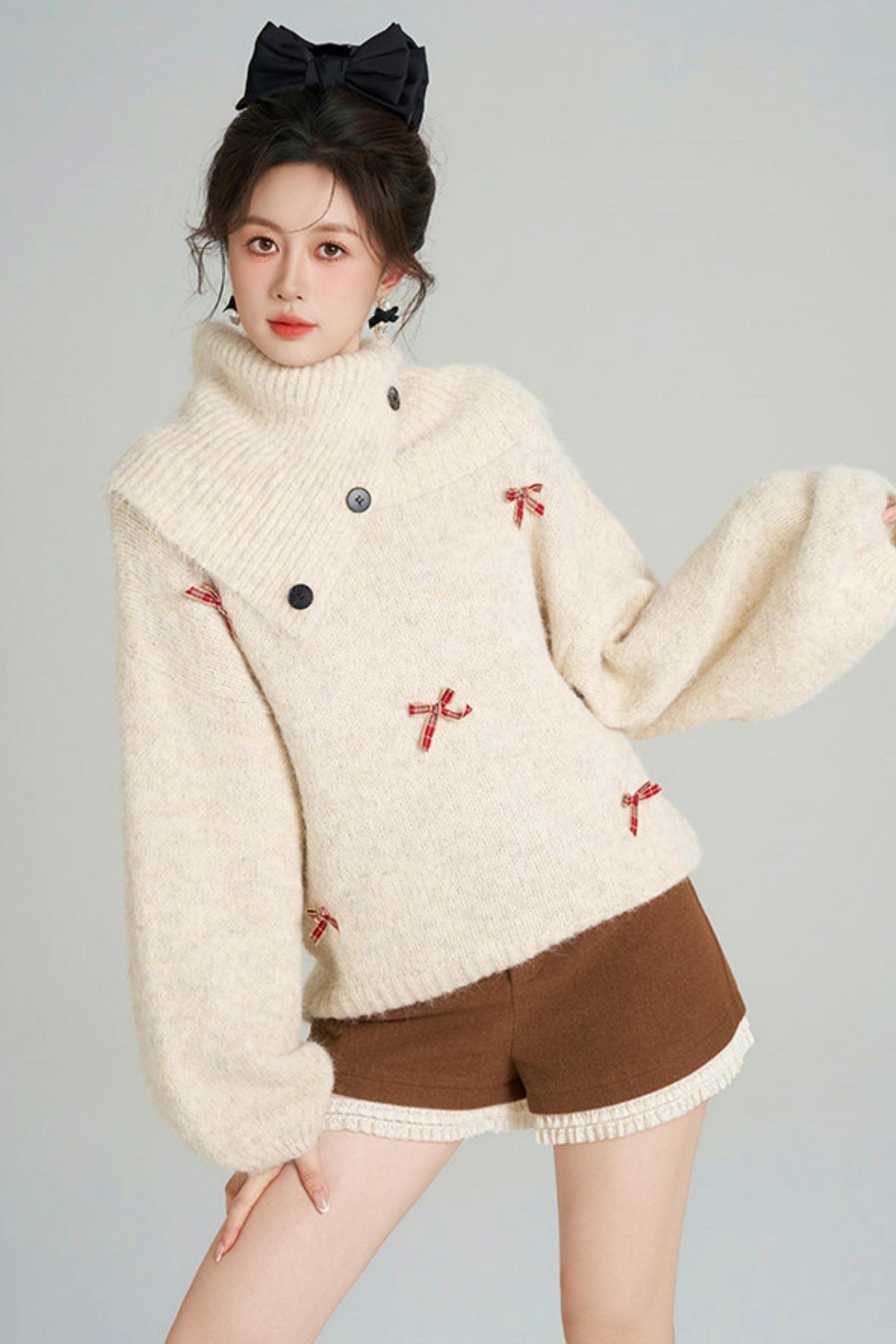 リボンフレンチニットセーター+ショートパンツ