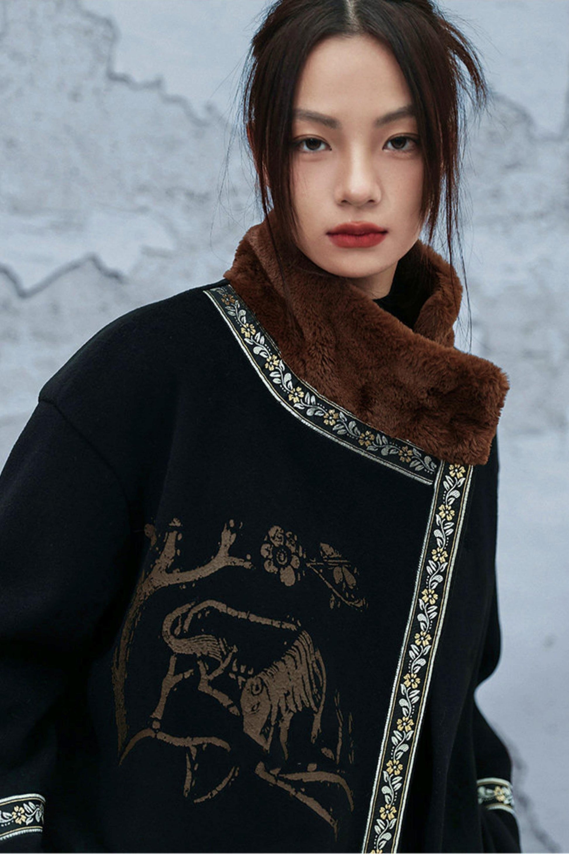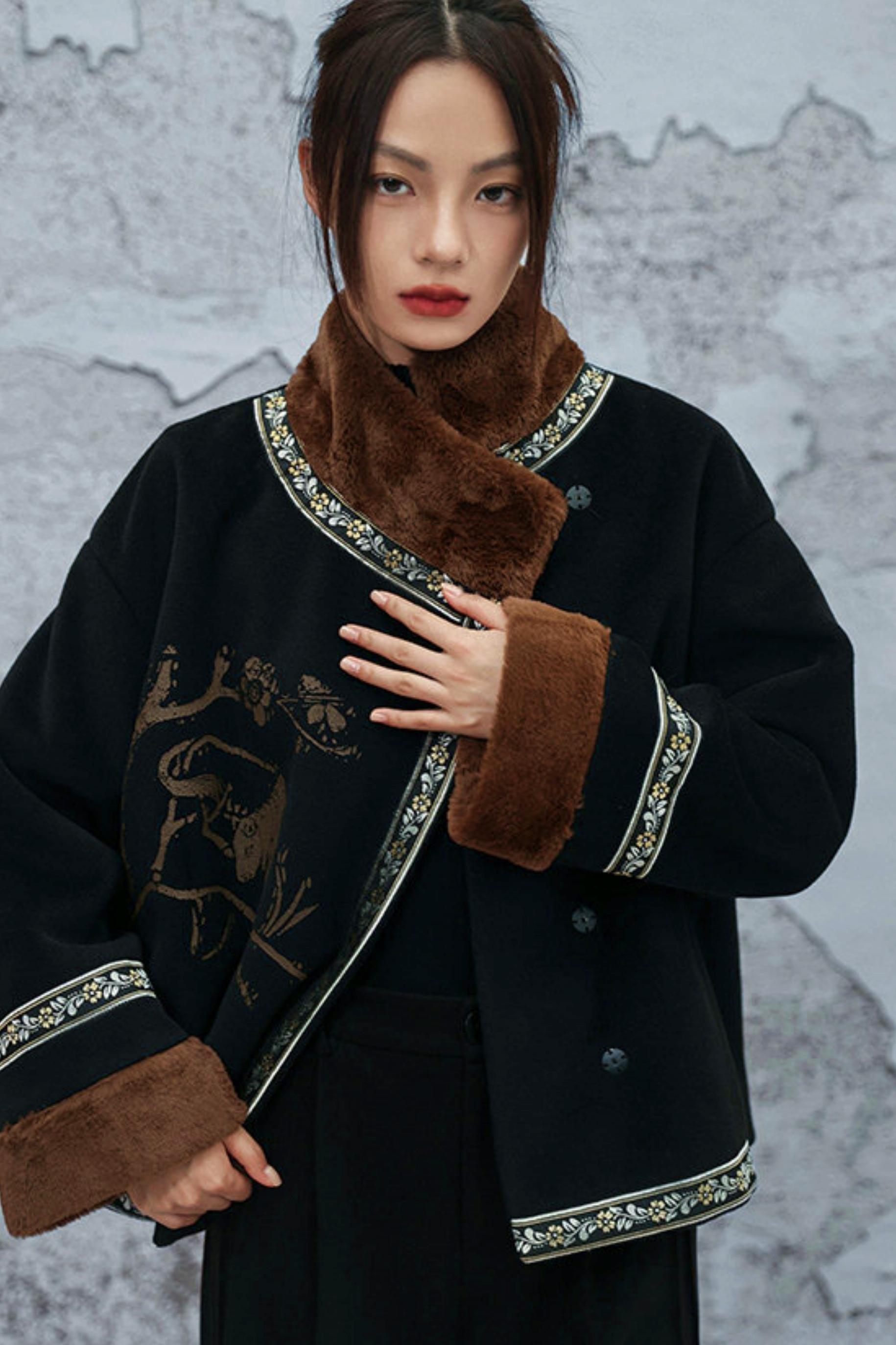 カラーブロックウールンフローラルコート