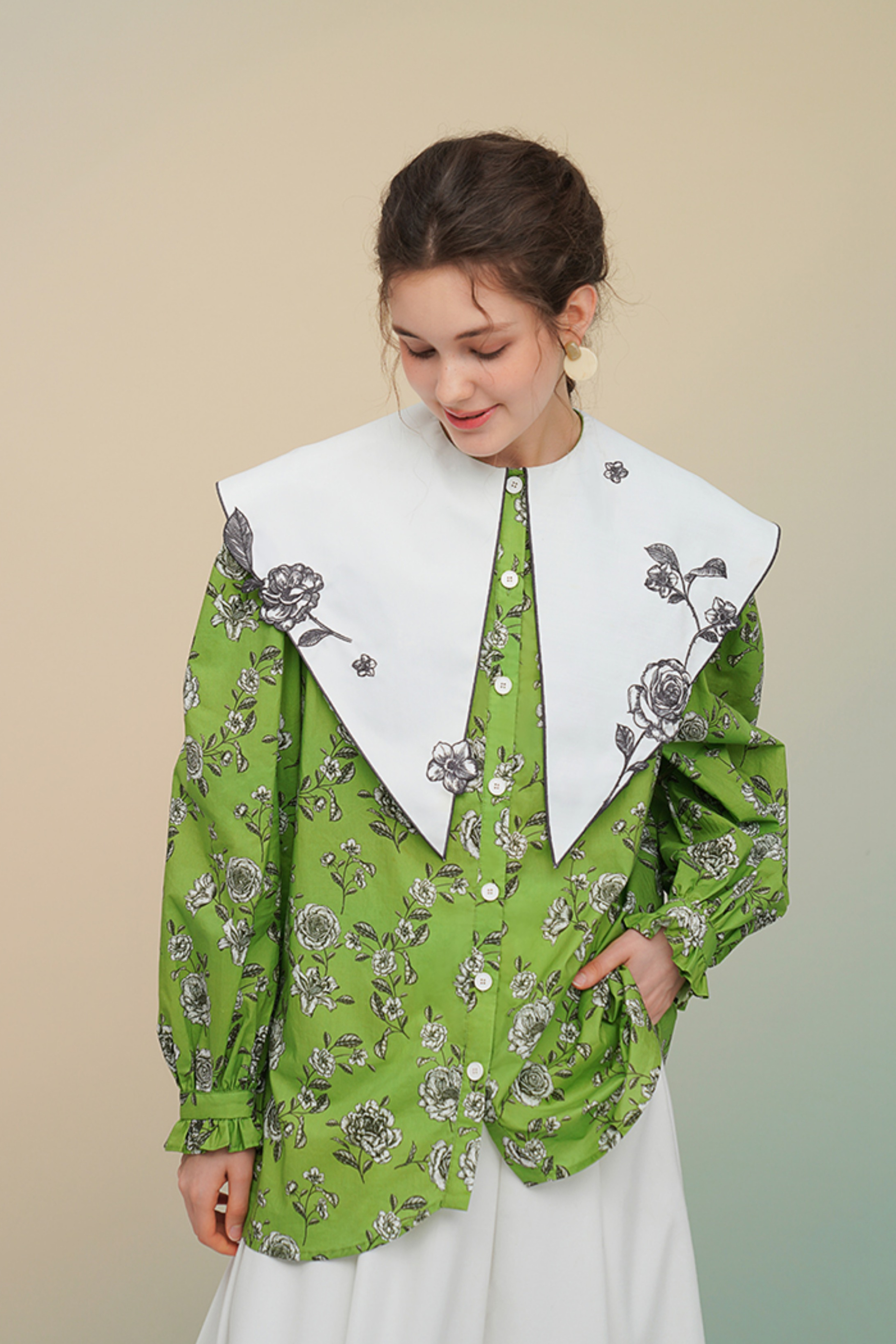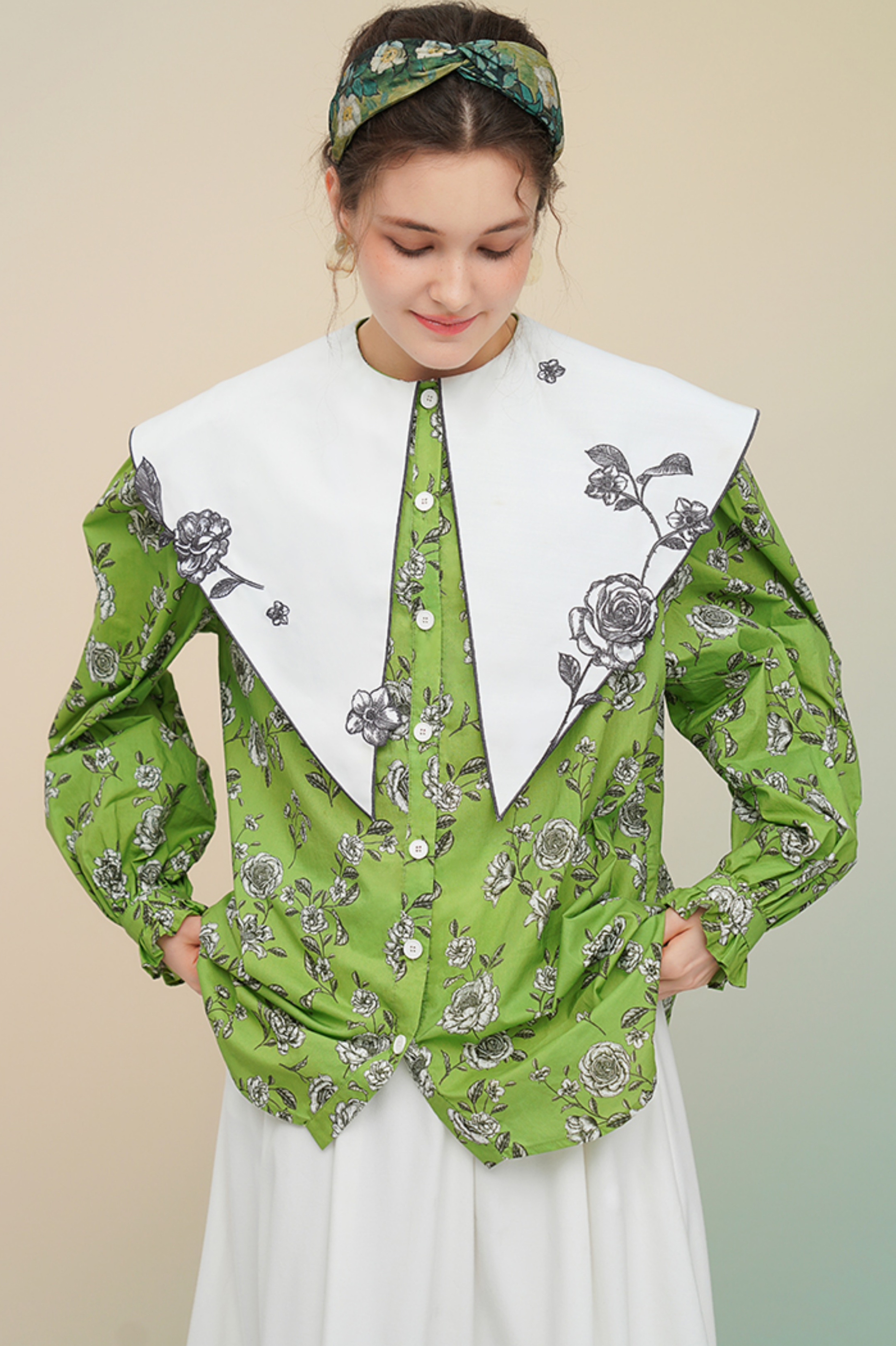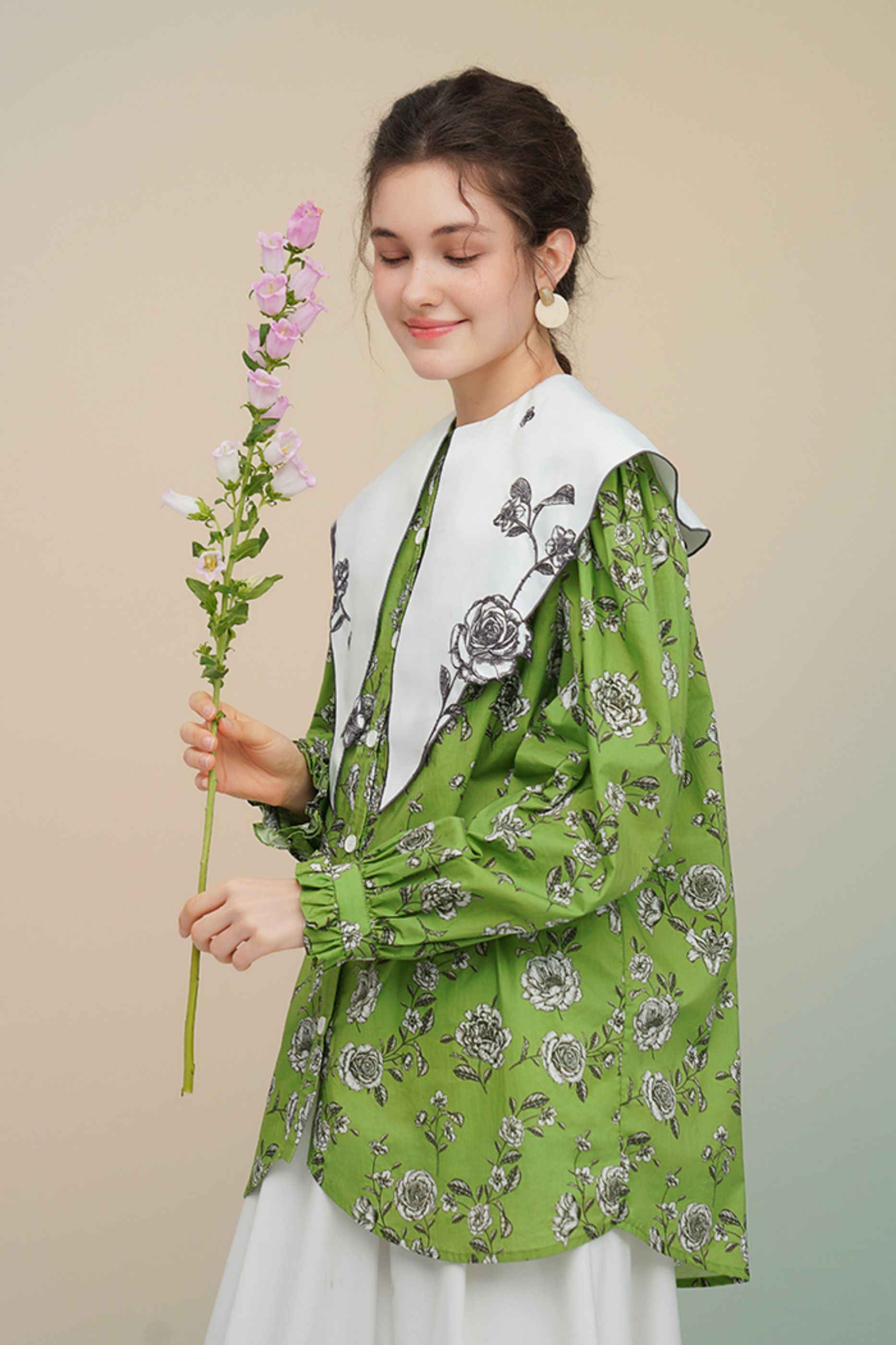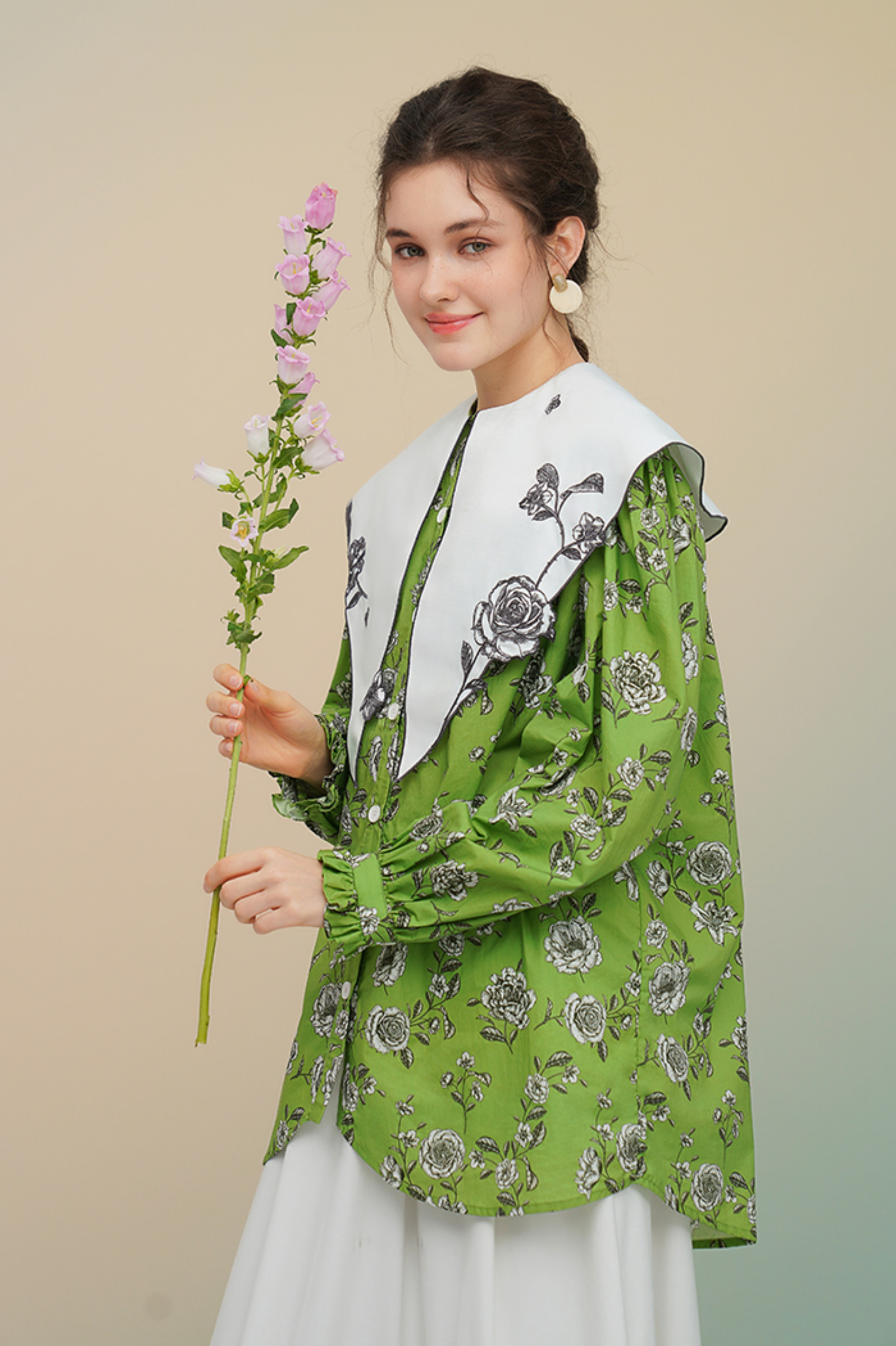 ❤グリーンローズフレンチヴィンテージプリントシャツ❤