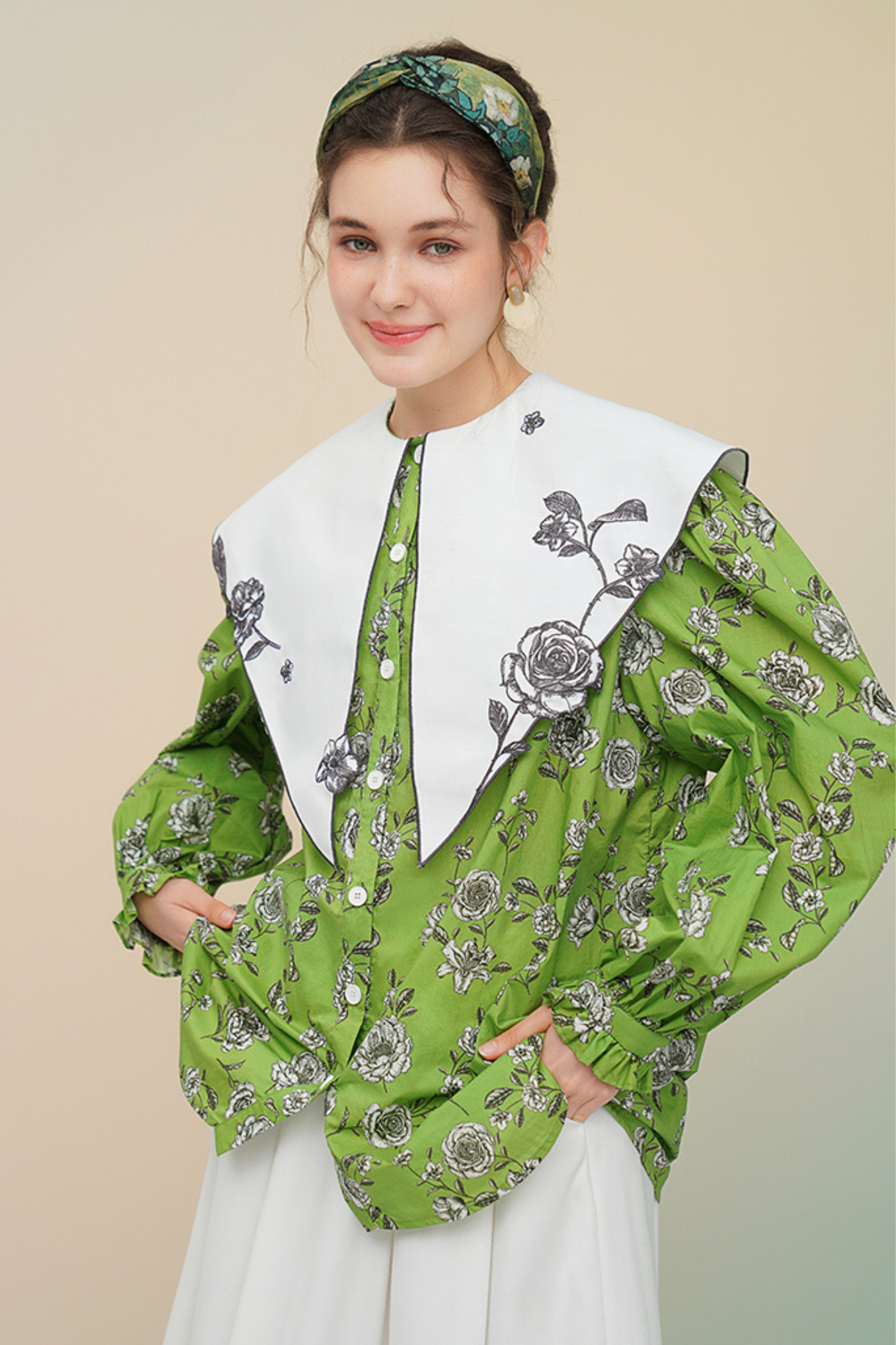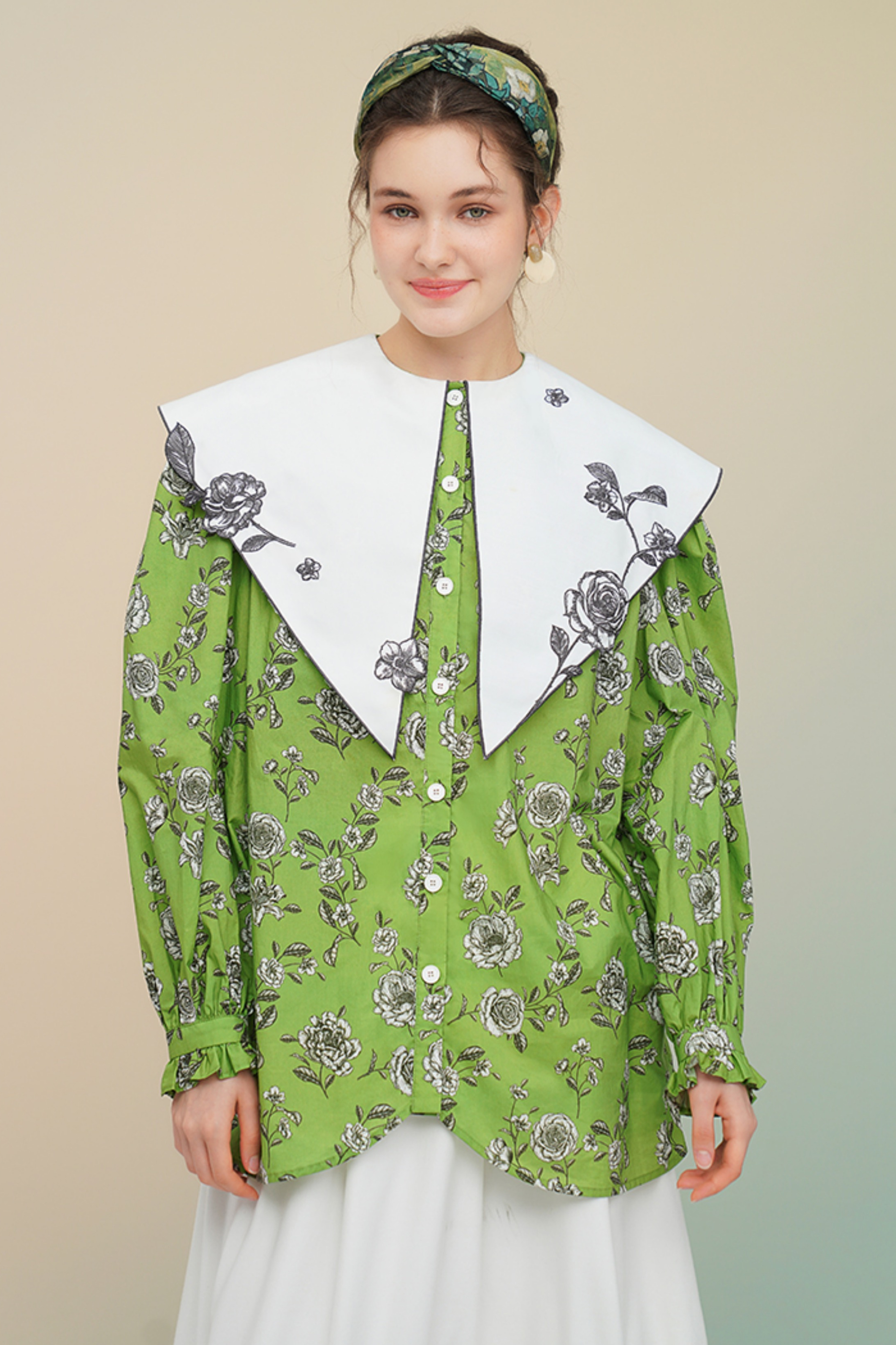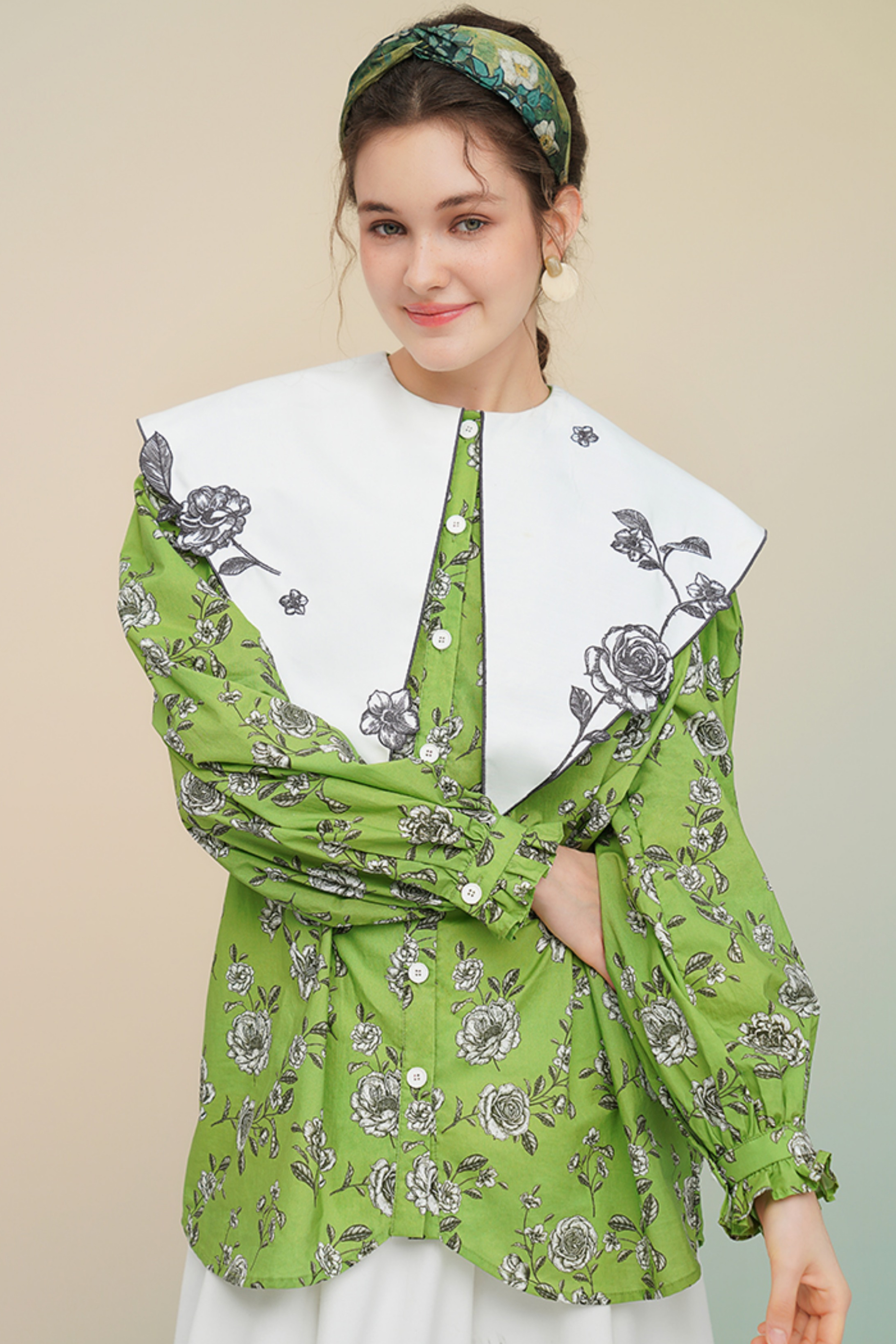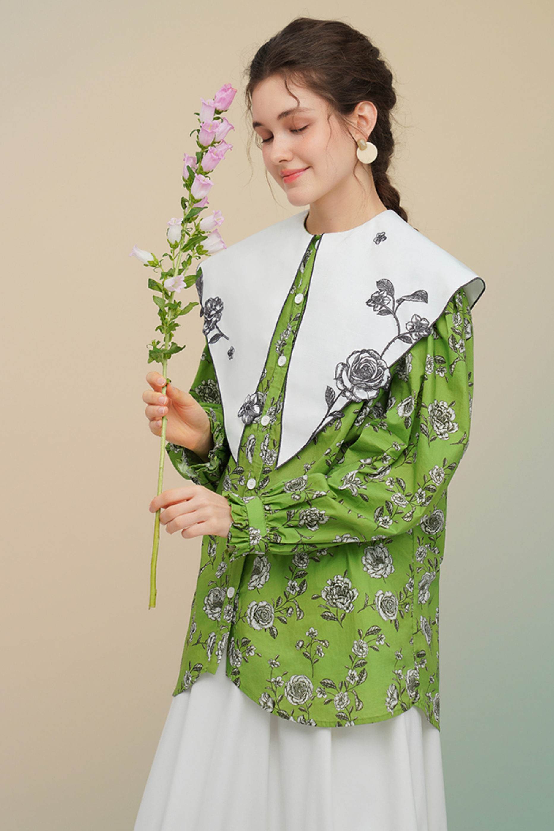 ❤グリーンローズフレンチヴィンテージプリントシャツ❤