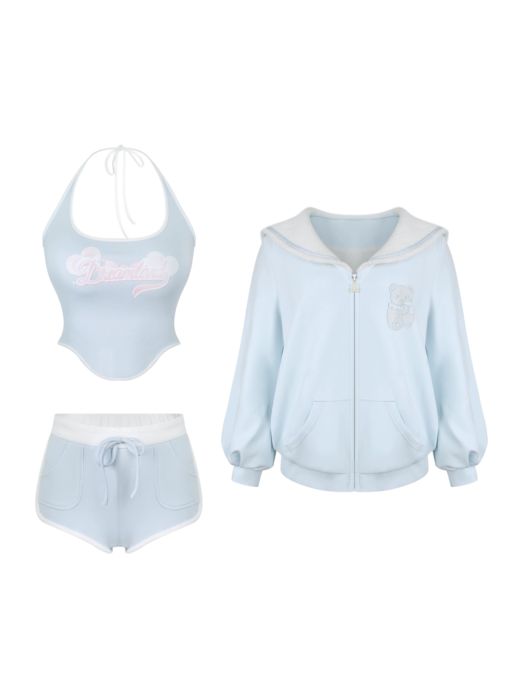ミルクブルースポーティーパーカー+ホルターネックサスペンダー + スポーツショーツ