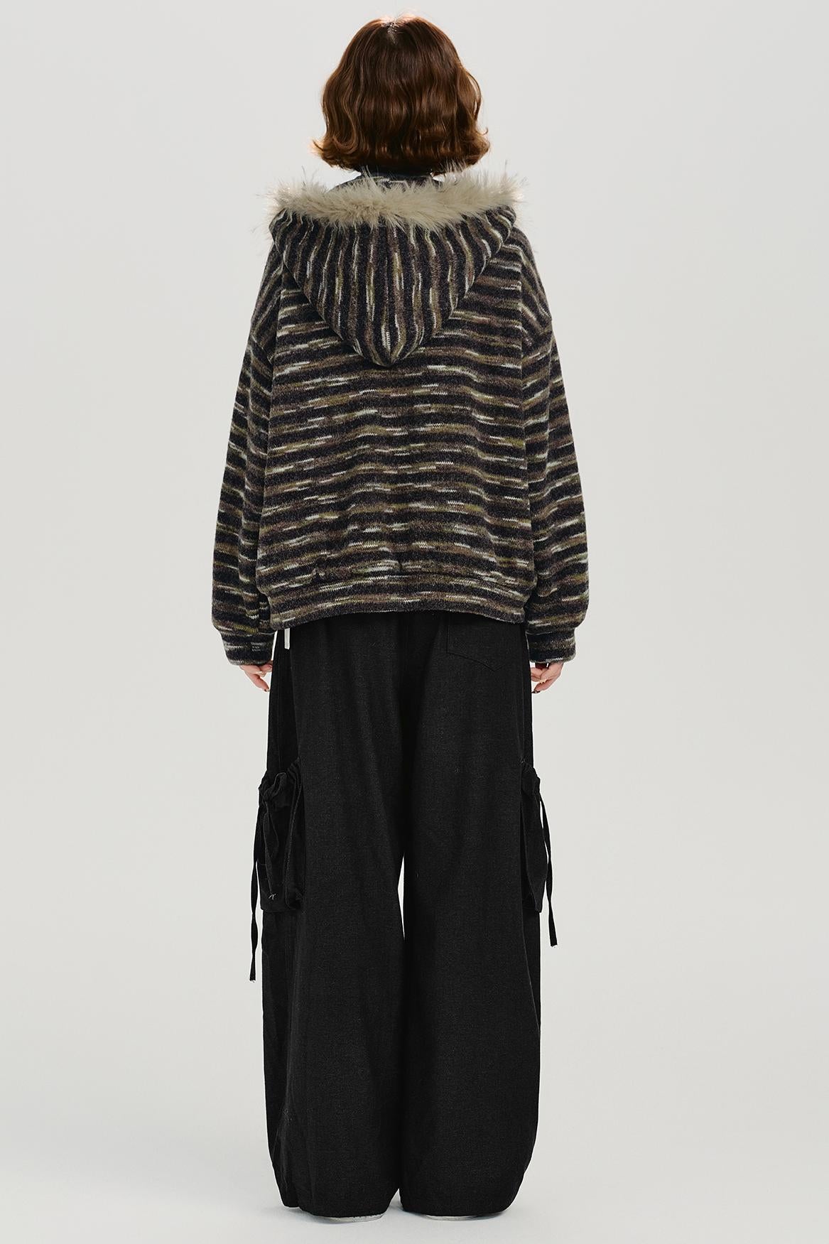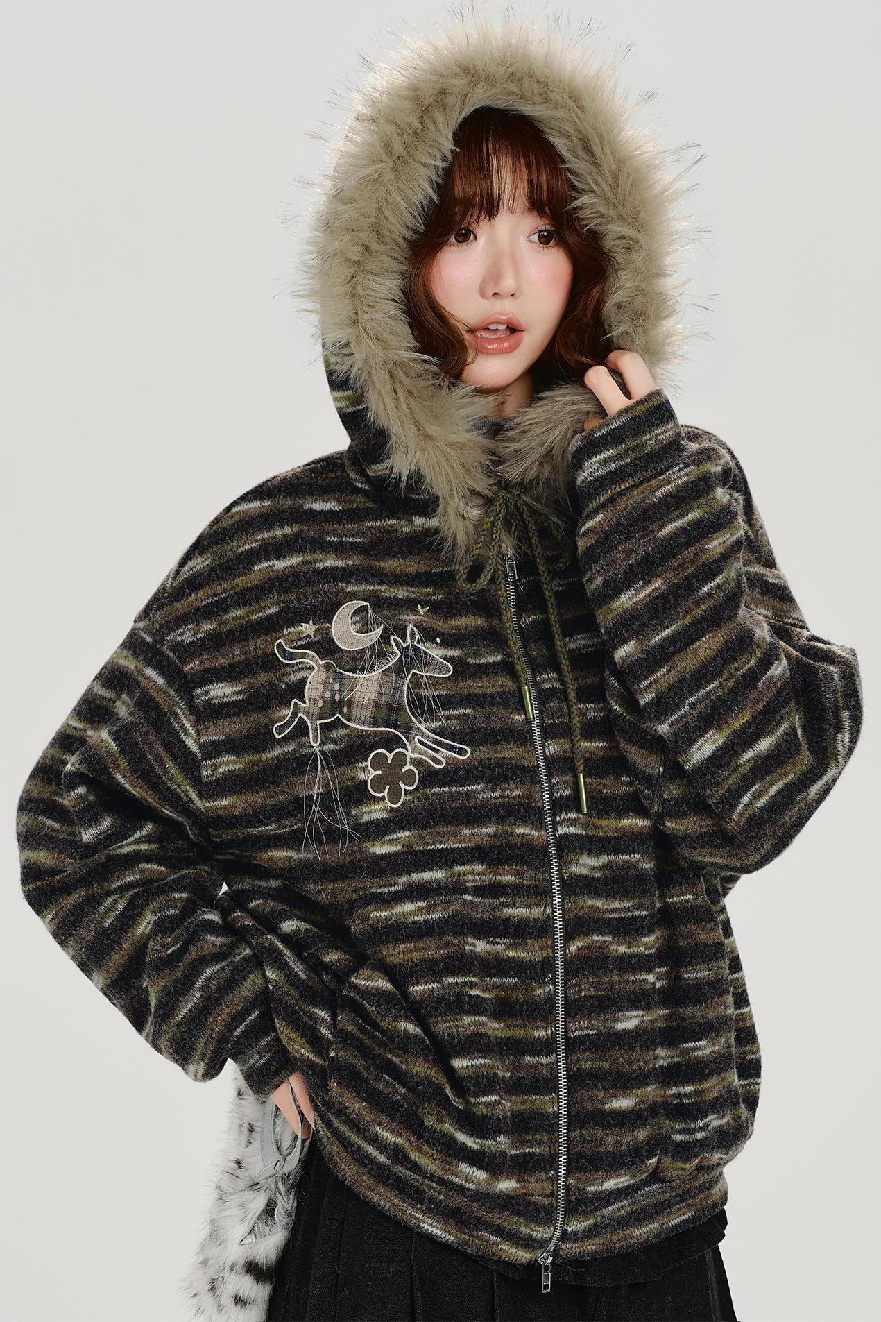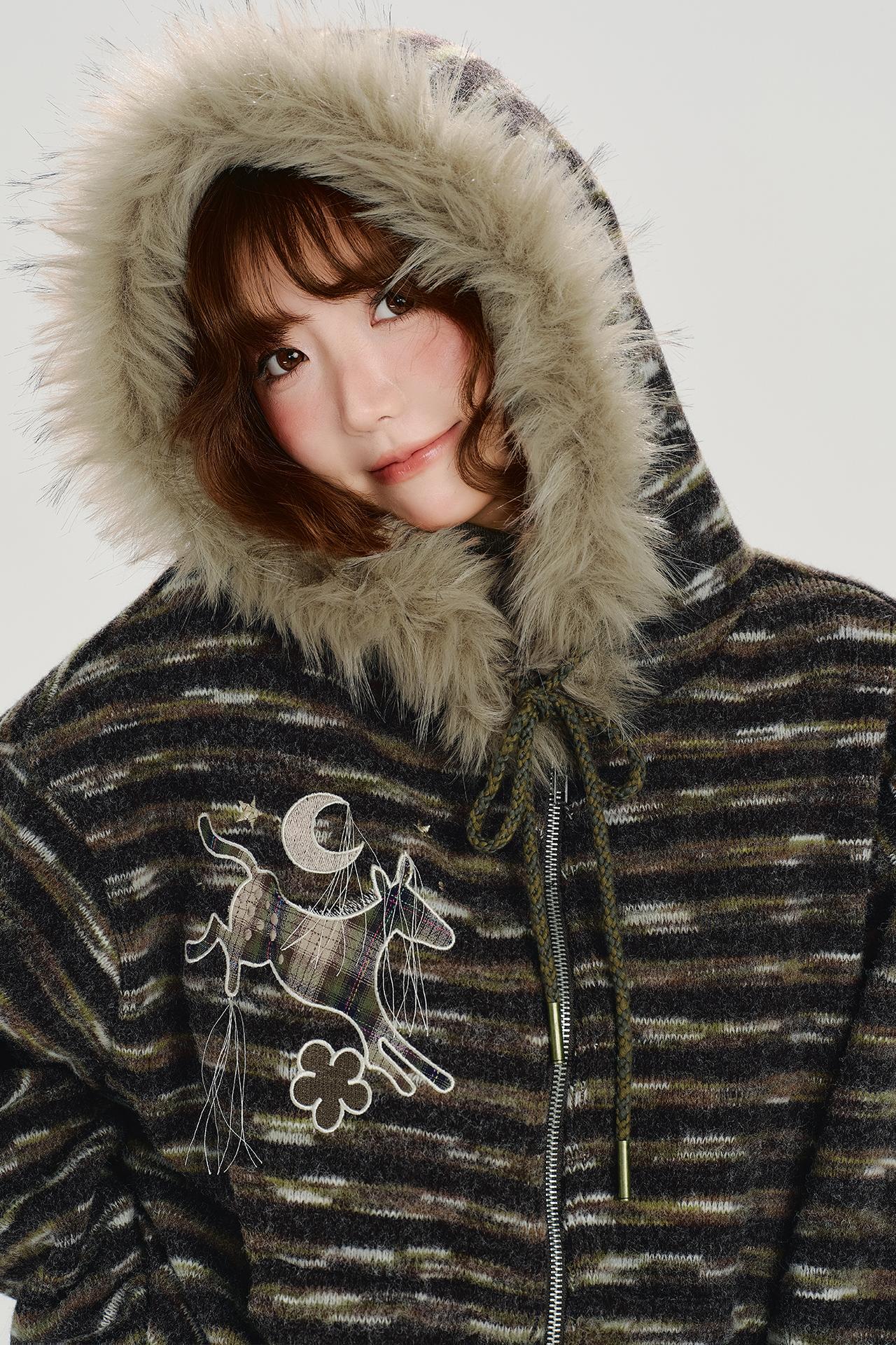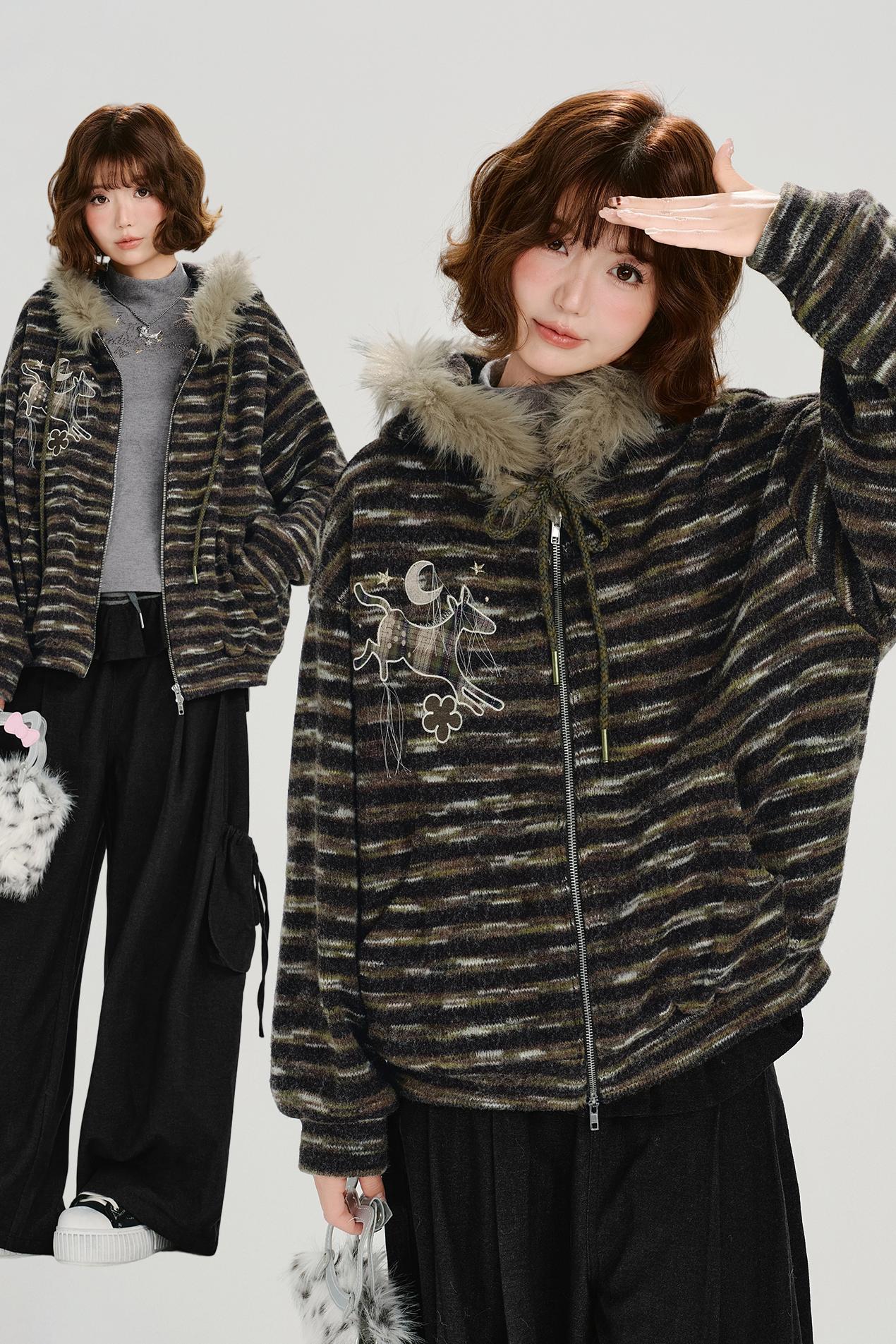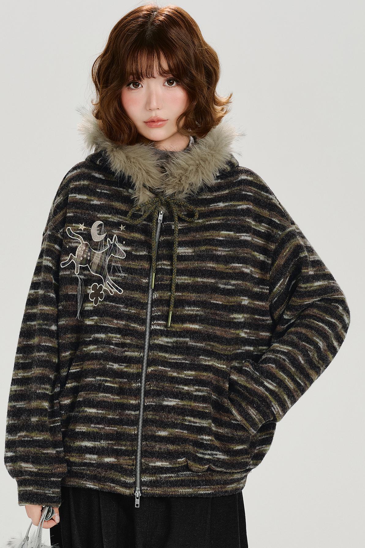 ❤エンブロイダーファーカラーストライプドジャケット❤