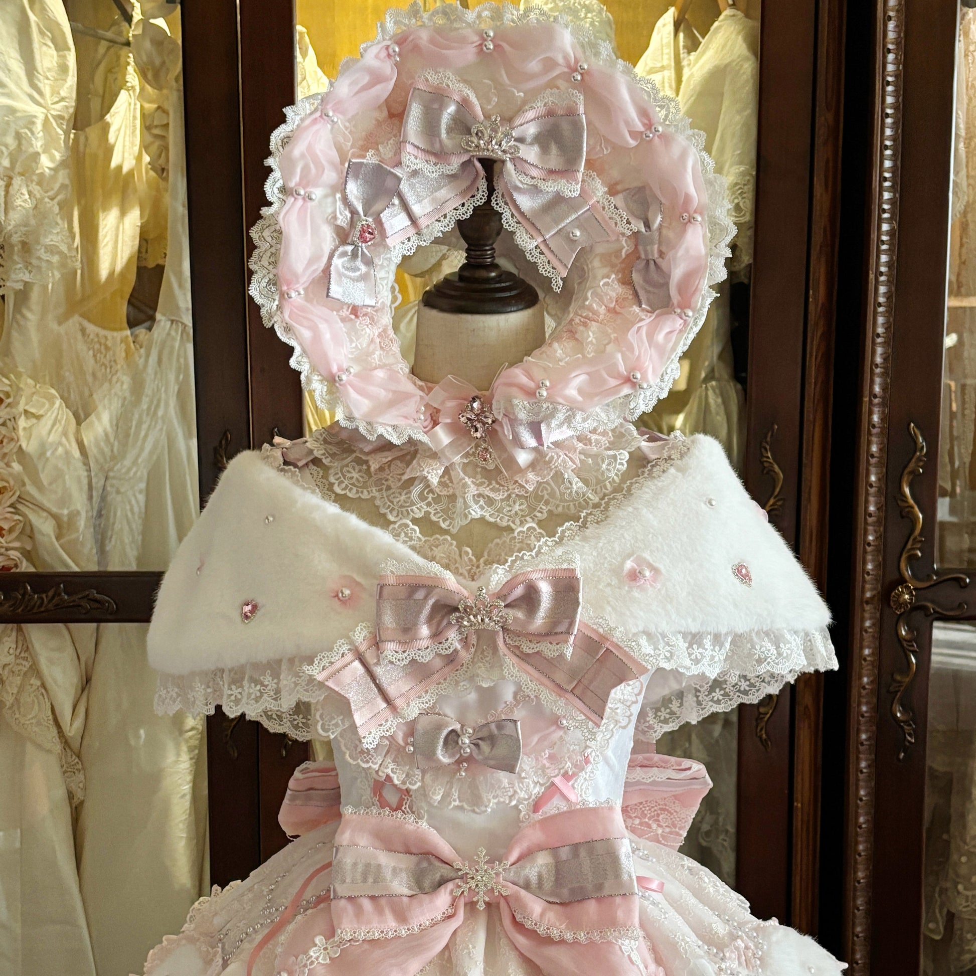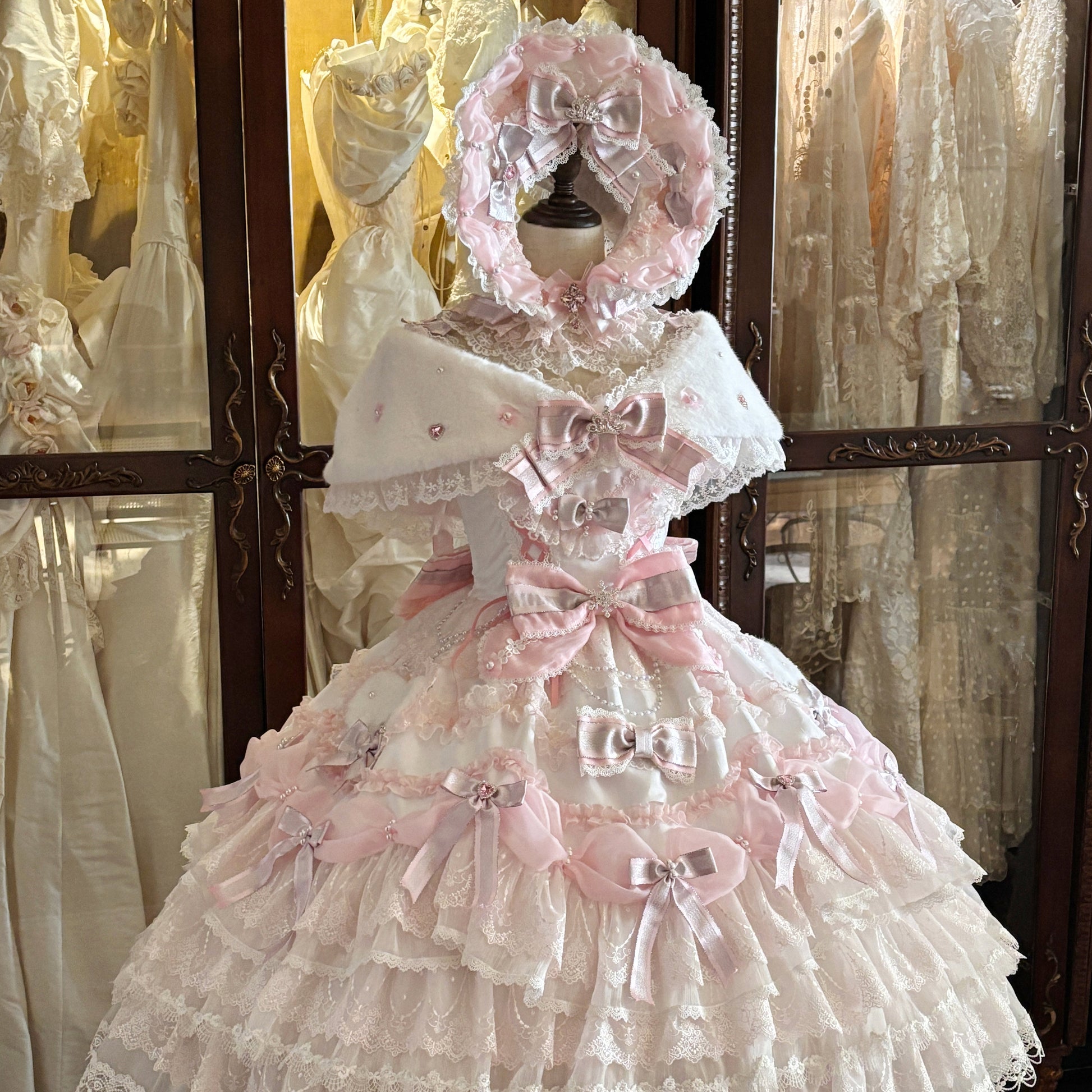 コンプリートセット内容【ドレス本体+バックリボントレーン+ジュエルファーショール+レースチョーカー+ボンネット】