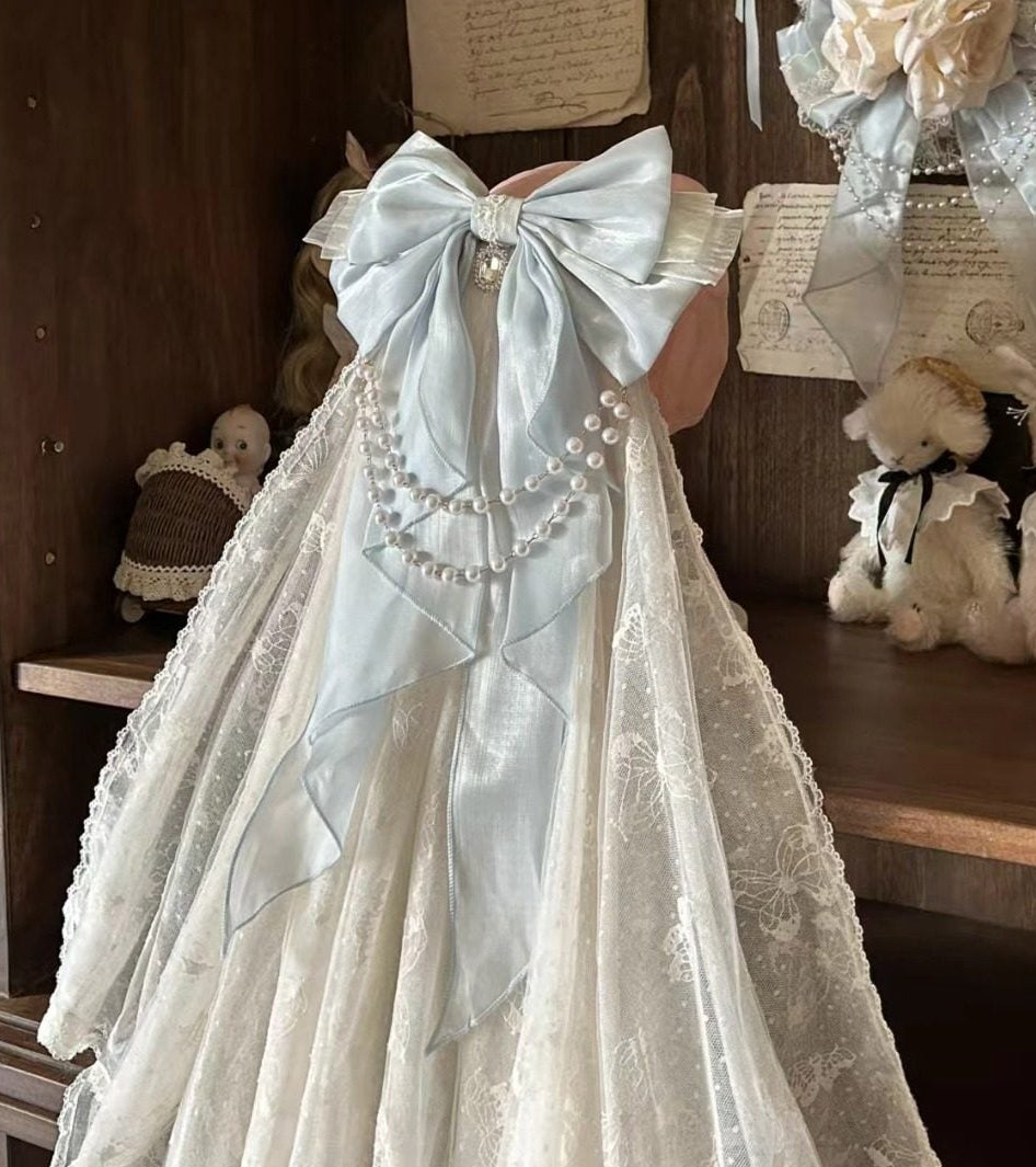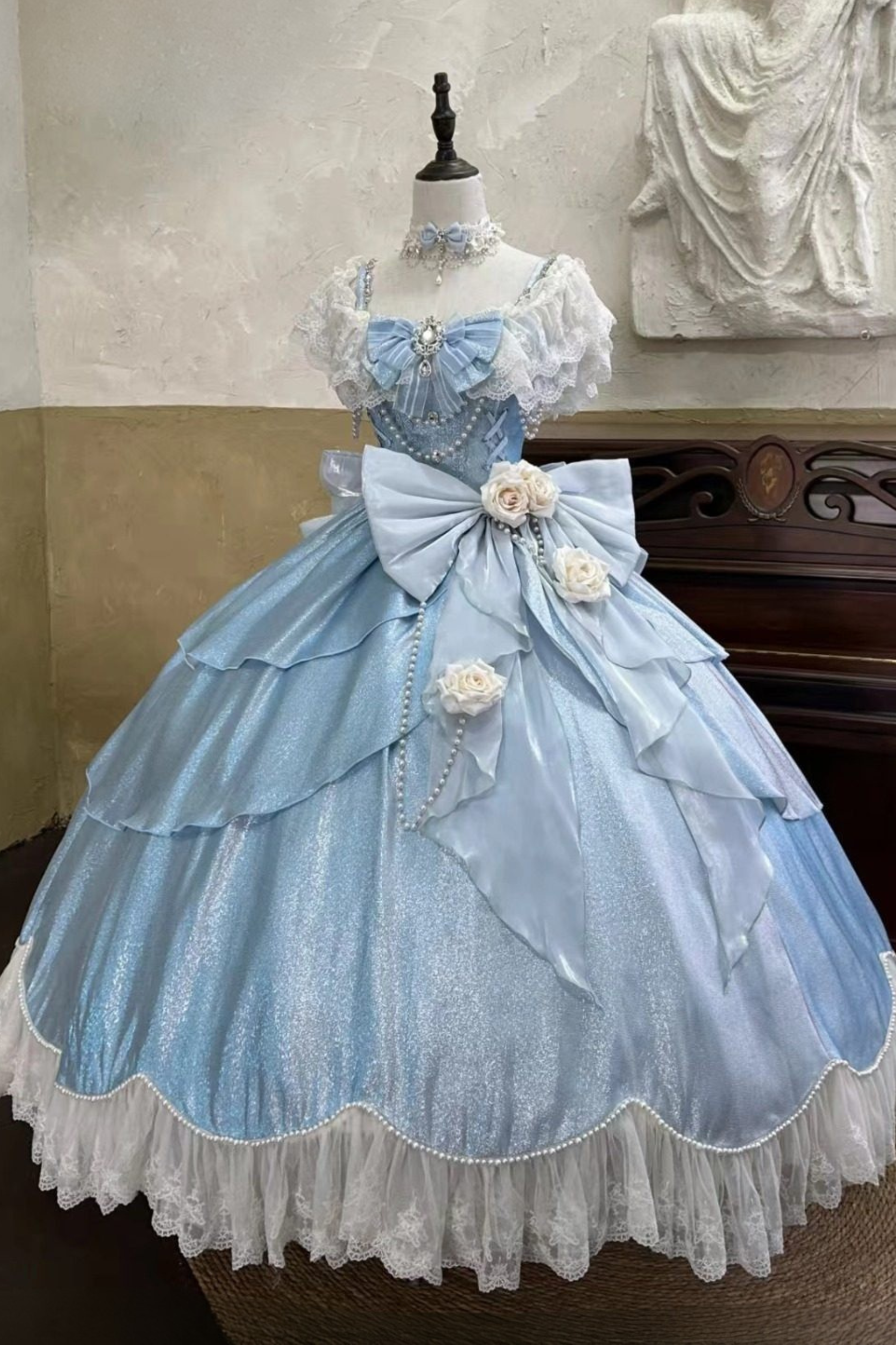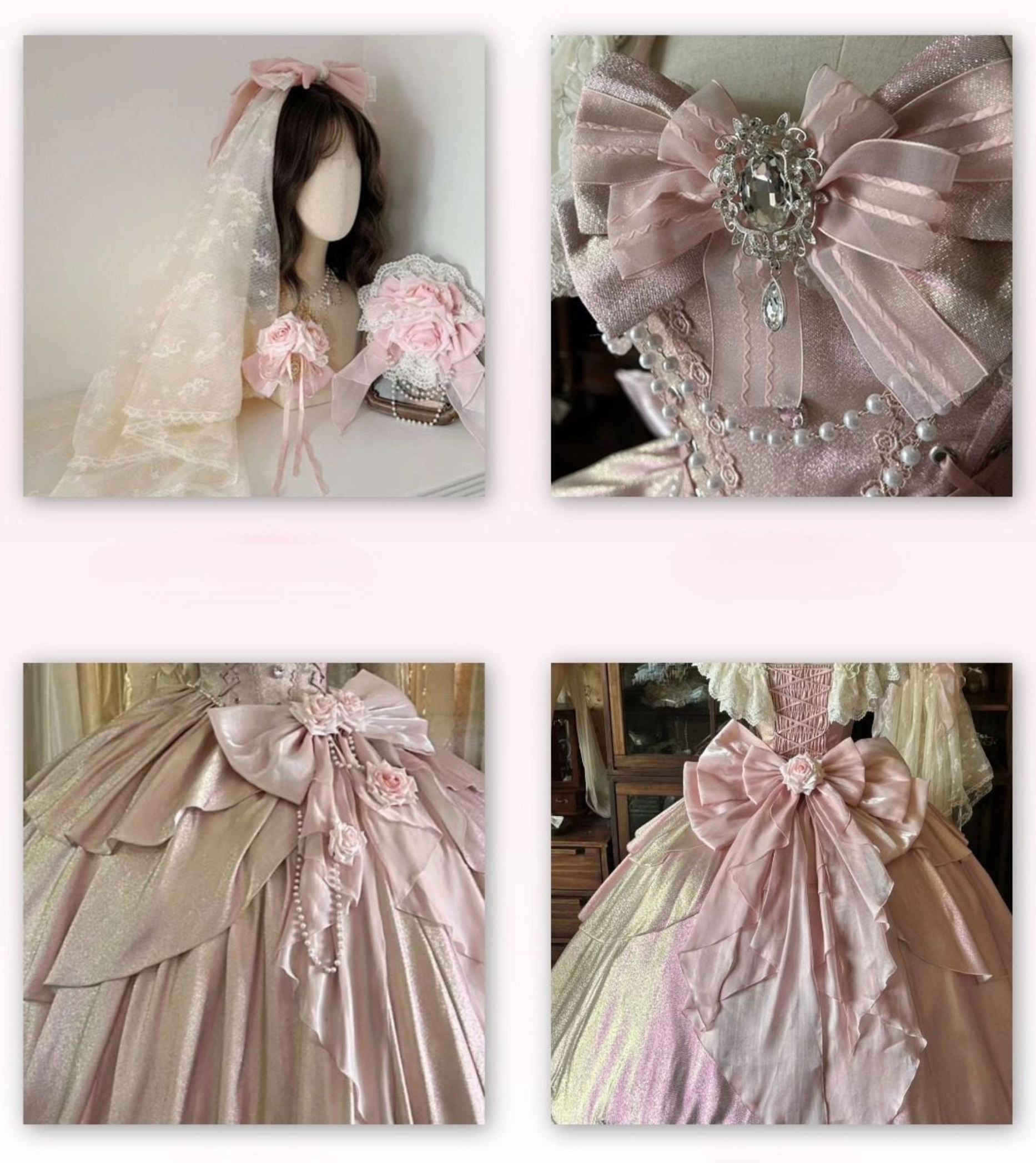 コンプリートセット内容【フリルショルダーサスペンダードレス本体+バックローズリボントレーン+ウエストサイドのローズリボントレーン+胸元のジュエルリボン+胸元のパールチェーン+ヘッドドレスリボンベール+フラワーサークルアクセサリー+チョーカーネックレス】
