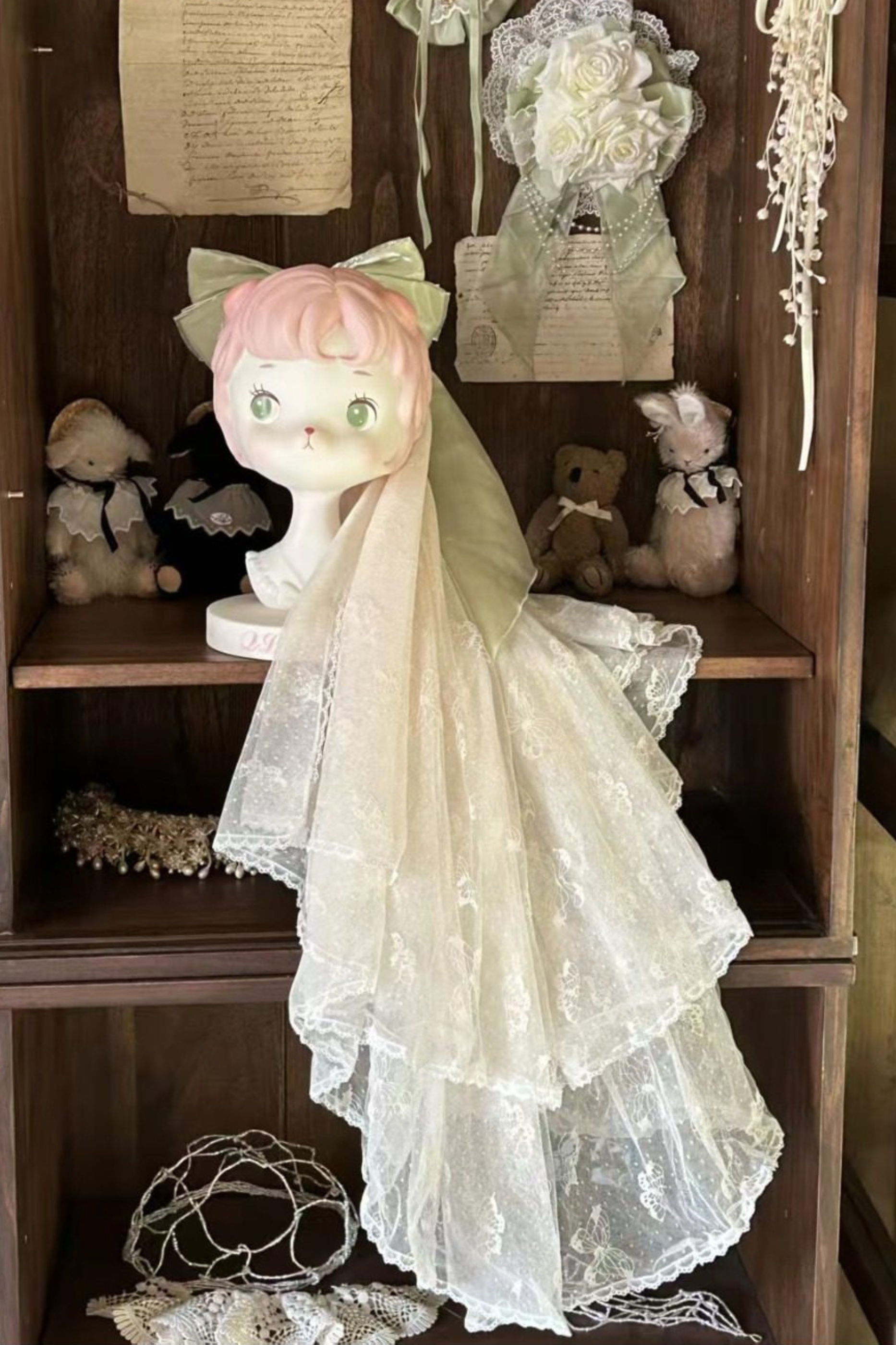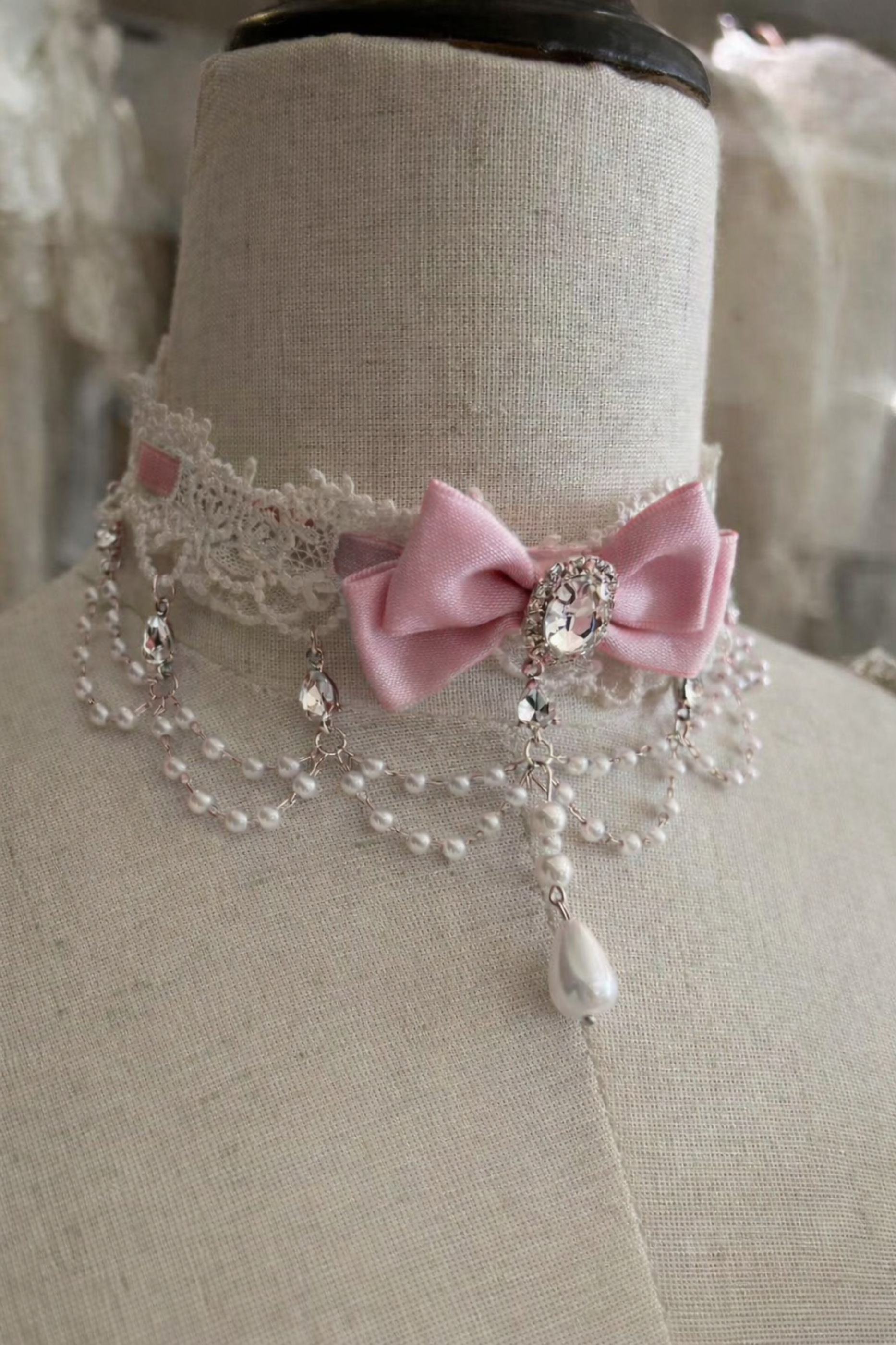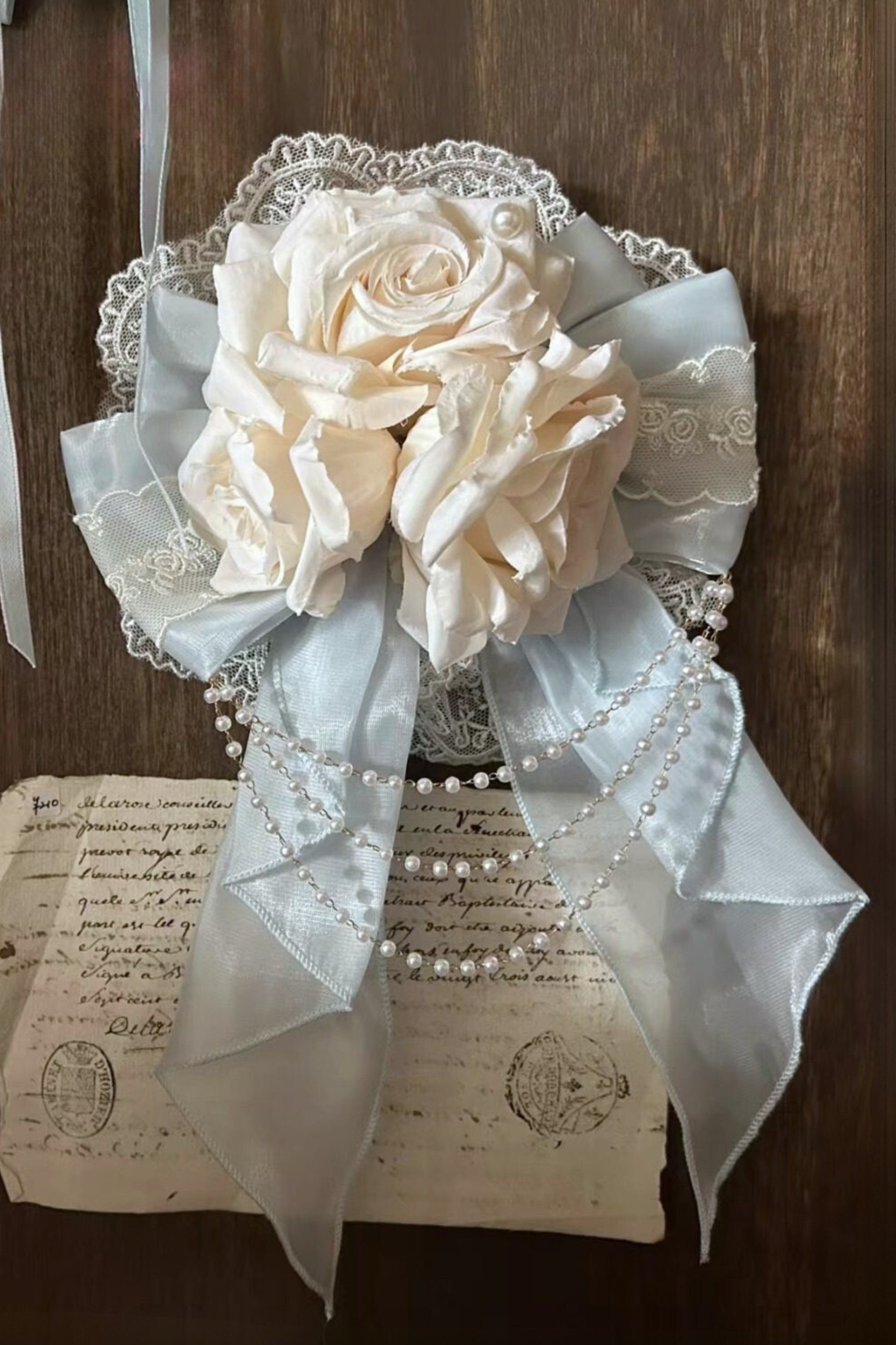 コンプリートセット内容【フリルショルダーサスペンダードレス本体+バックローズリボントレーン+ウエストサイドのローズリボントレーン+胸元のジュエルリボン+胸元のパールチェーン+ヘッドドレスリボンベール+フラワーサークルアクセサリー+チョーカーネックレス】