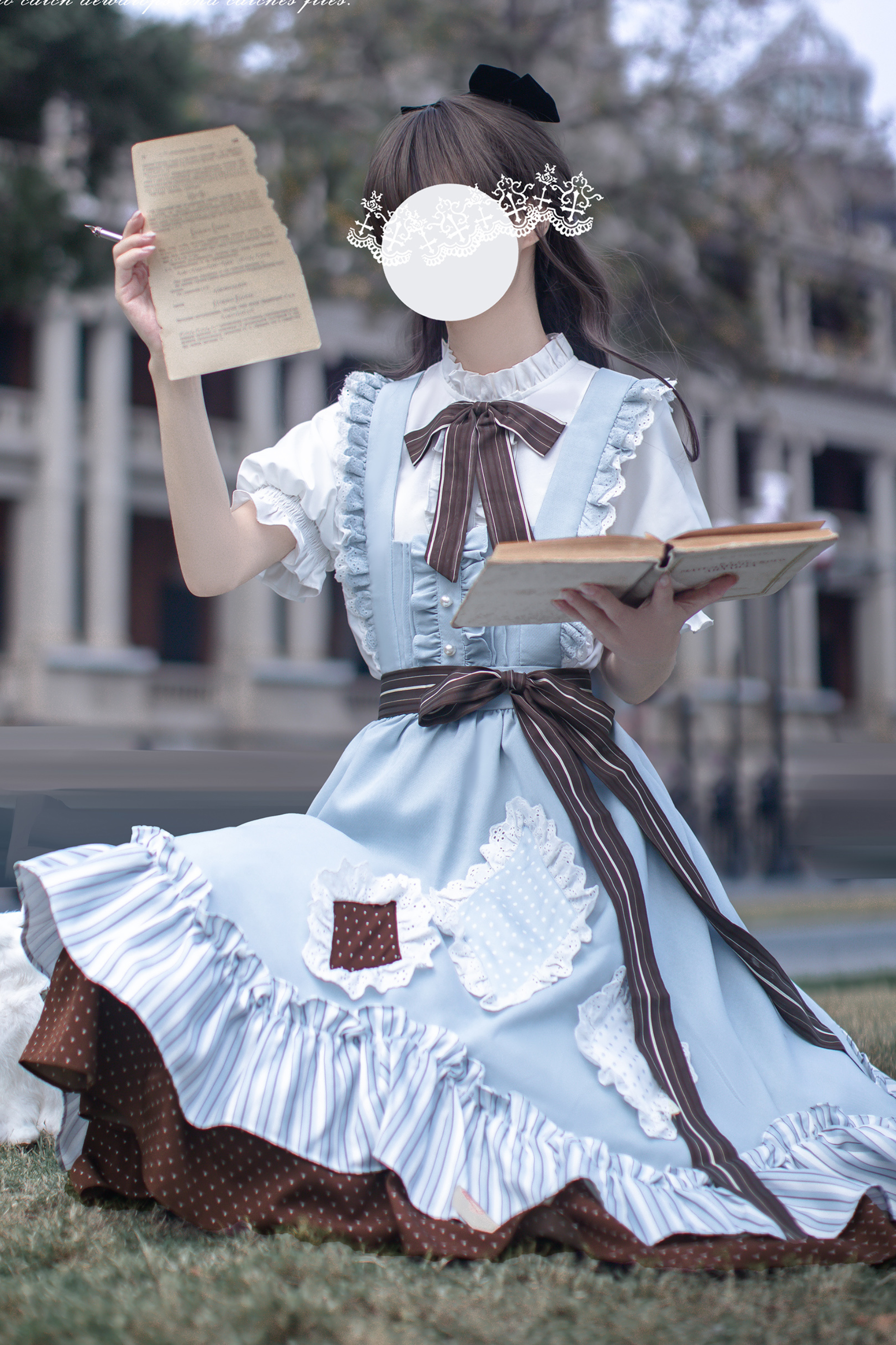 【予約商品】レトロアリス風サスペンダースカート+シャツ+リボンネクタイ+ブローチ+ヘアクリップ