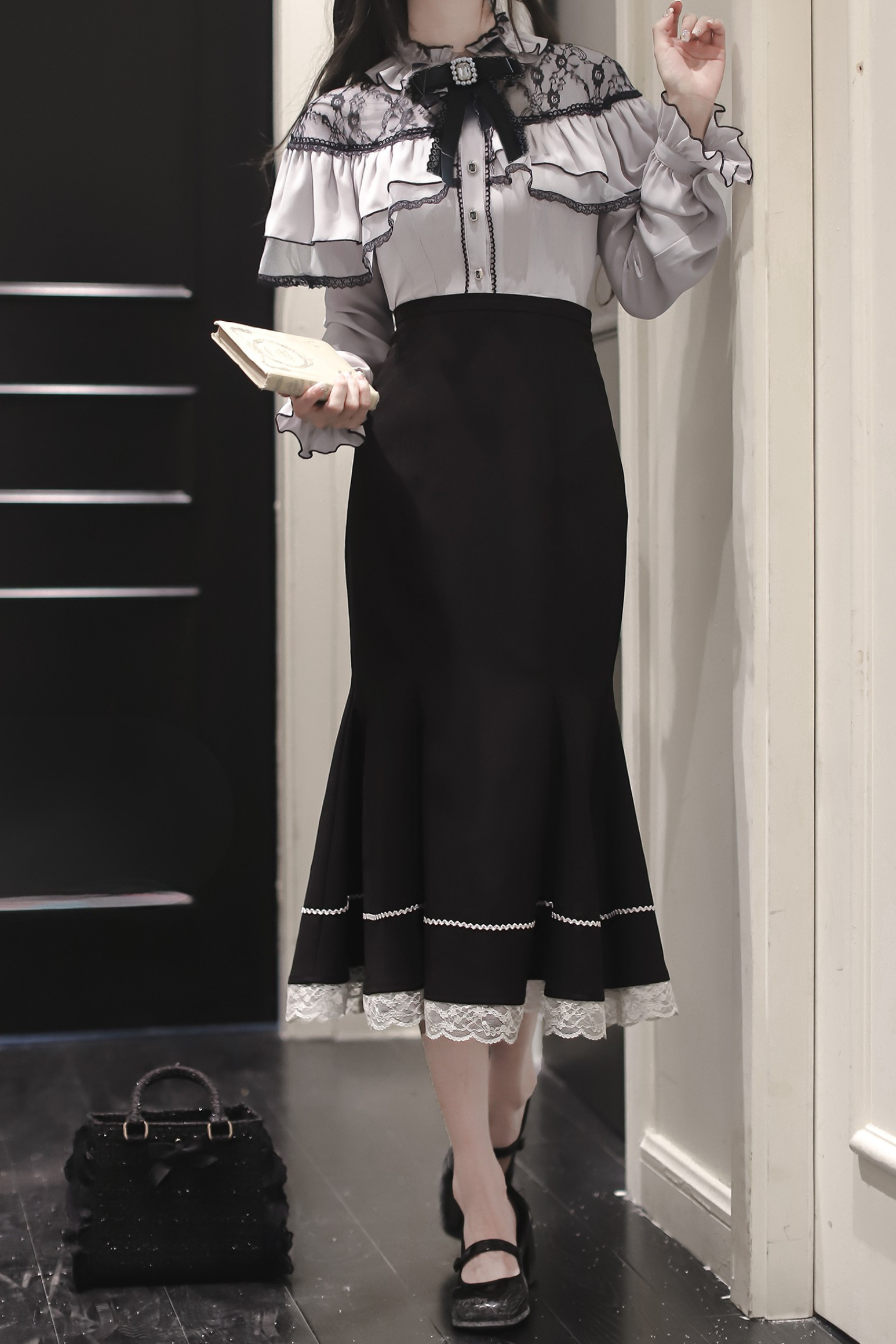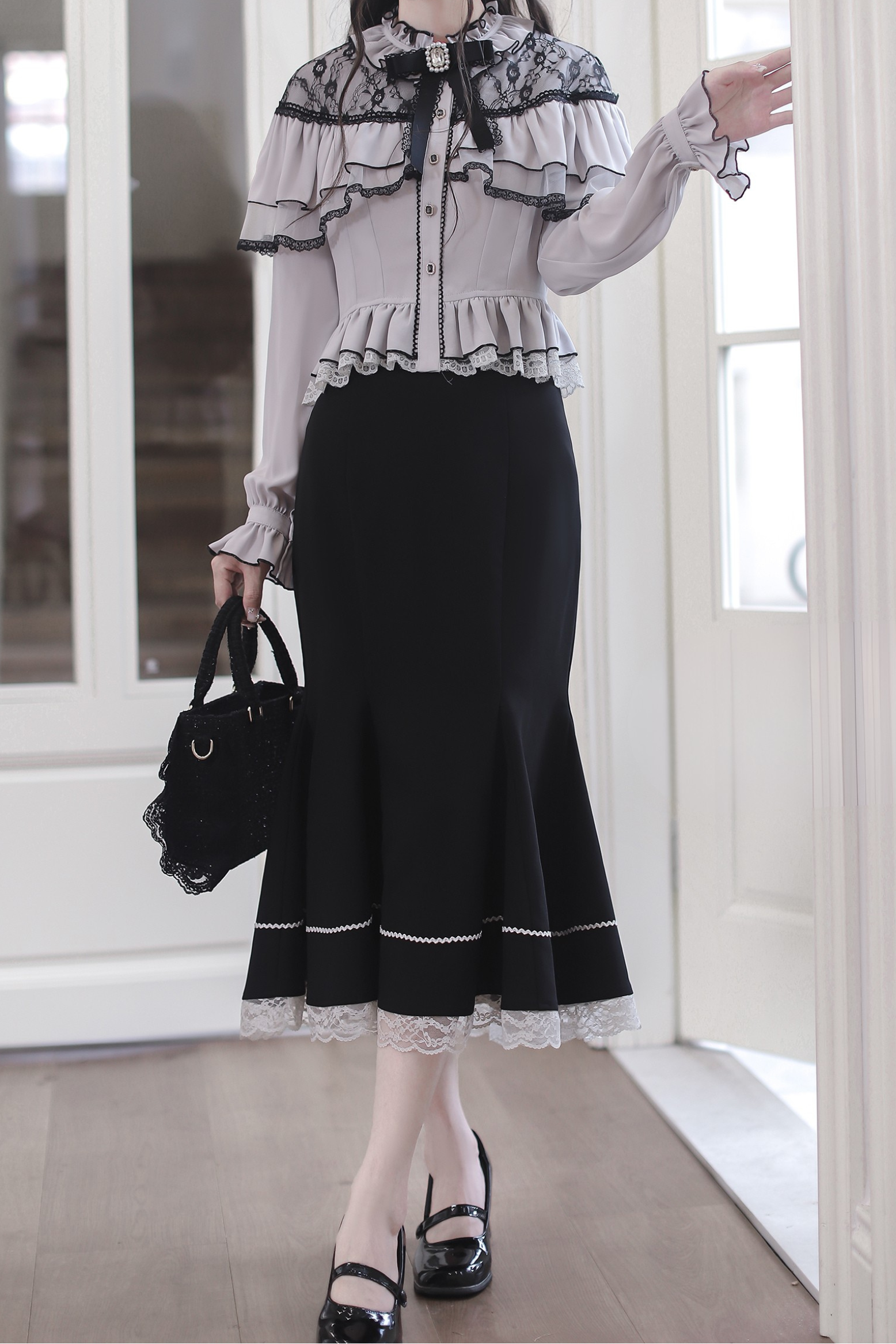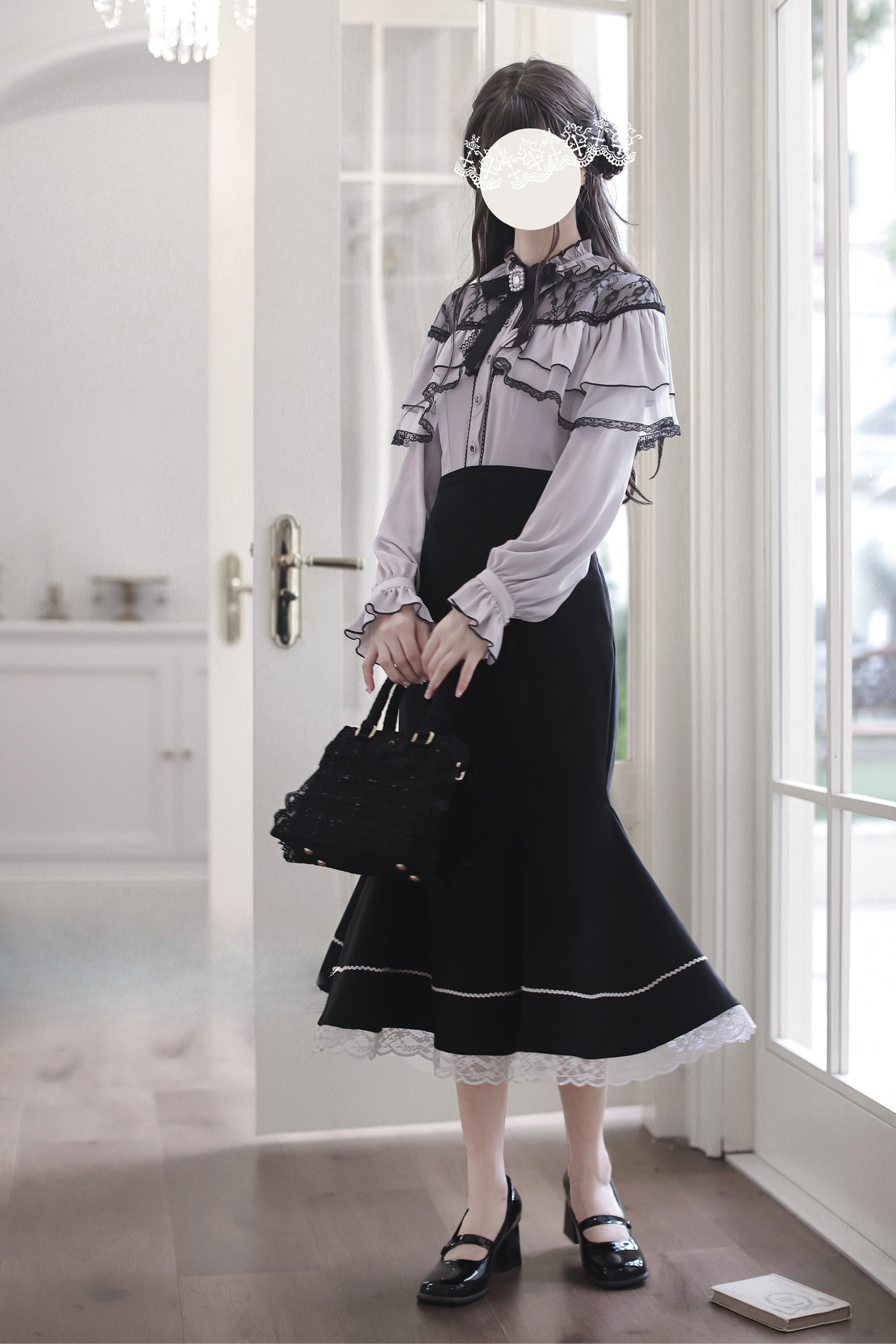 シフォンレースシャツ+フィッシュテールスカート+リボン