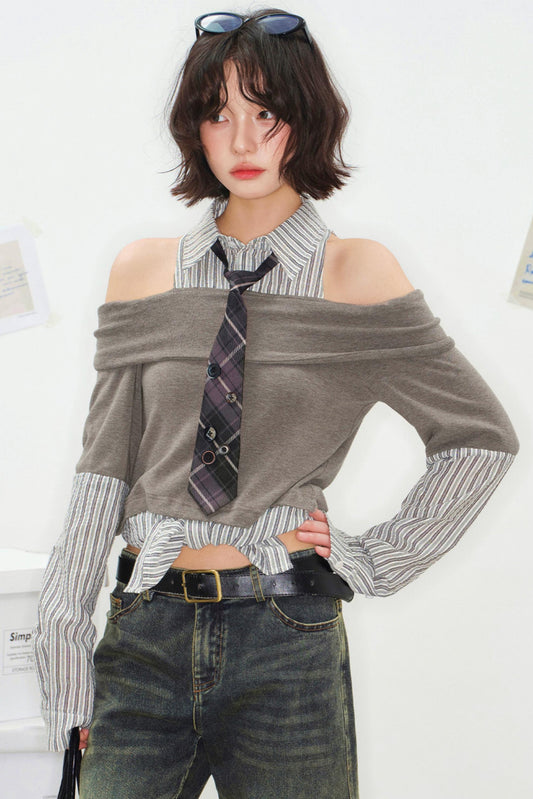 패치워크 컬러 블록 오프숄더 탑