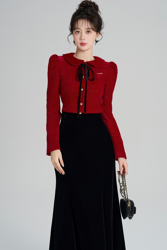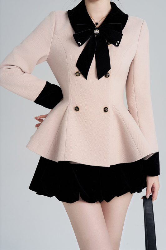 スイートガーリーリボンフレアコート+ファーカラー+シャツ+スカート+ベレー帽