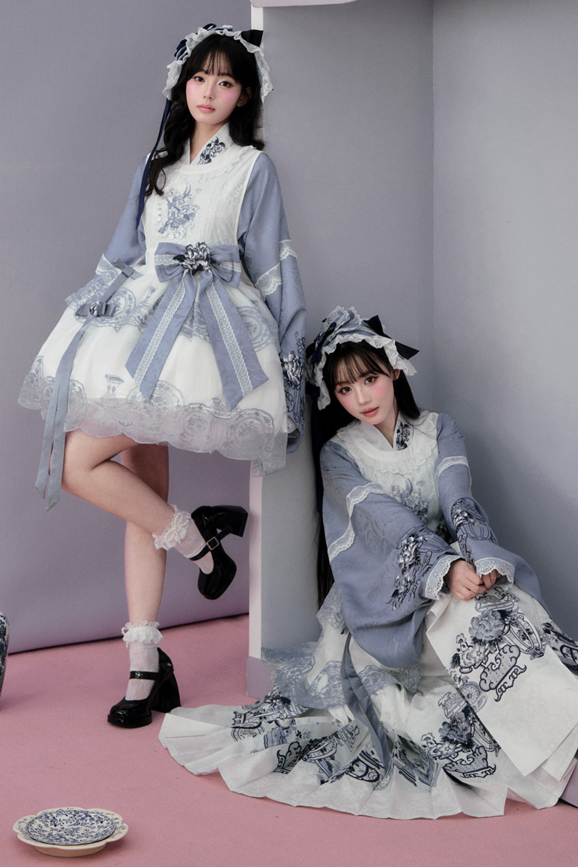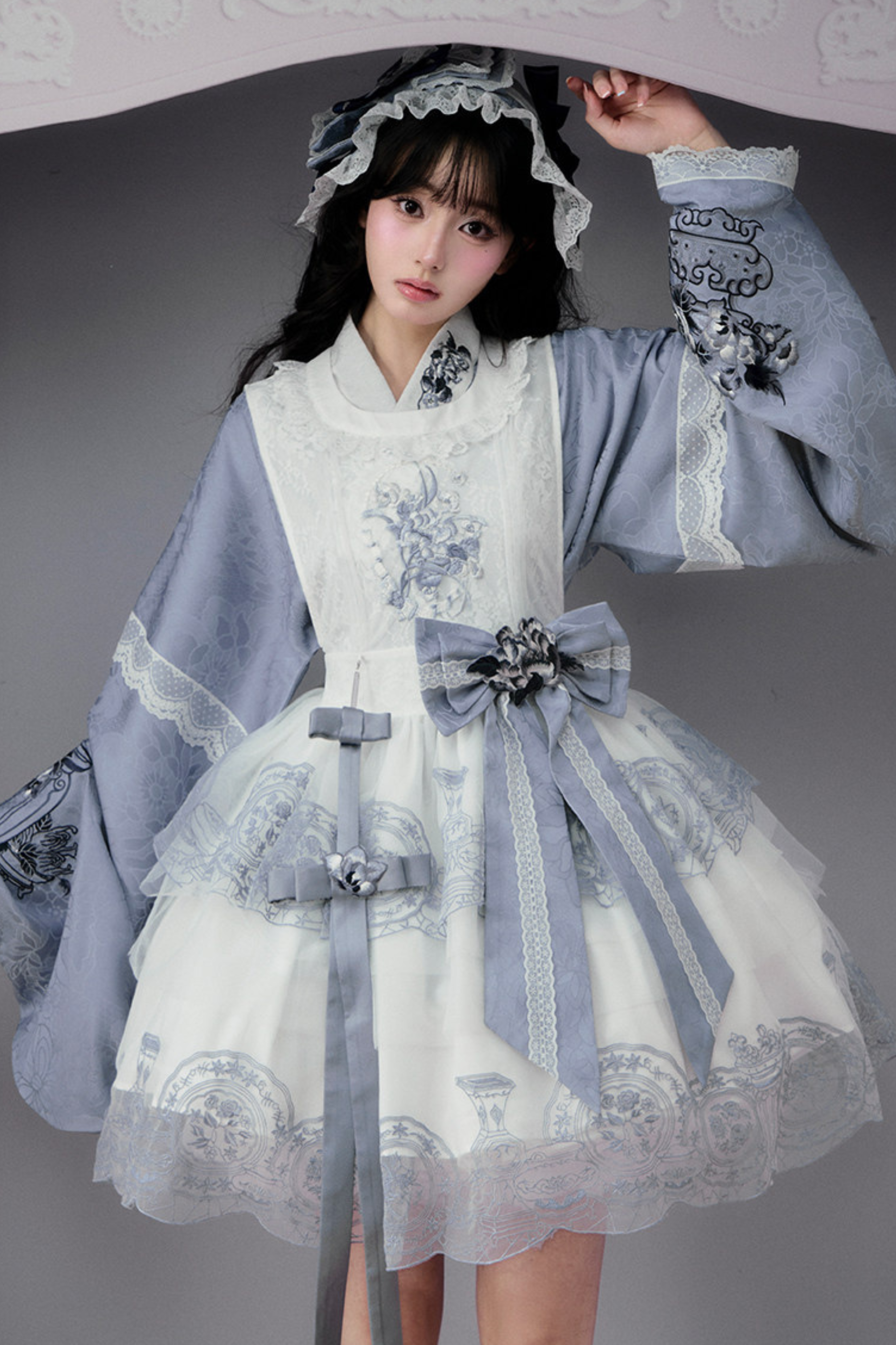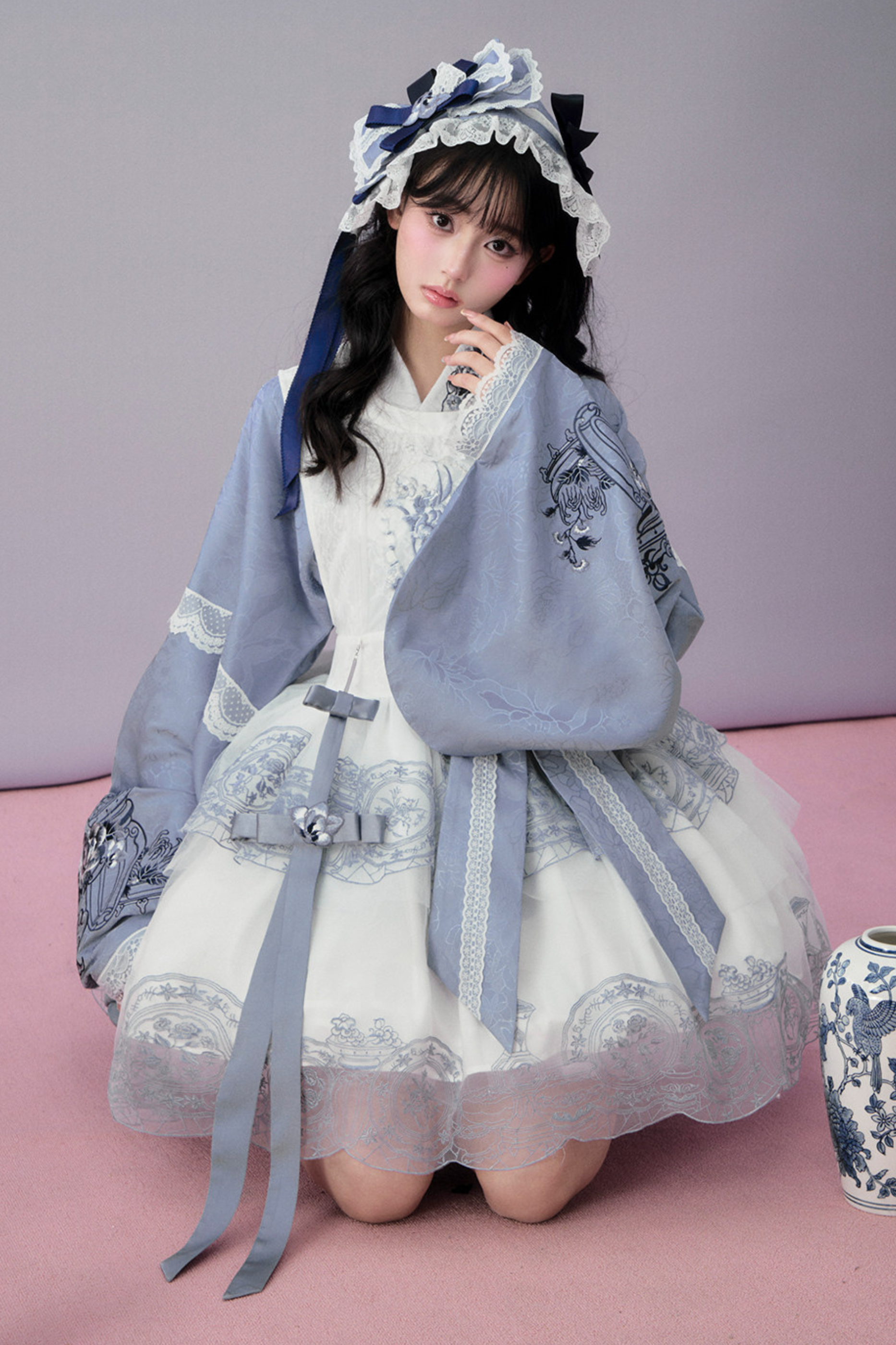 귀여운 차이나 재킷 + 스커트 + 오버스커트 + 리본 + 브로치 + 헤어밴드