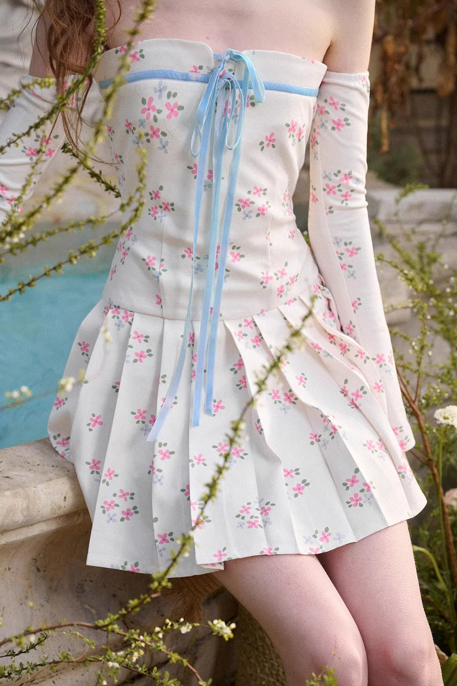 블루 벨벳 꽃무늬 리본 드레스
