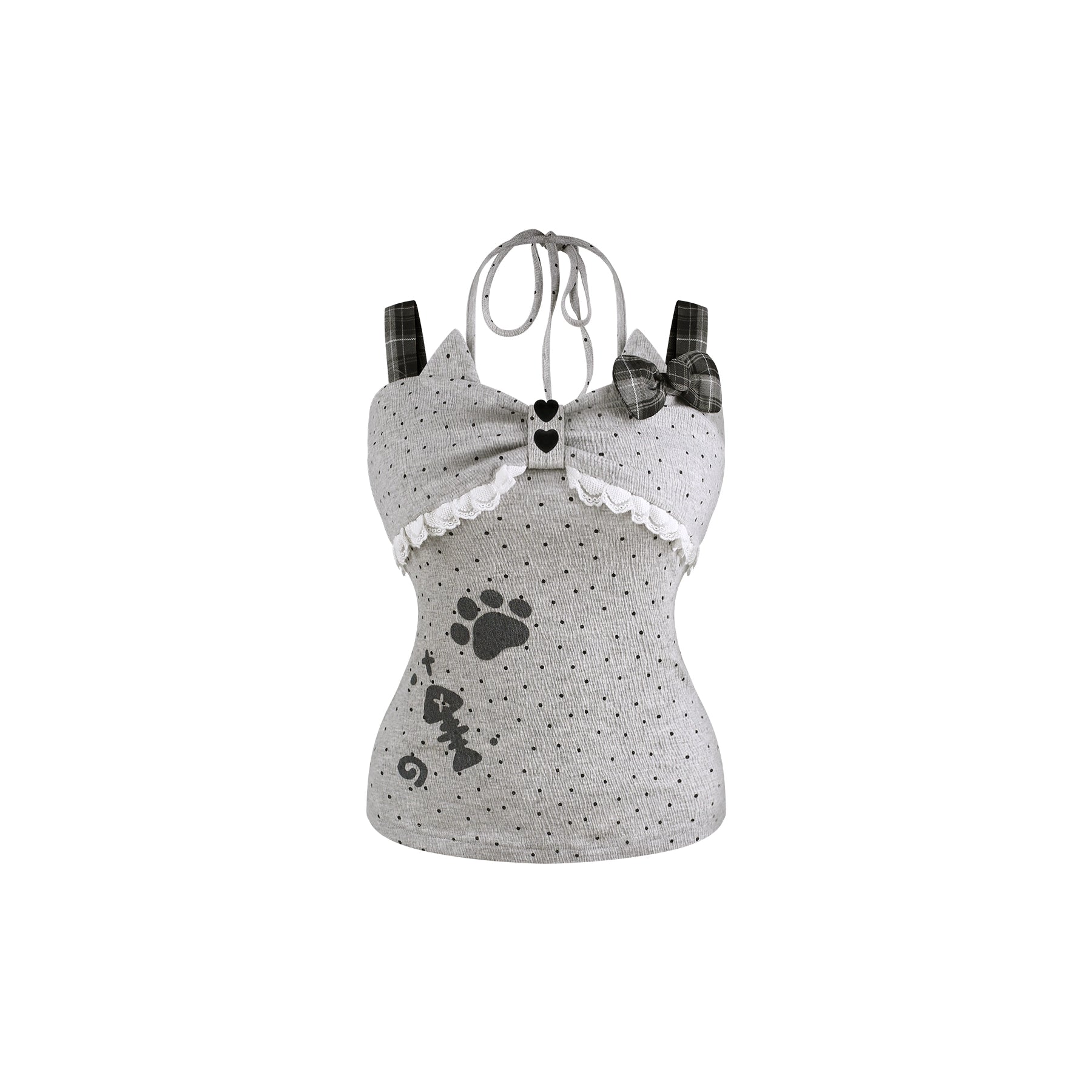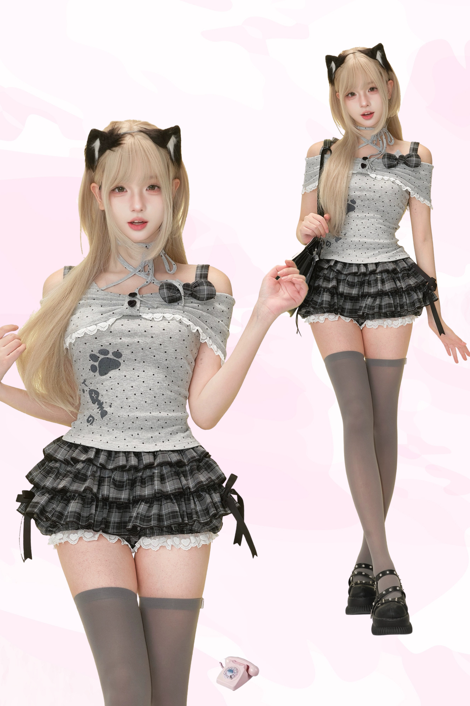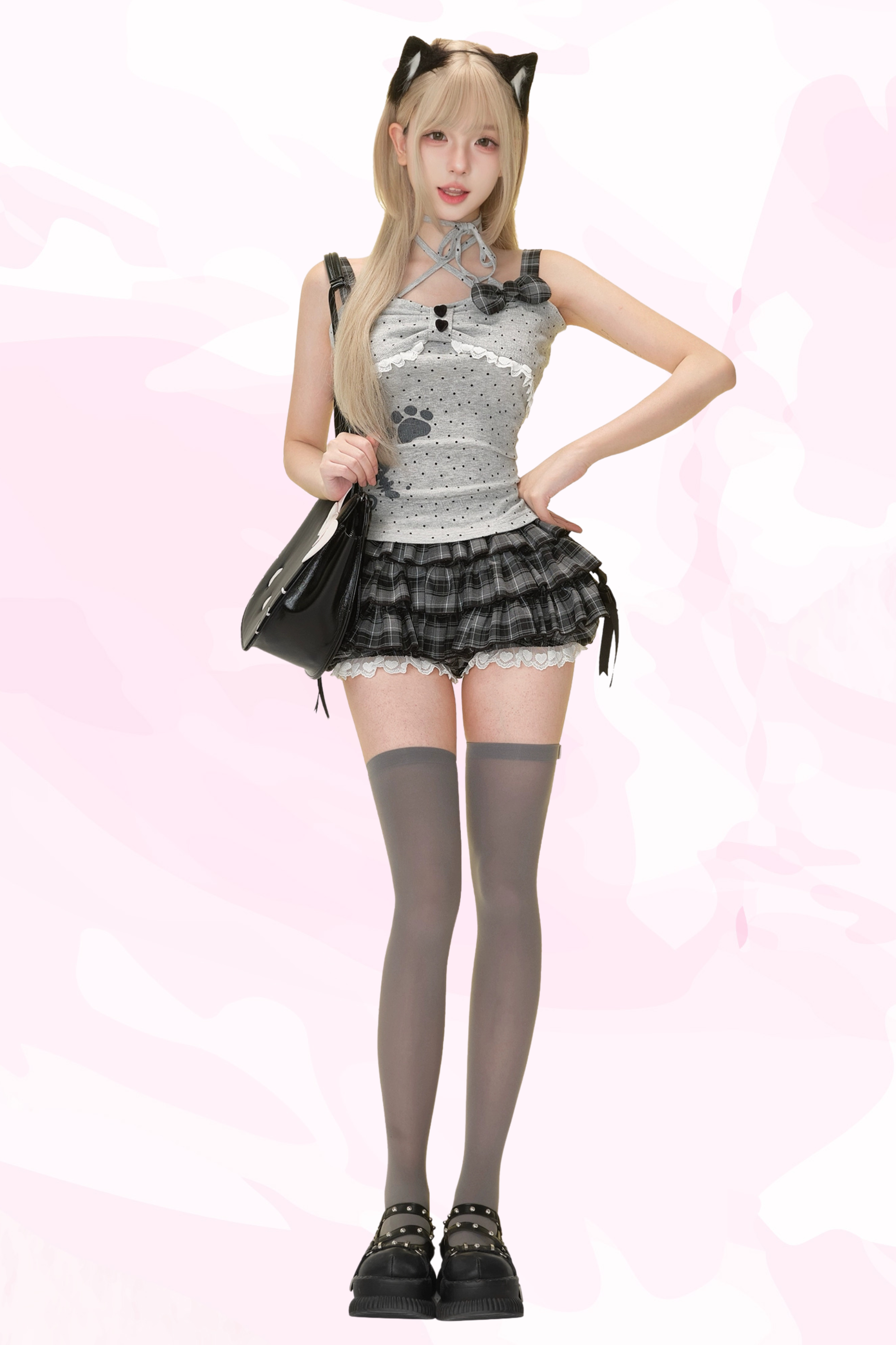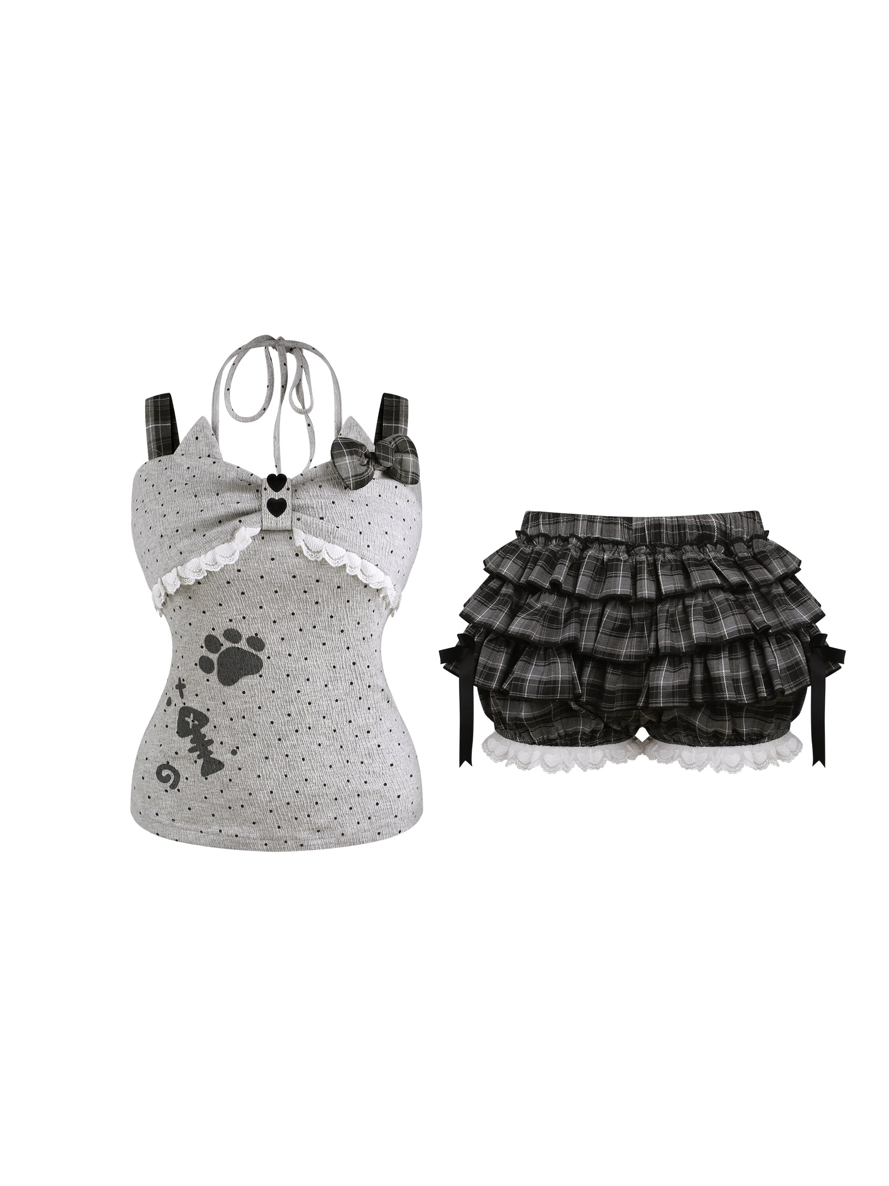 ❤黒猫ドットキャミソール+チェックケーキスカート❤