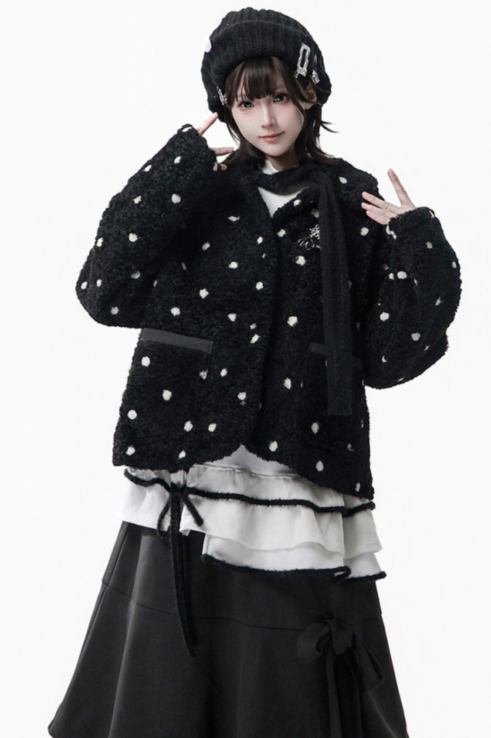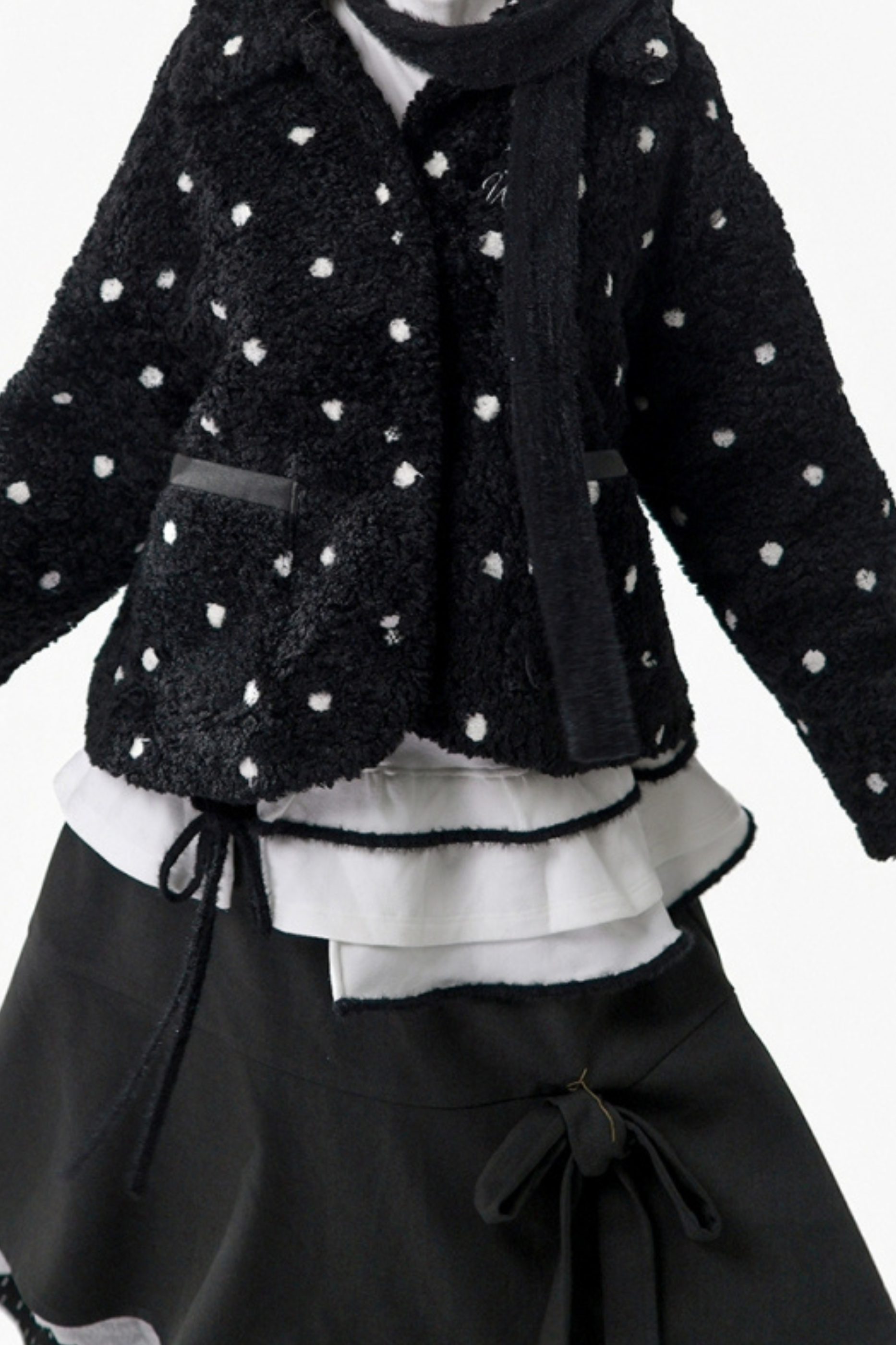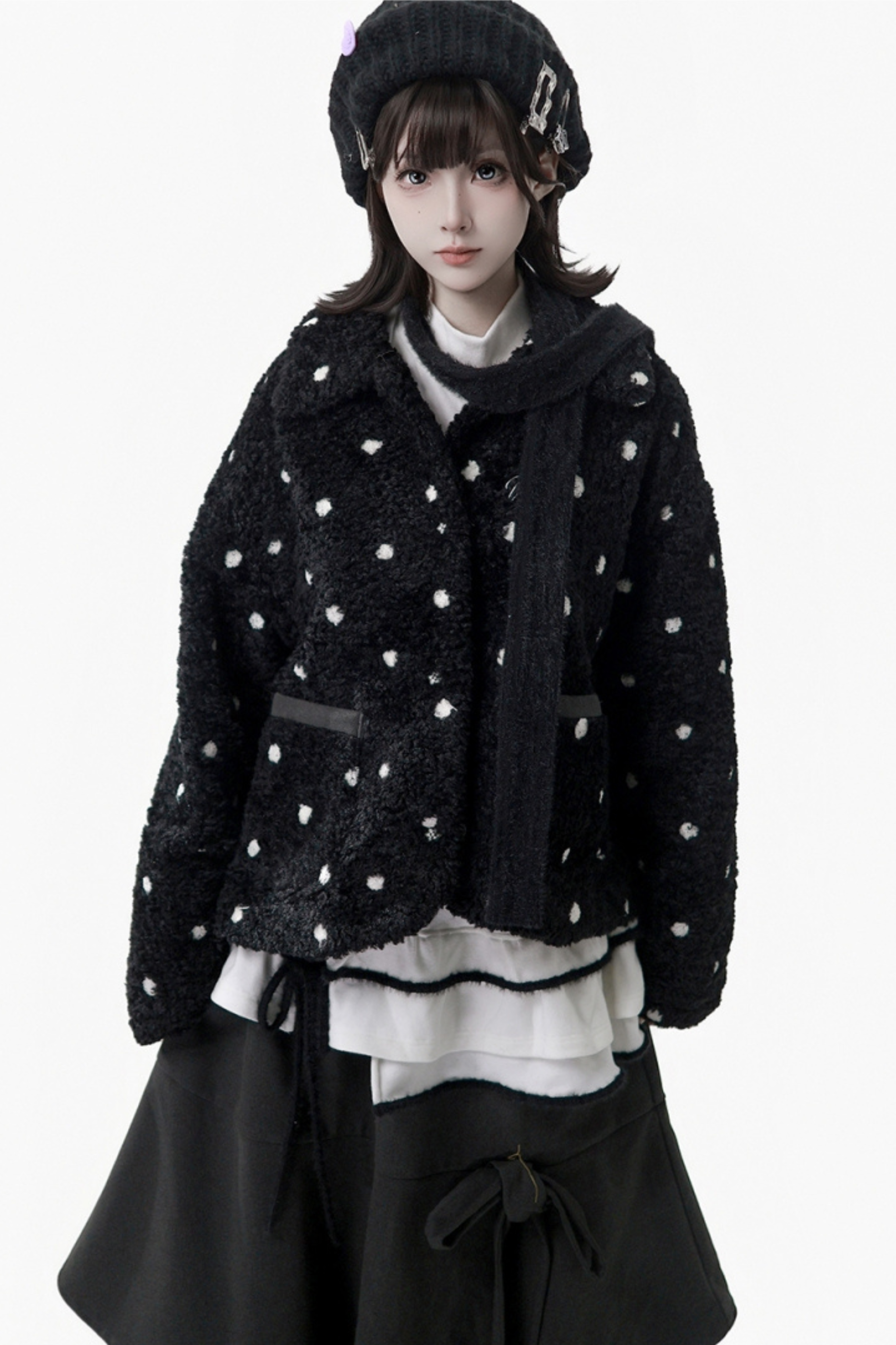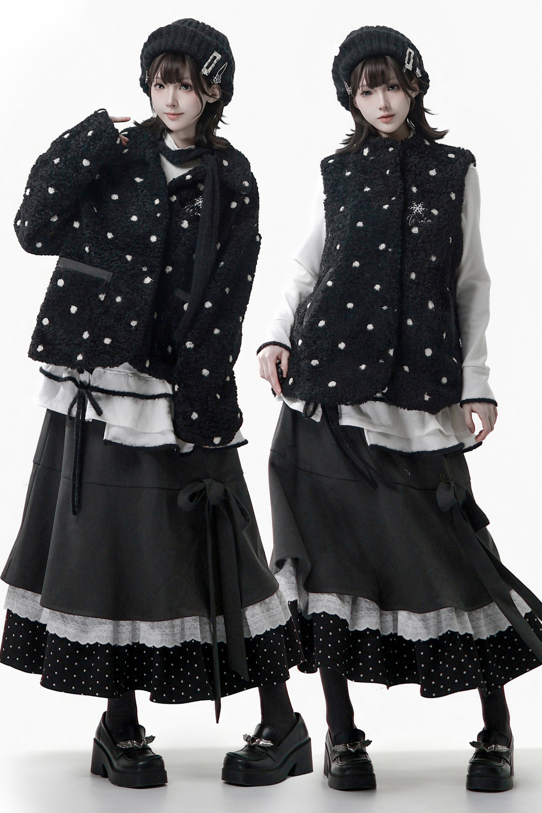 ポルカドットウィンターフリースジャケット+ベスト+トップス+スカートスカーフ