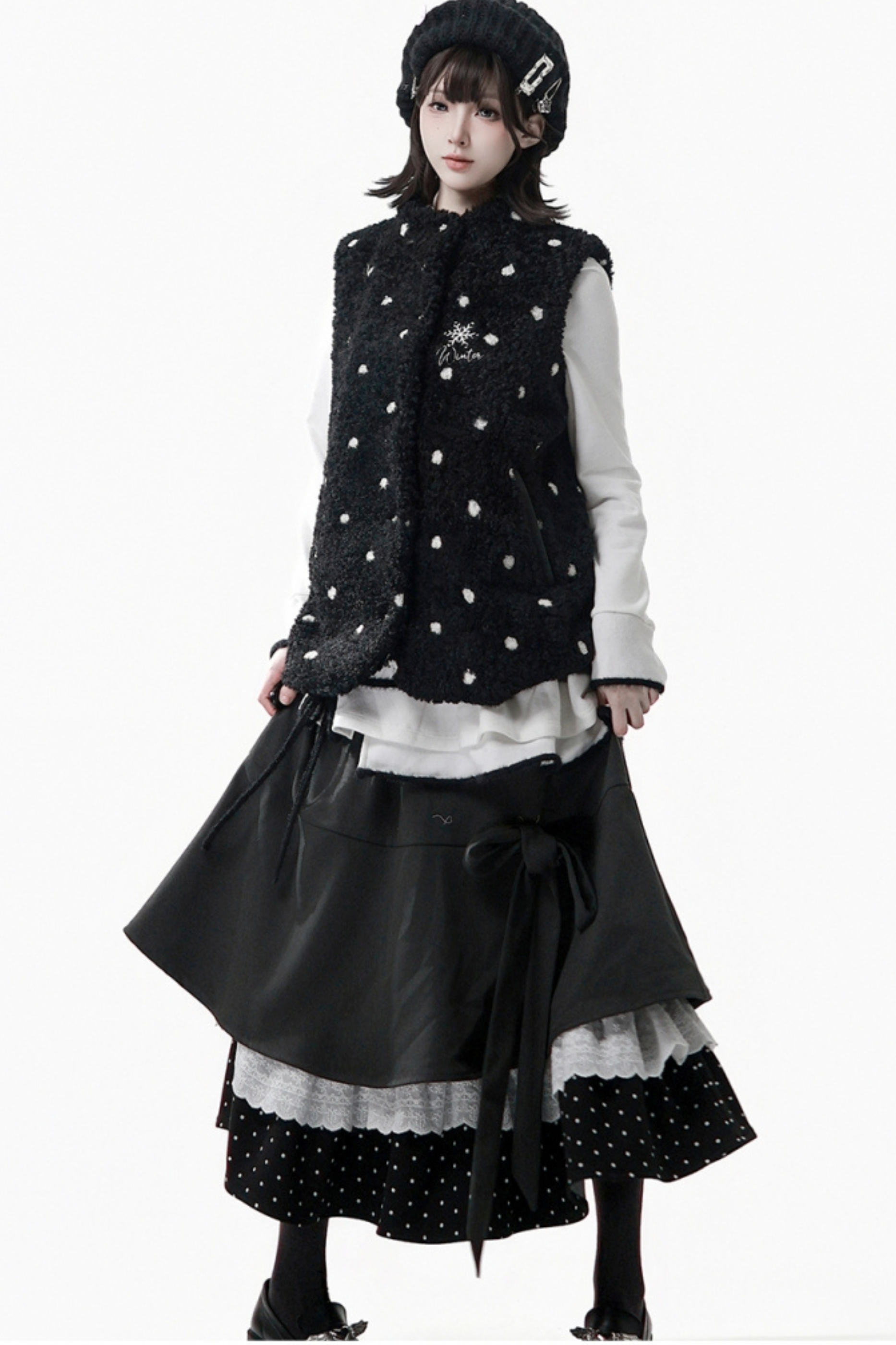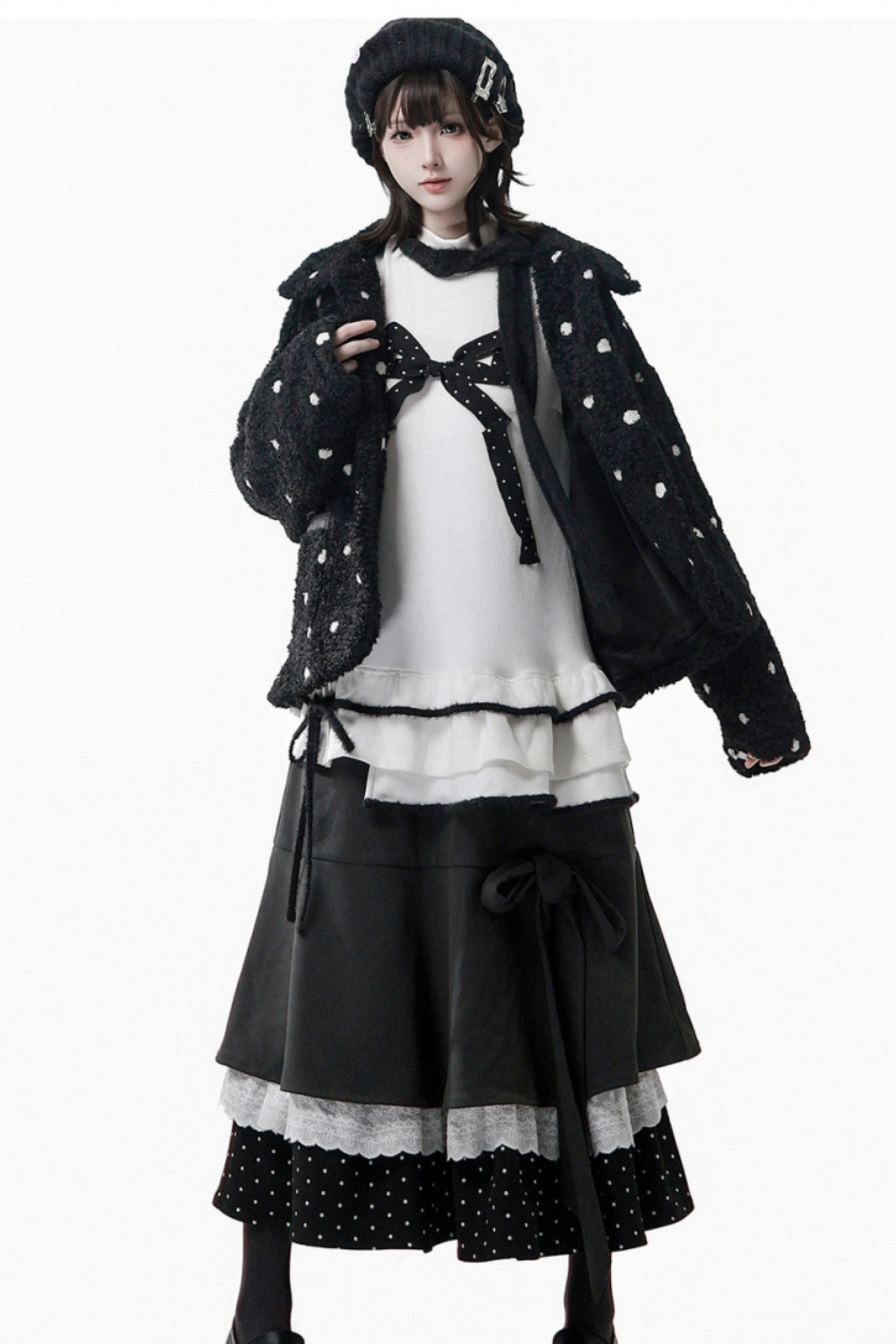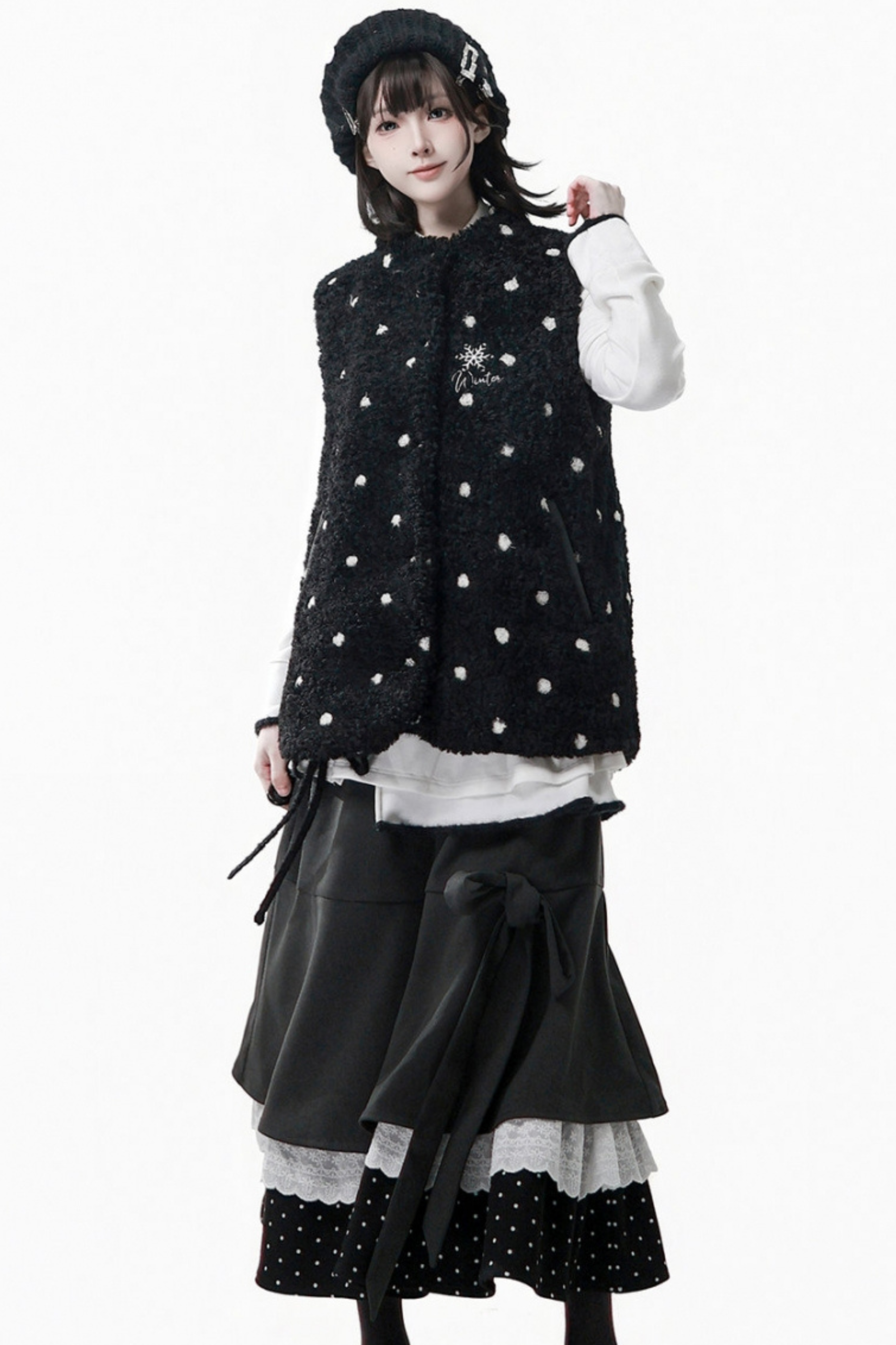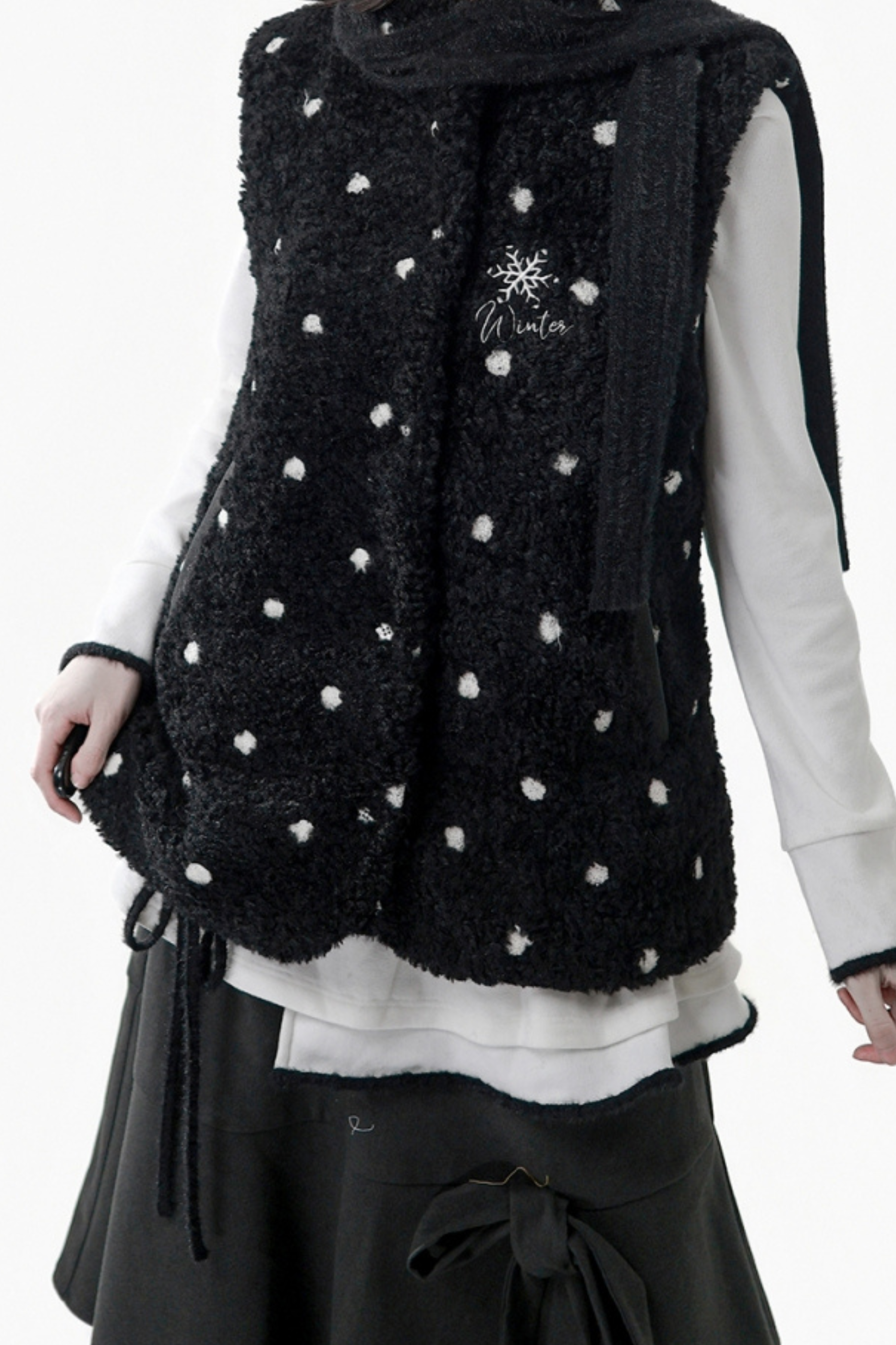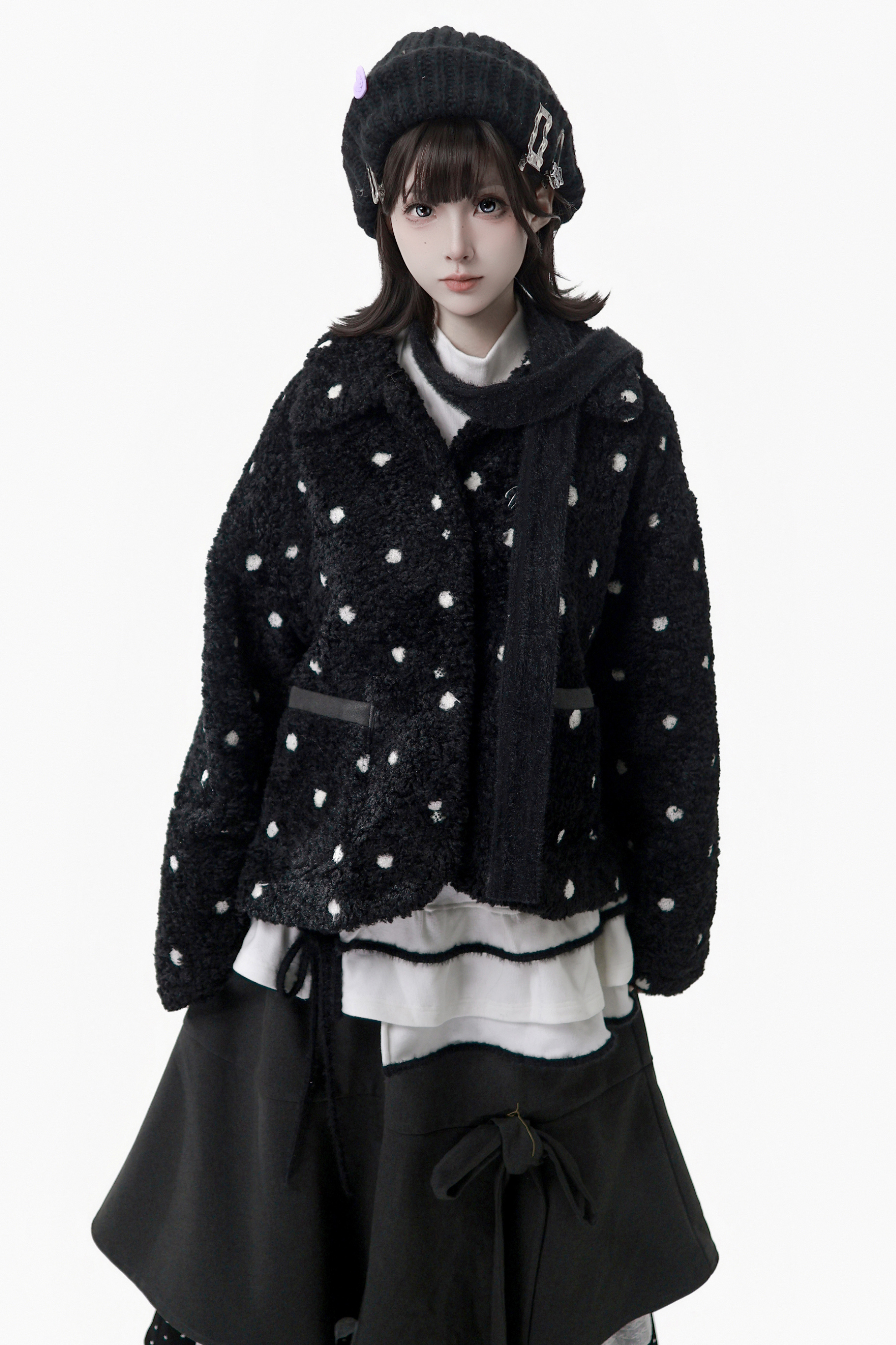ポルカドットウィンターフリースジャケット+ベスト+トップス+スカートスカーフ
