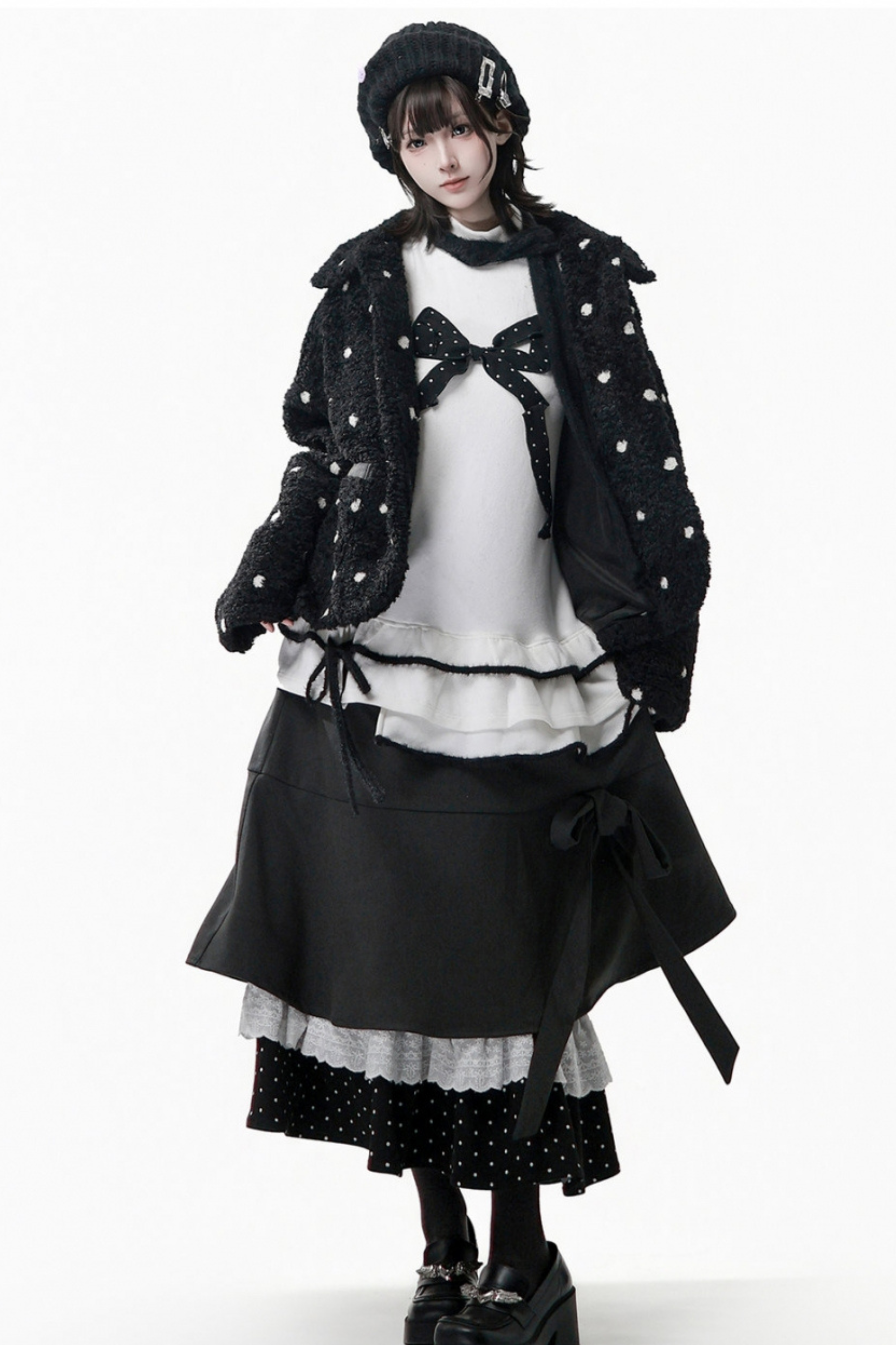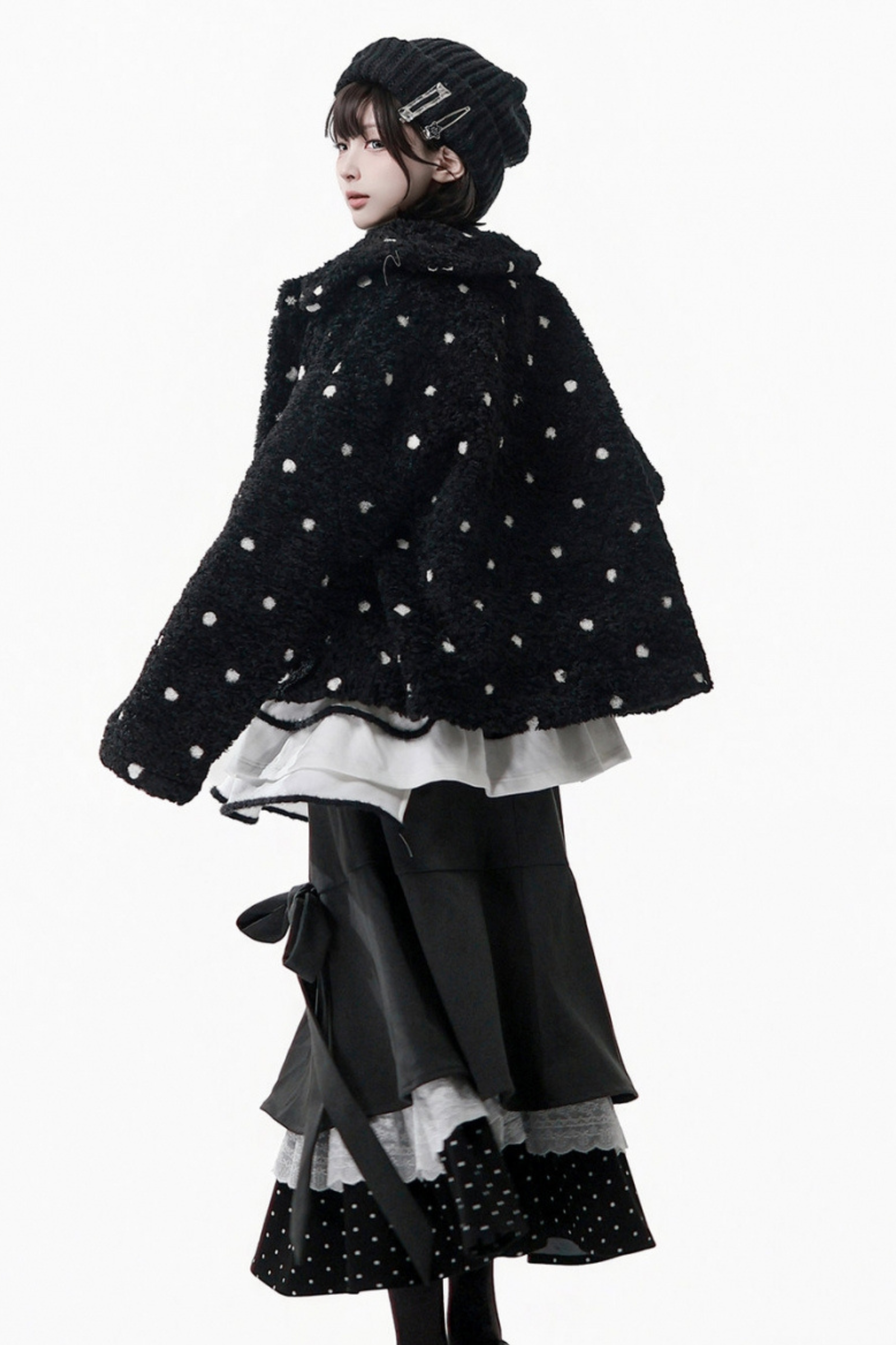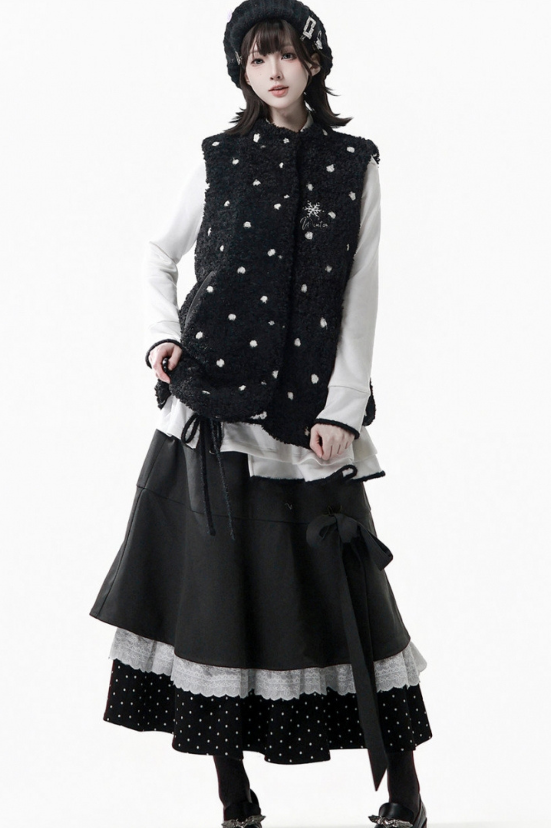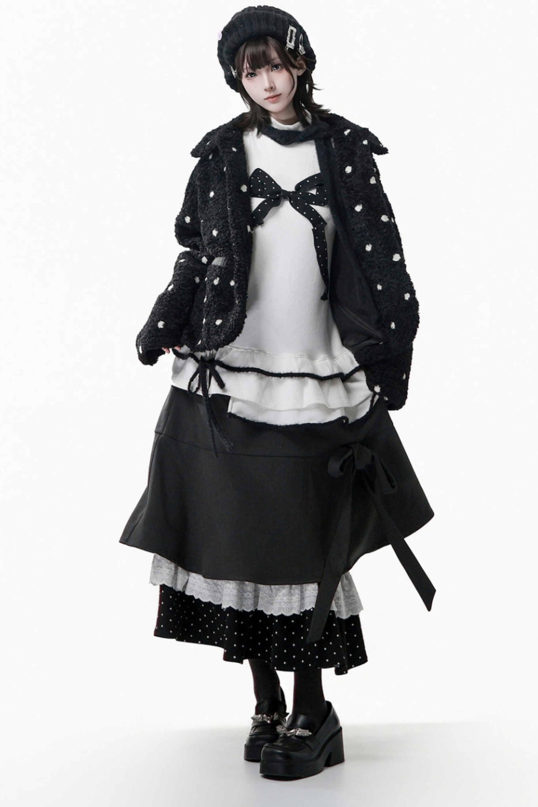 ポルカドットウィンターフリースジャケット+ベスト+トップス+スカートスカーフ