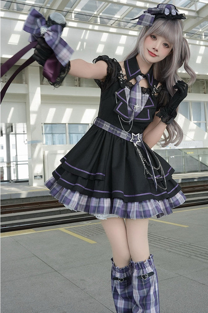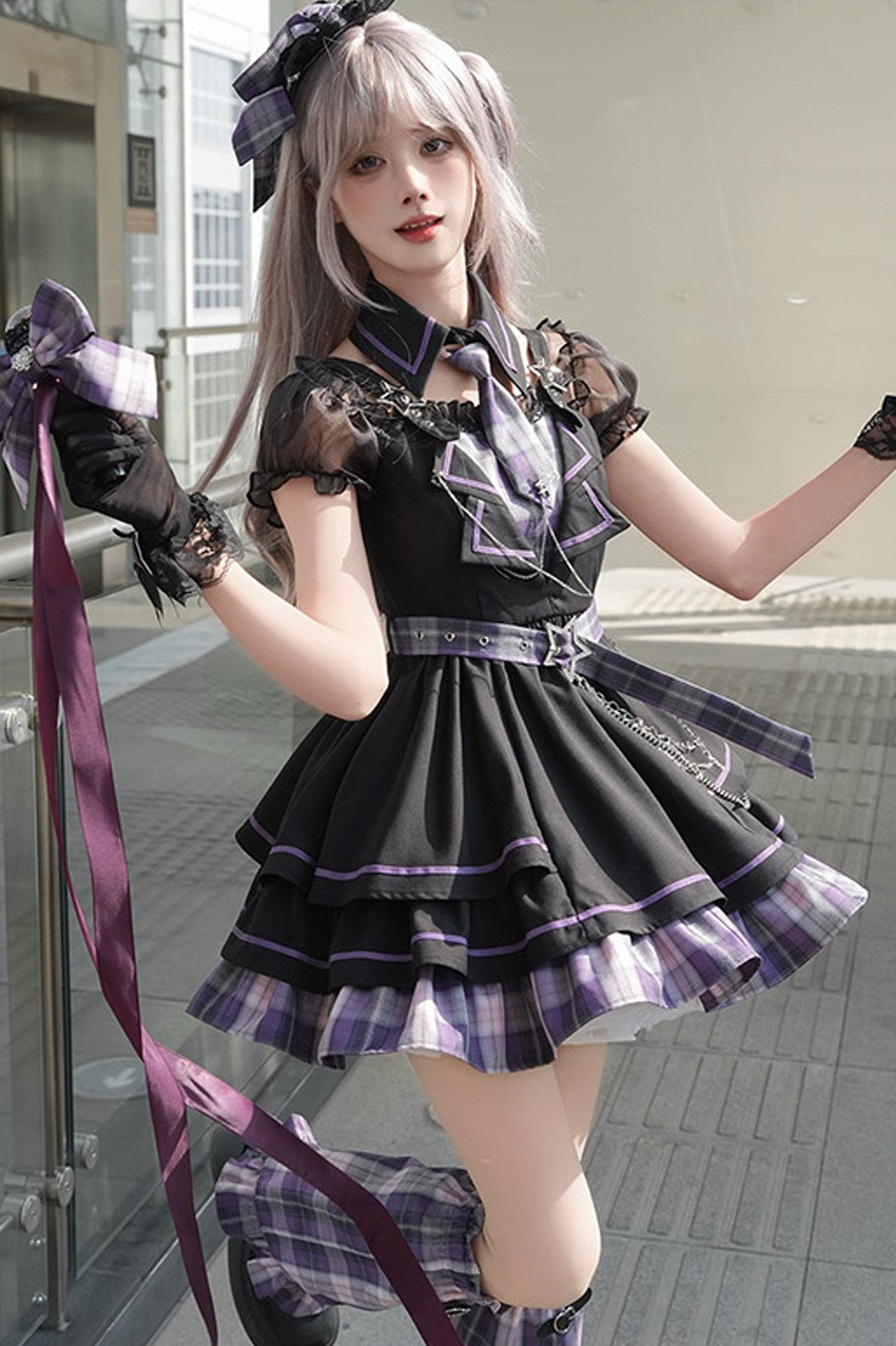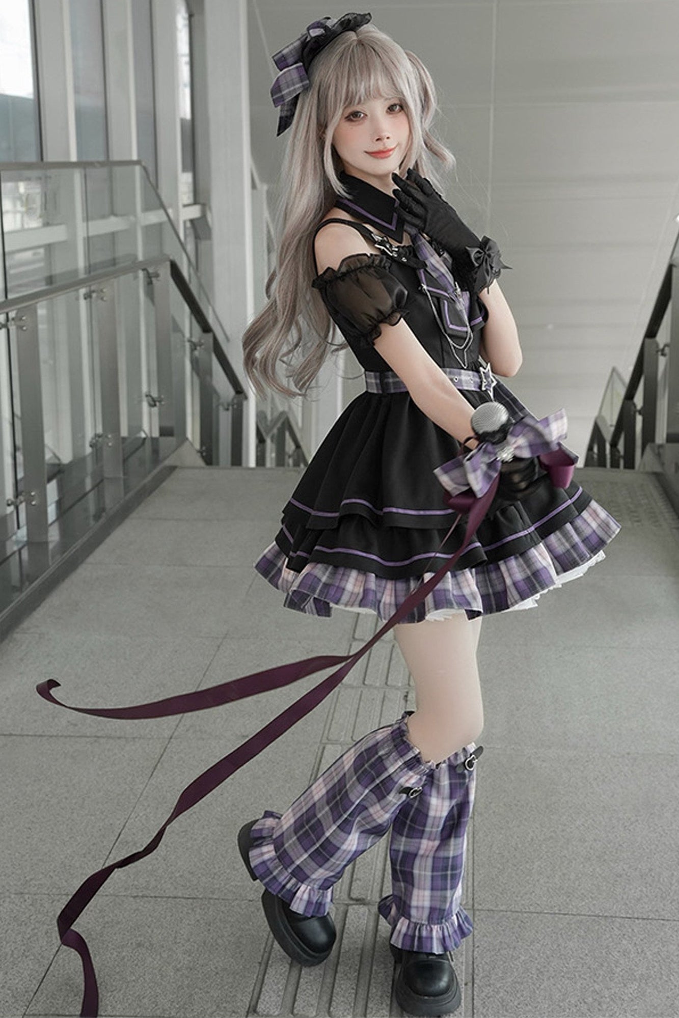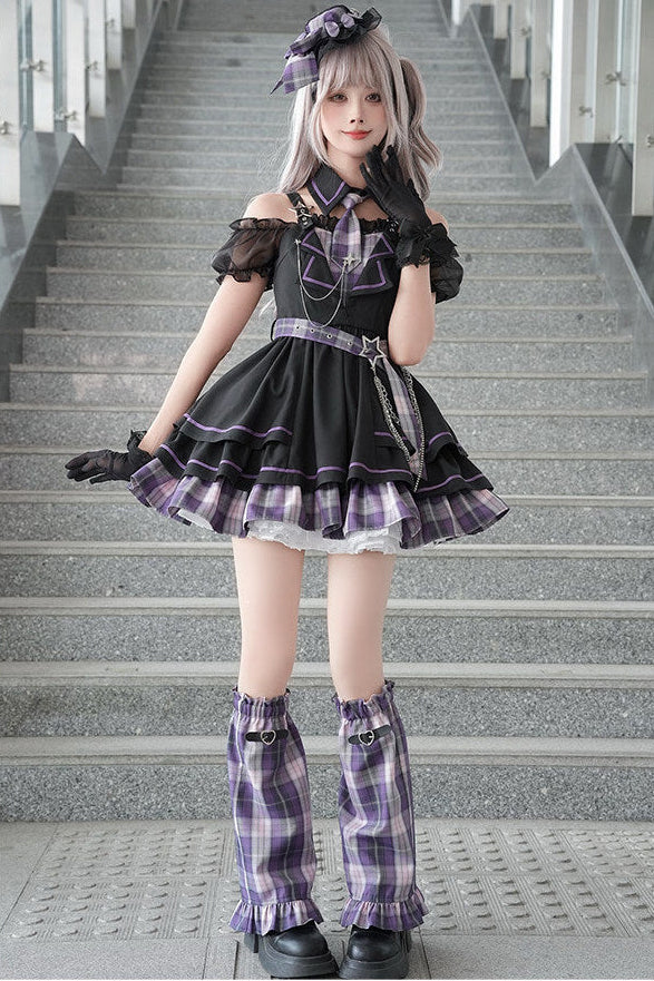 다크 카와이 체크 로리타 원피스 + 레그 워머