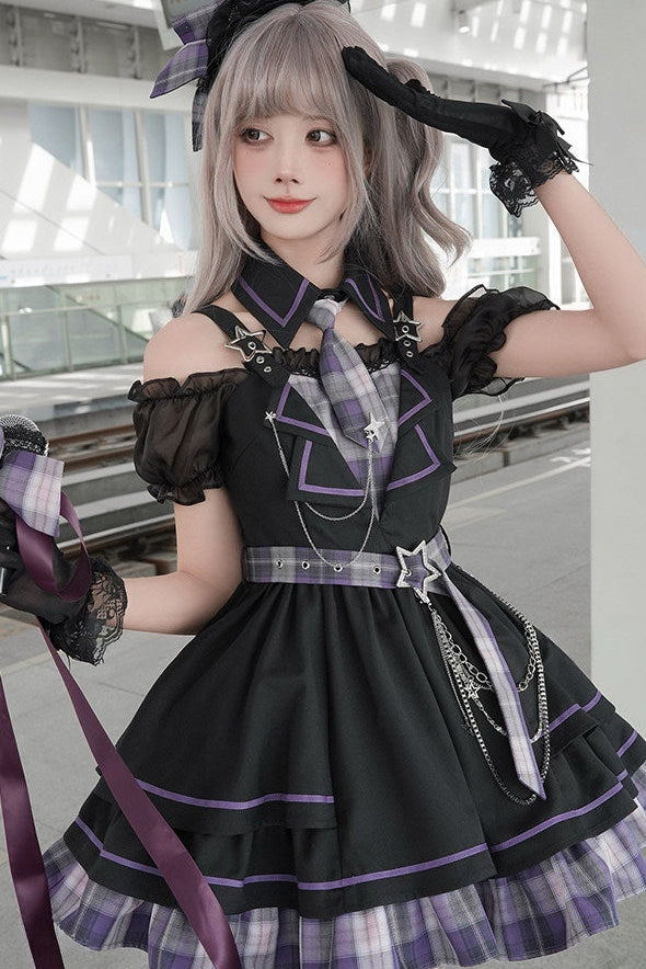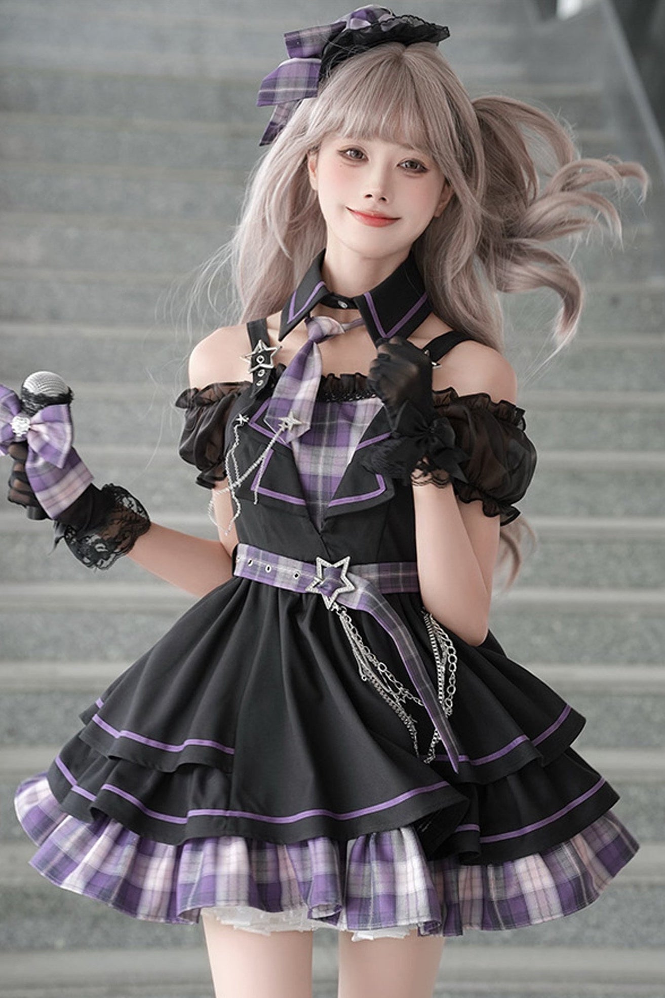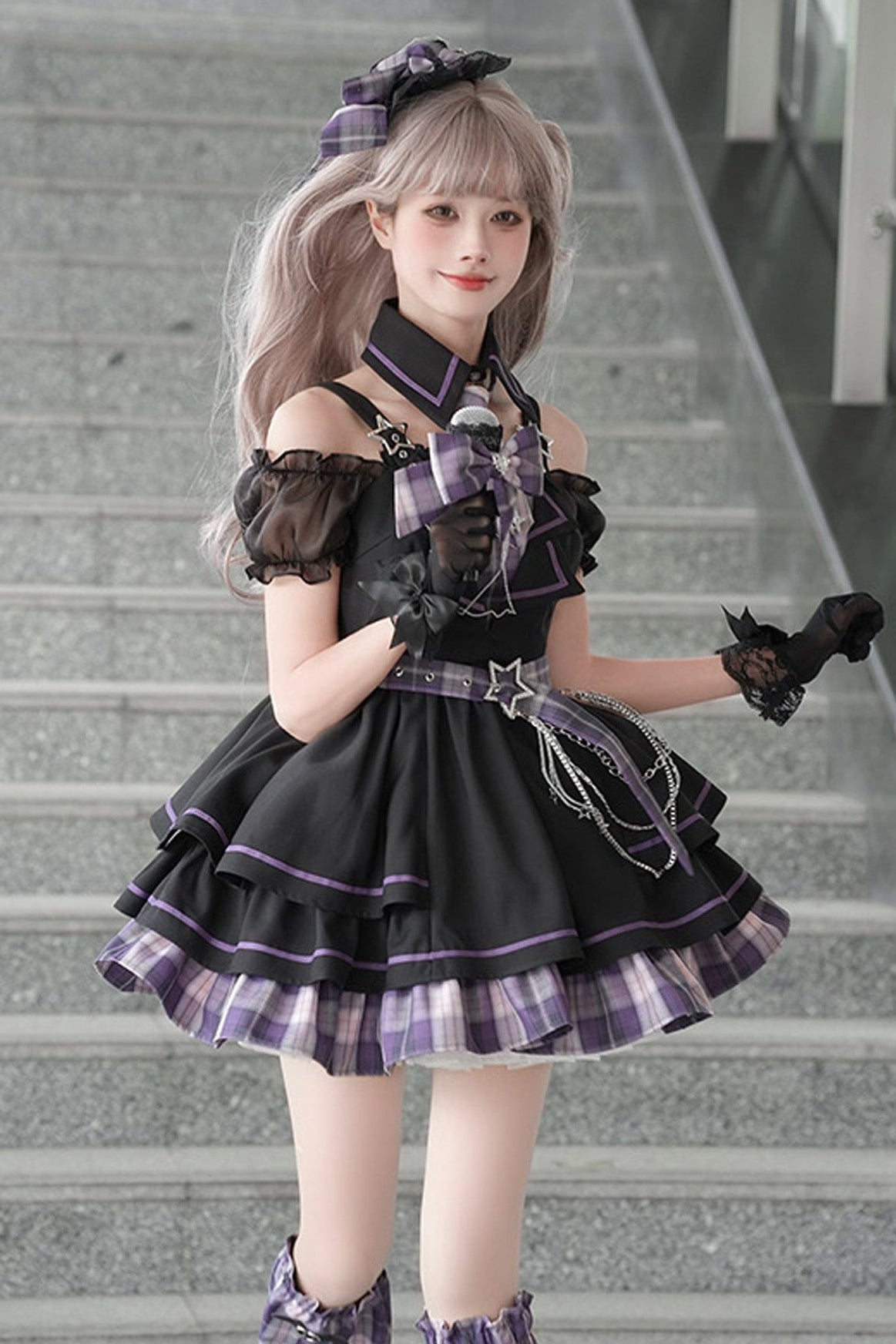 다크 카와이 체크 로리타 원피스 + 레그 워머