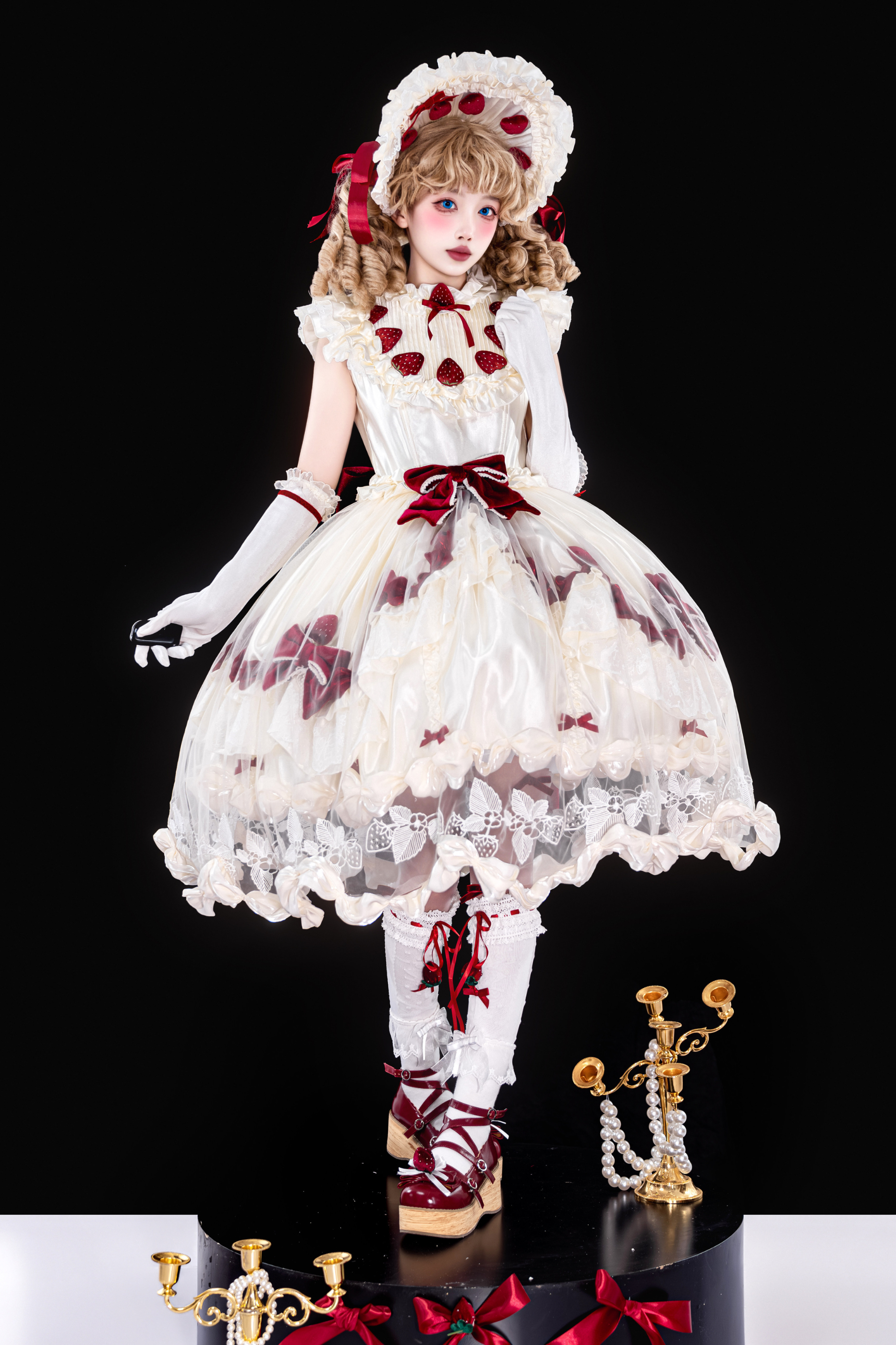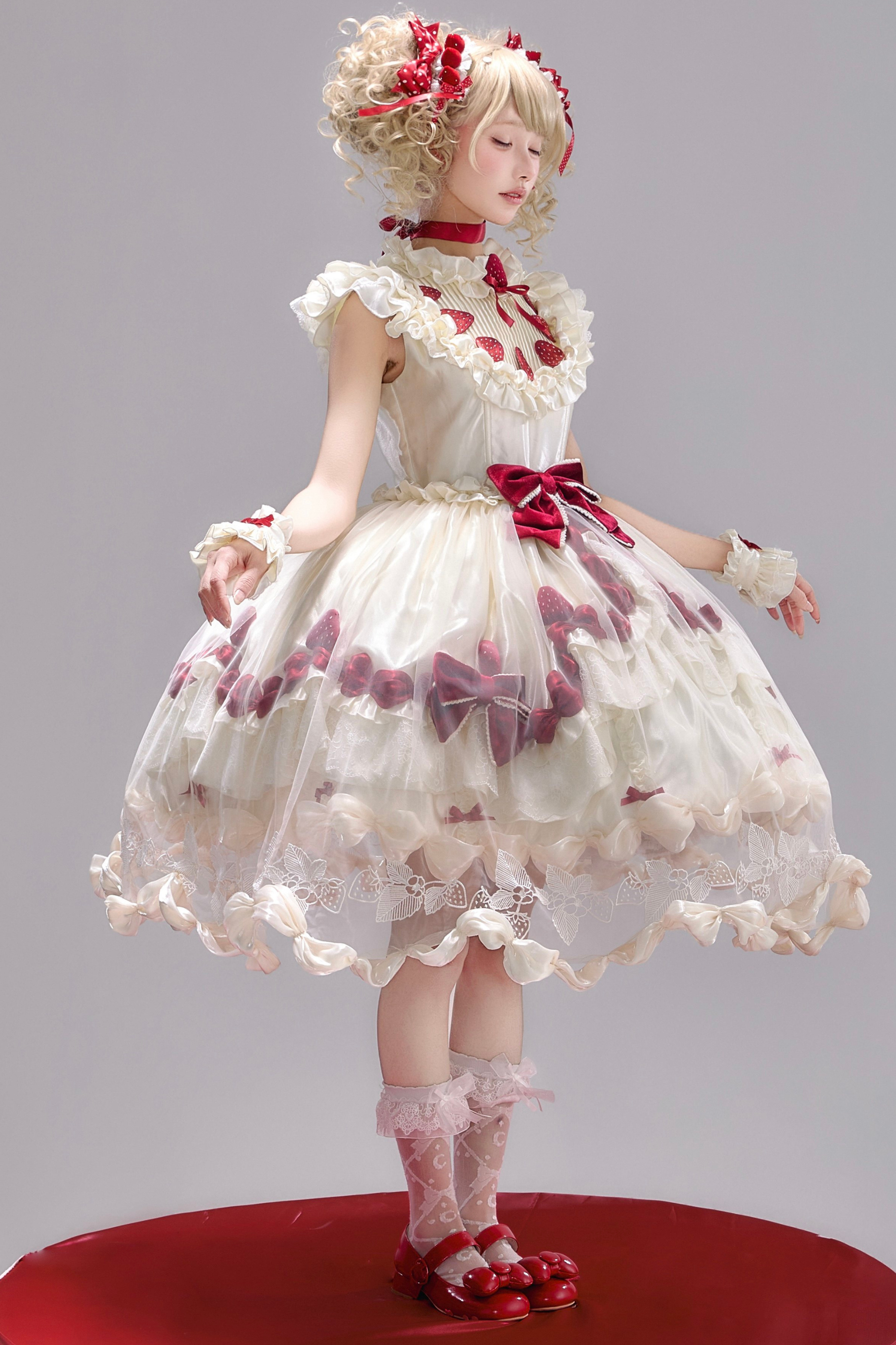 [3월 13일 예약마감] 스트로베리 크림 롤리타 원피스 + 케이크 모자 + 꼬리 + 보닛 + 페티코트