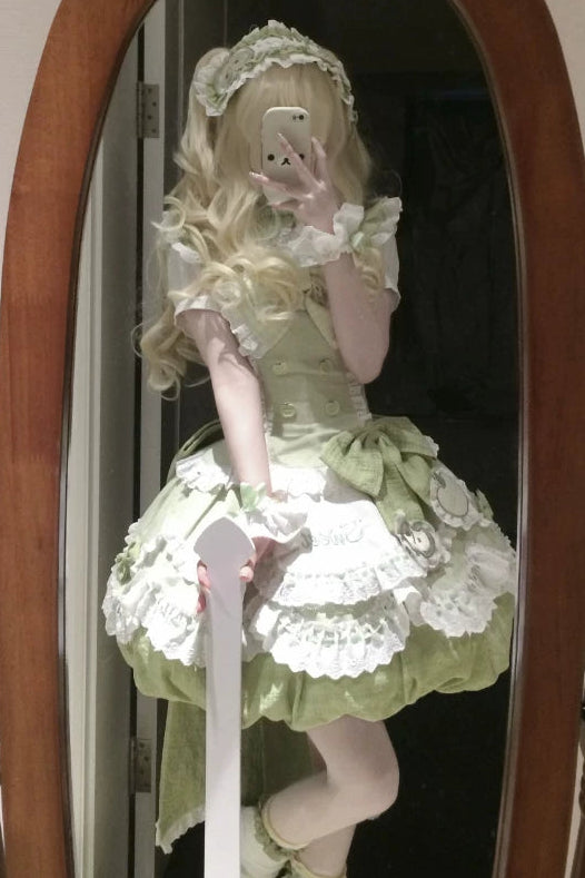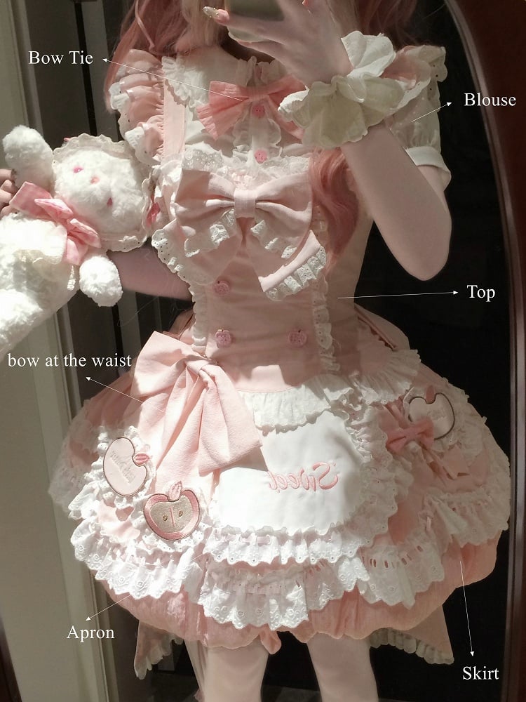 셋업 내용 [퍼프 슬리브 셔츠 + 뷔스티에 드레스 + 벌룬 스커트 + 앞 허리 리본 액세서리 + 보우타이 + 허리 에이프런]