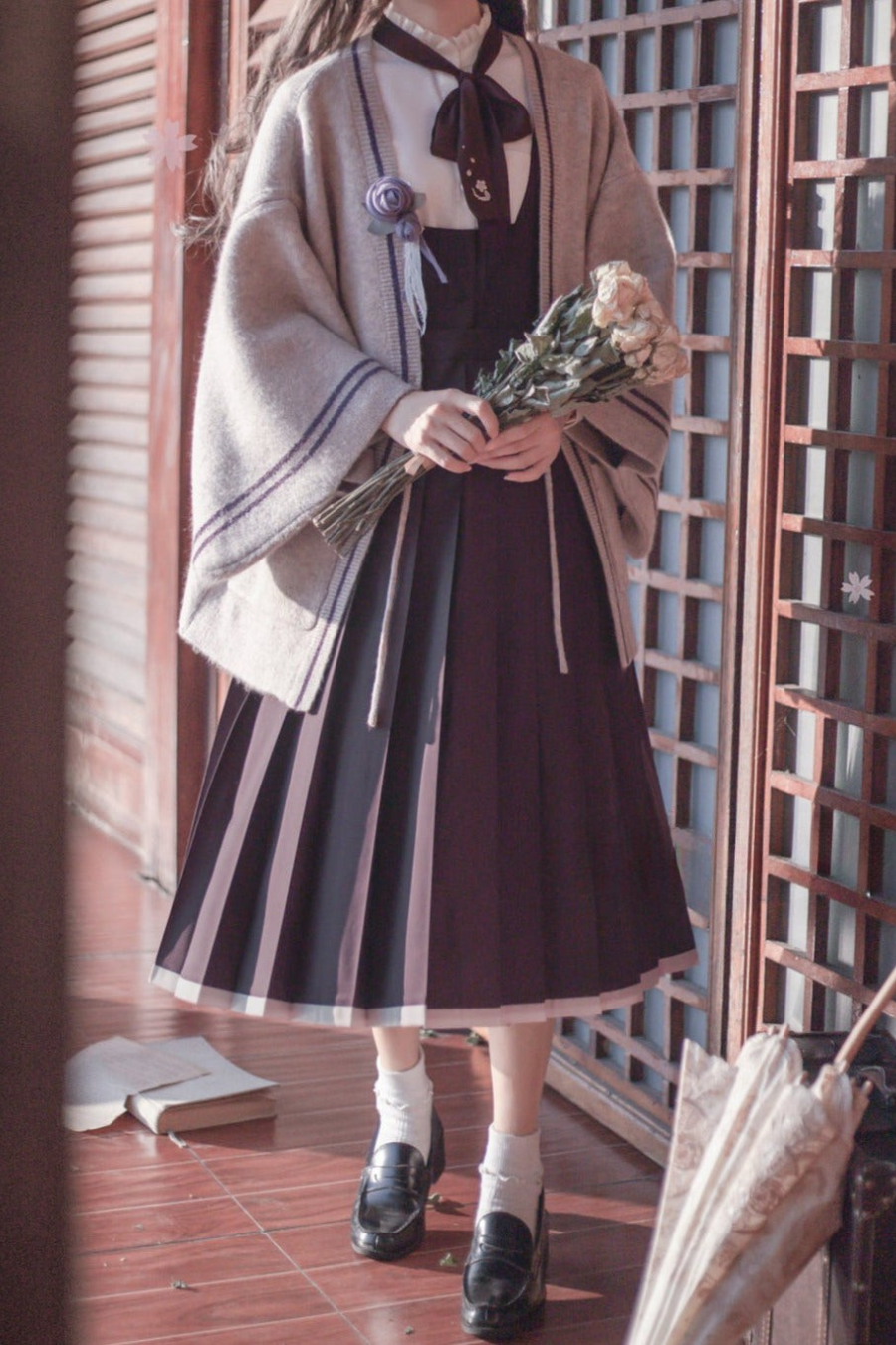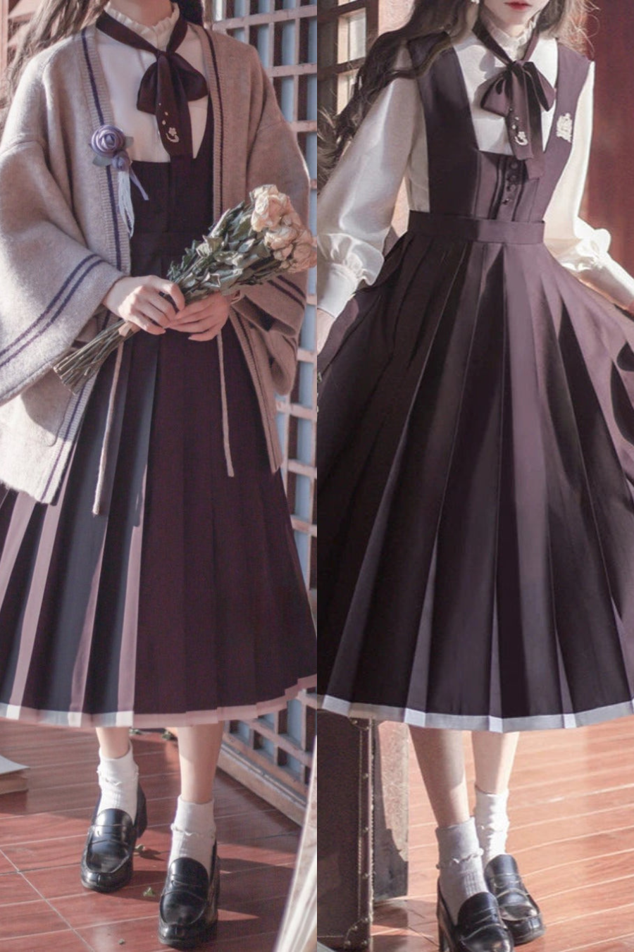 ❤︎ 레트로 일본식 소매 니트 가디건 + 프릴 스탠드 칼라 셔츠 + 조끼 드레스 + 리본 + 코사지❤︎