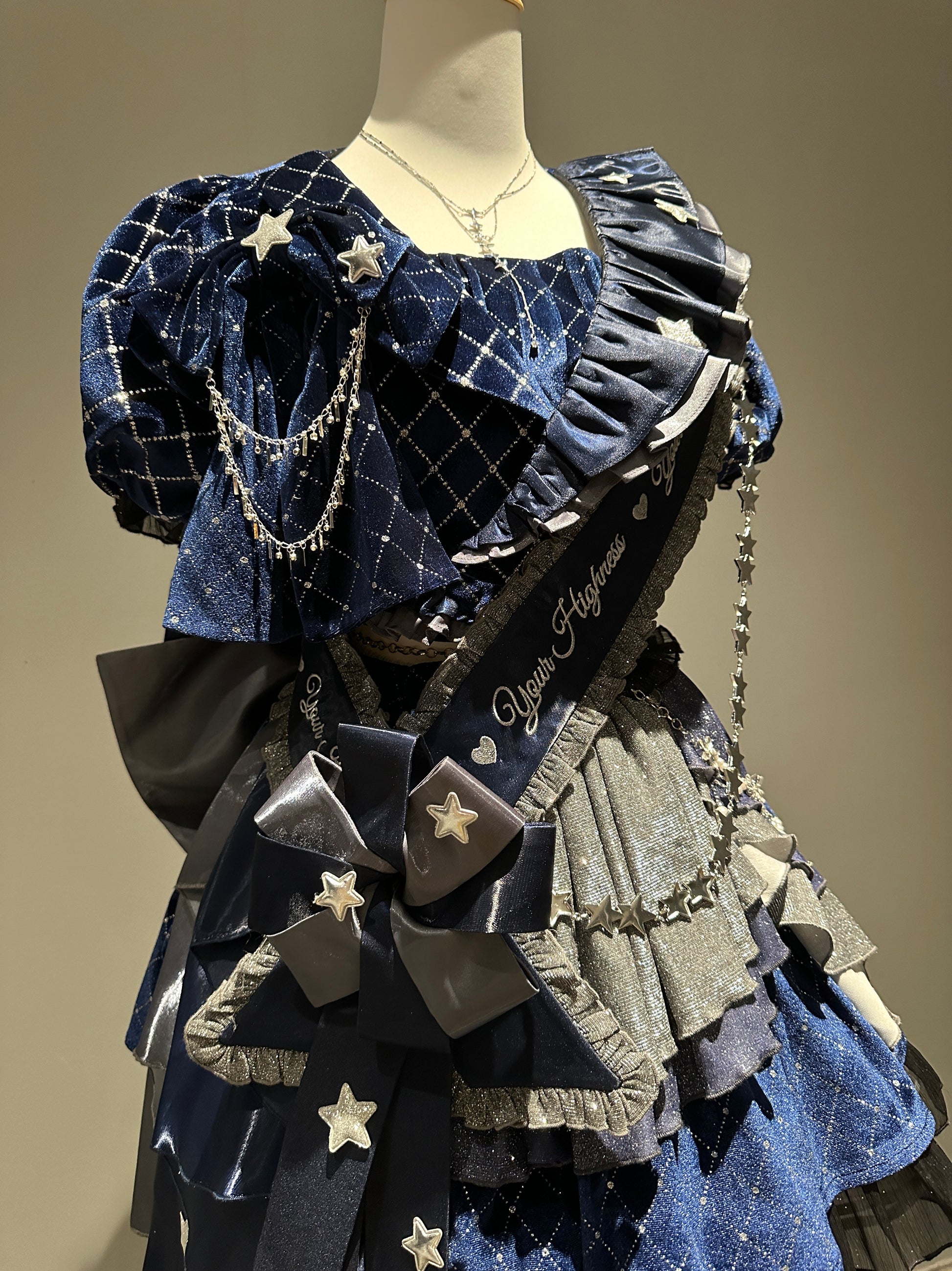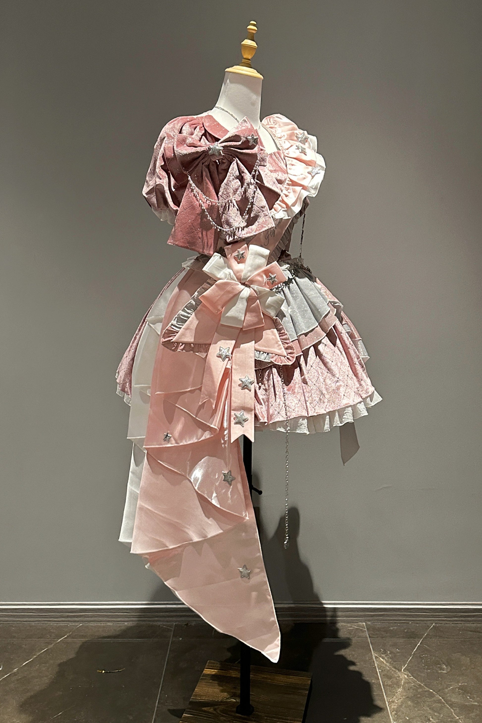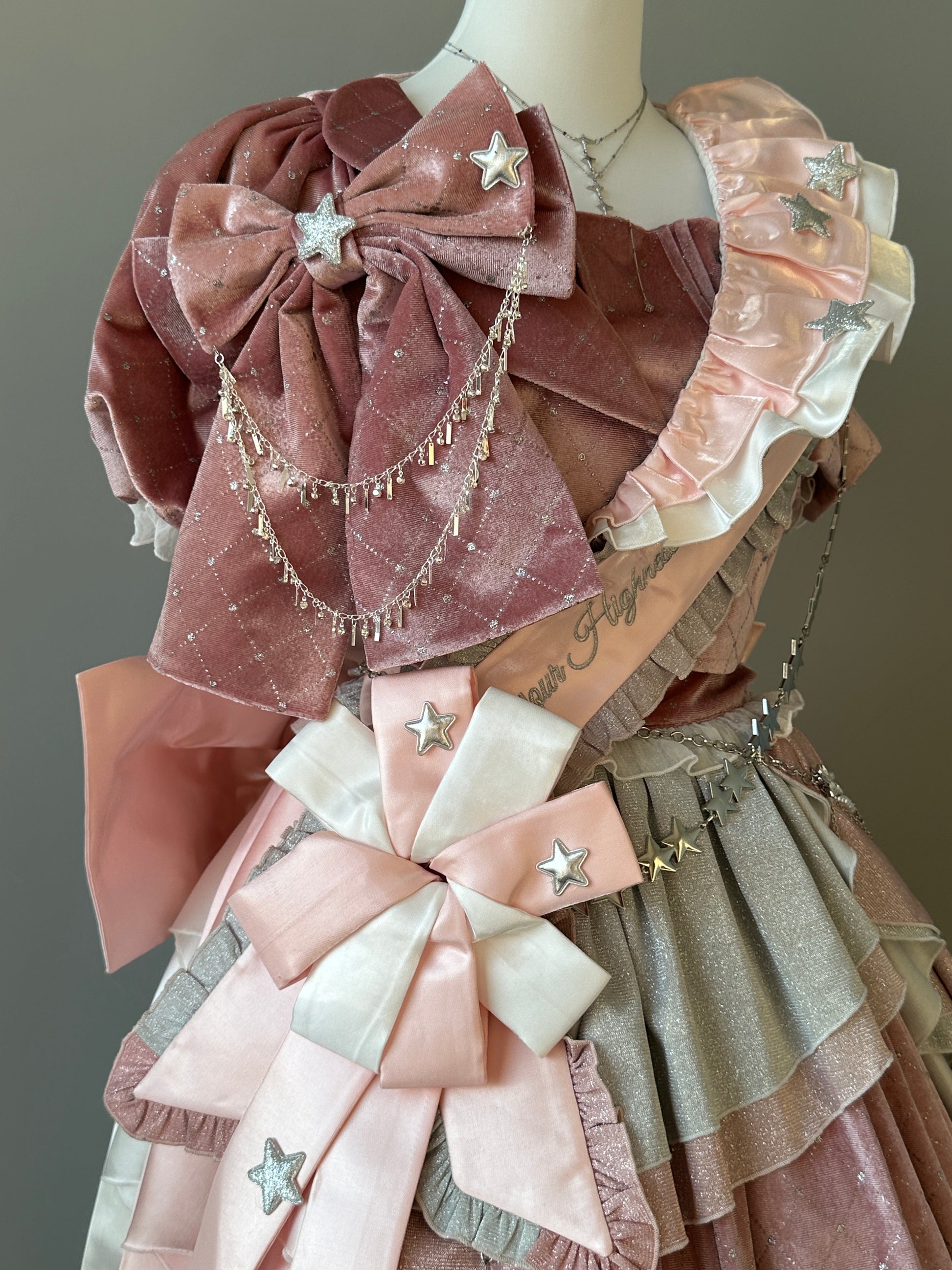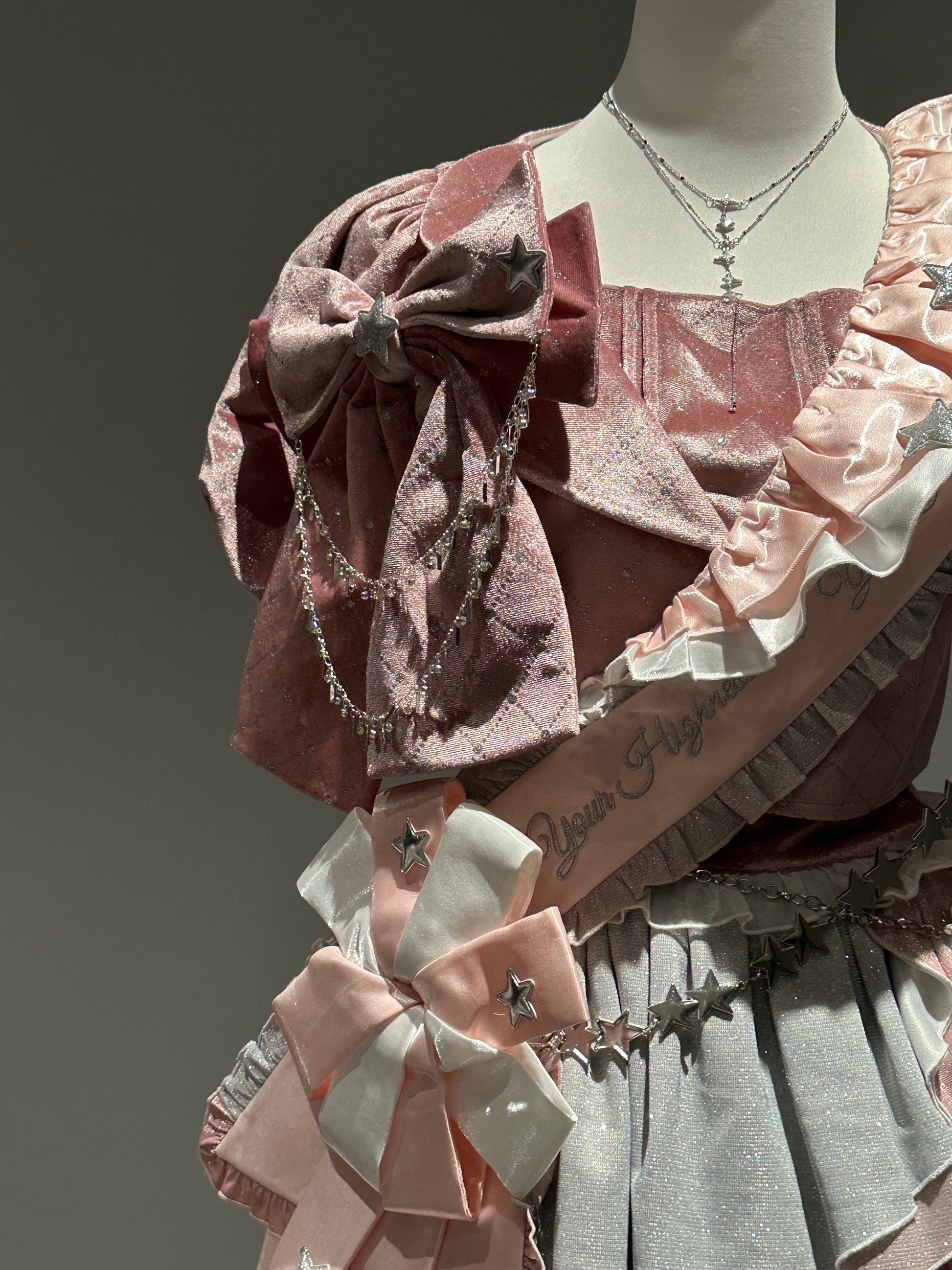 ゴージャスフルセット内容【ジャケットトップ+スカート+サッシュ帯+リボンアクセサリー+フラワーサークルバッジ+バックビックリボン+スターネックレス+取り外し可能なスター型のアクセサリー13個+スターチェーン+パールウエストチェーン+リボンのチェーンアクセサリー】太字部分のアクセサリーは全て取り外し可能です