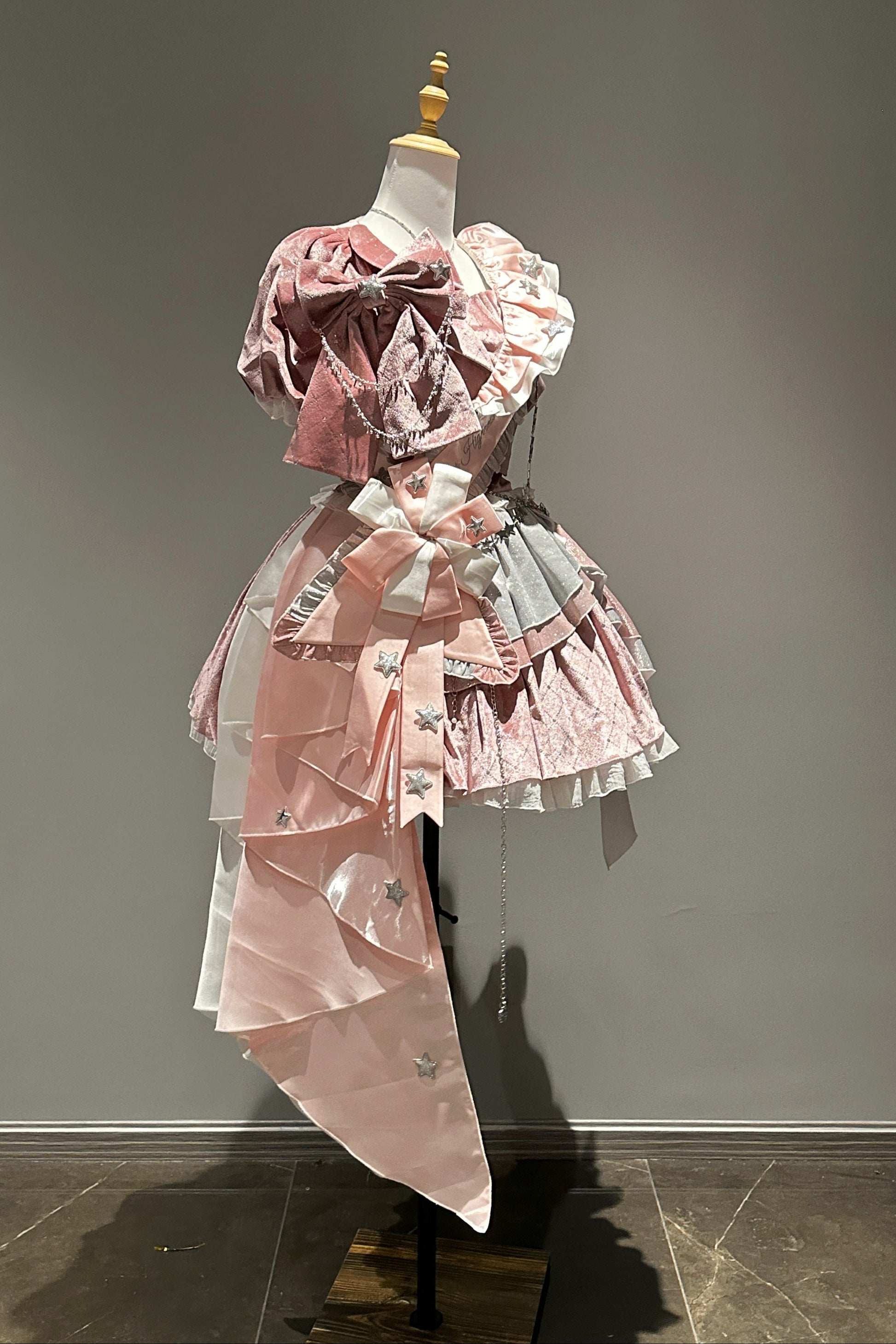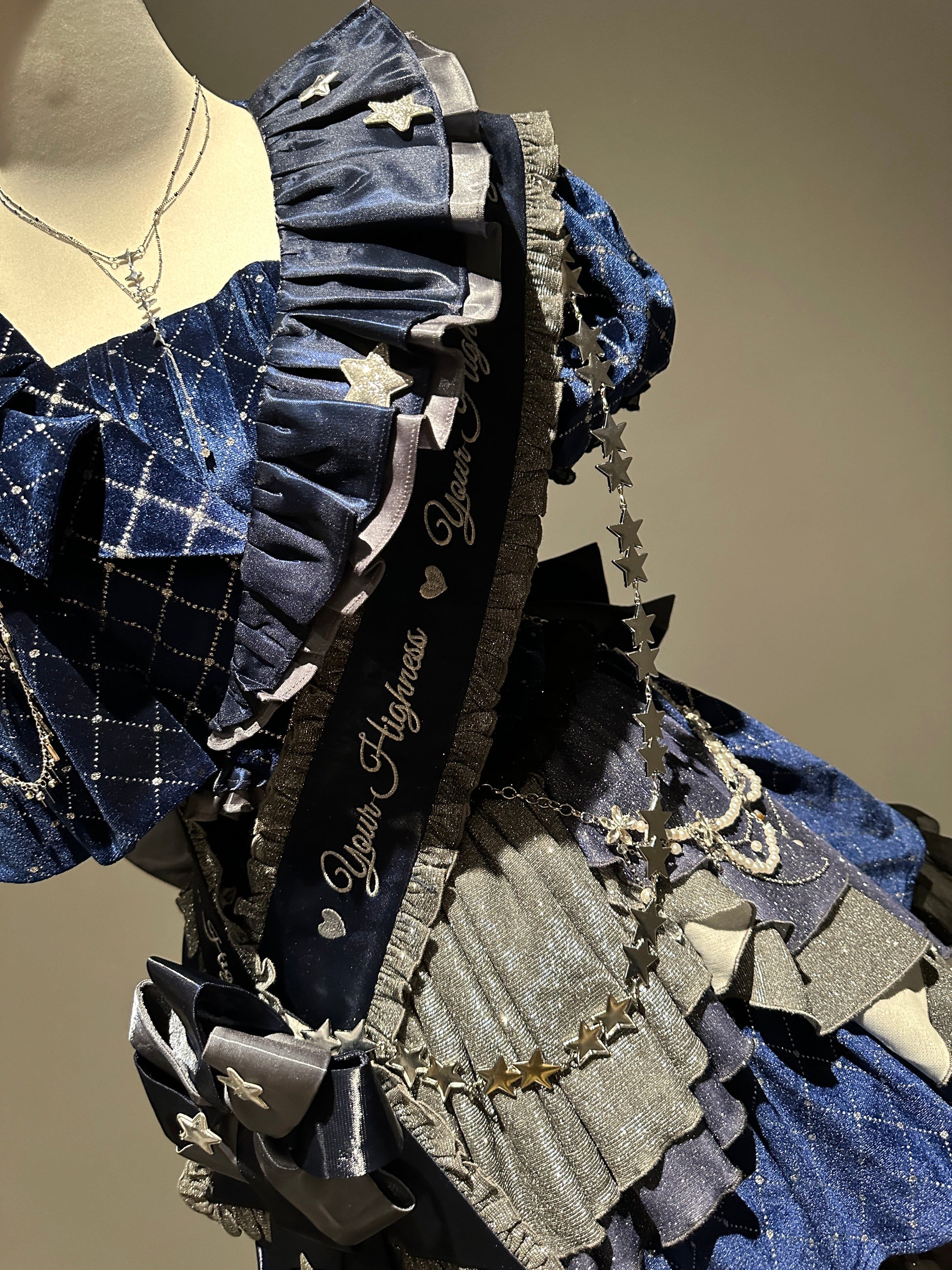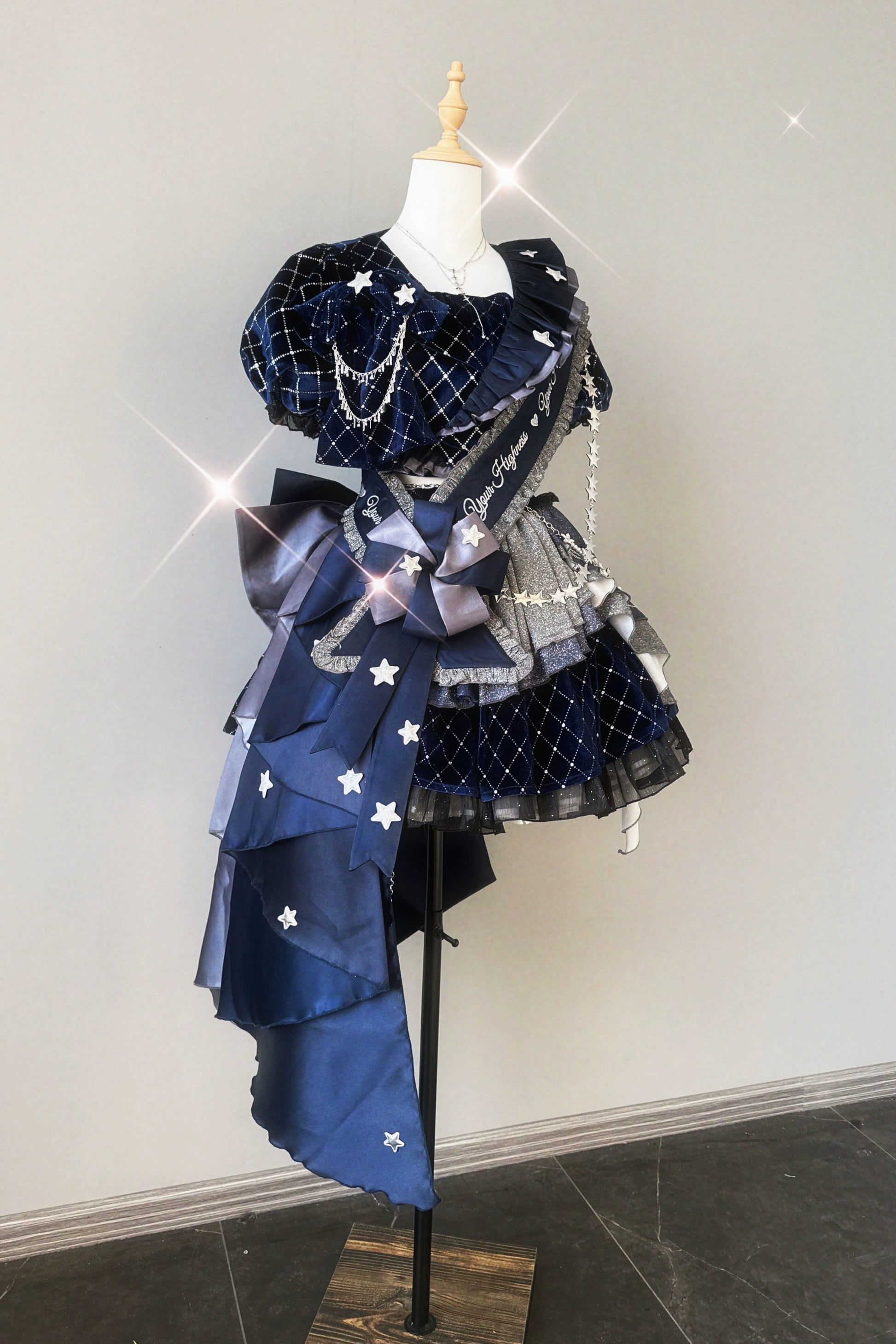 ゴージャスフルセット内容【ジャケットトップ+スカート+サッシュ帯+リボンアクセサリー+フラワーサークルバッジ+バックビックリボン+スターネックレス+取り外し可能なスター型のアクセサリー13個+スターチェーン+パールウエストチェーン+リボンのチェーンアクセサリー】太字部分のアクセサリーは全て取り外し可能です