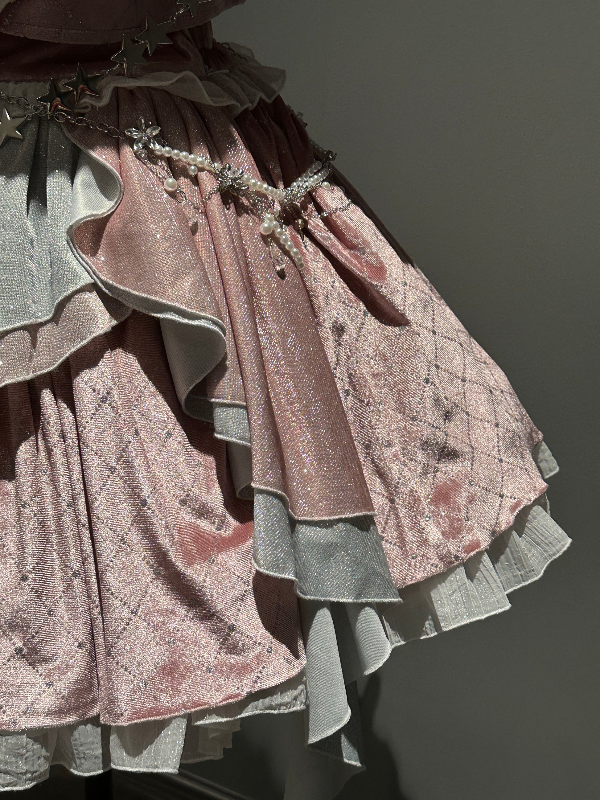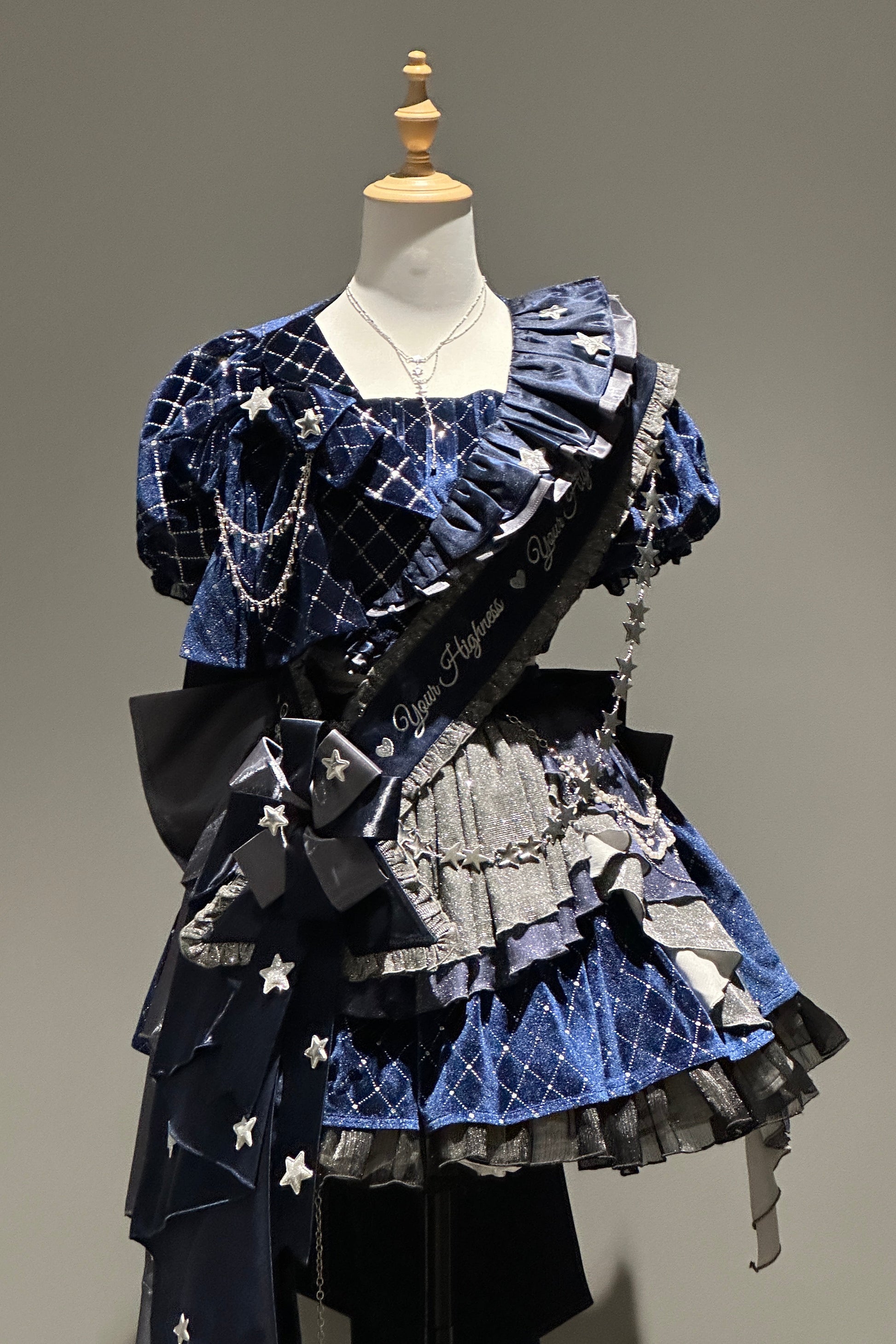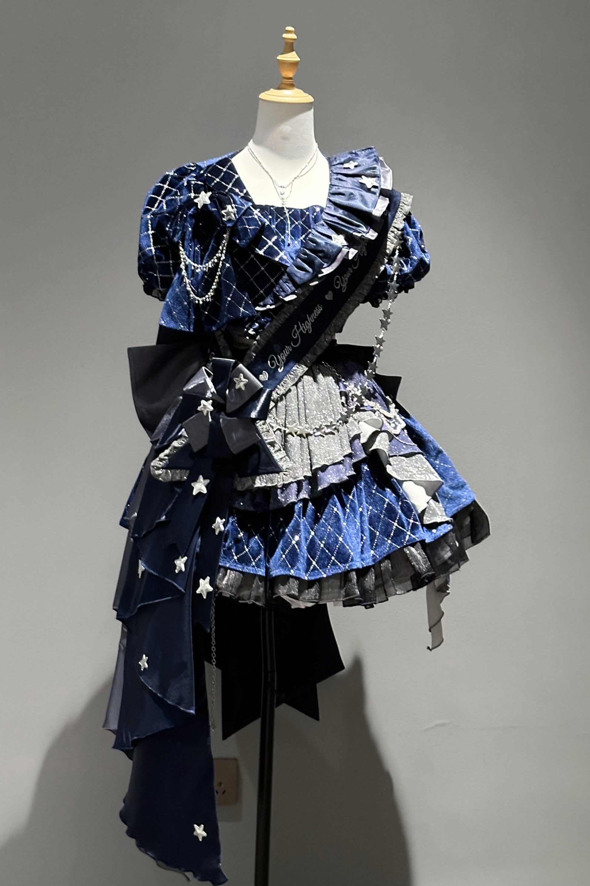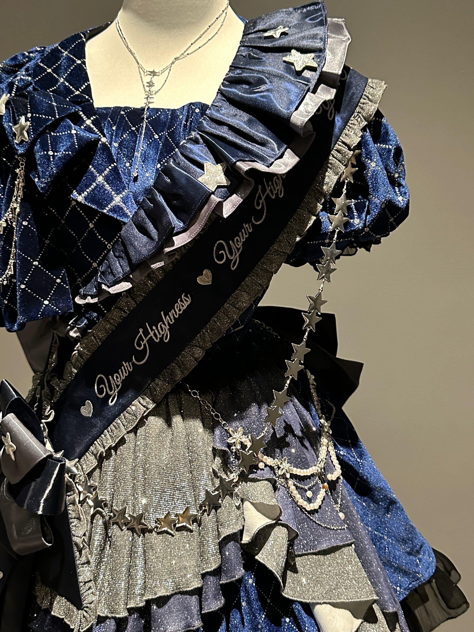 ゴージャスフルセット内容【ジャケットトップ+スカート+サッシュ帯+リボンアクセサリー+フラワーサークルバッジ+バックビックリボン+スターネックレス+取り外し可能なスター型のアクセサリー13個+スターチェーン+パールウエストチェーン+リボンのチェーンアクセサリー】太字部分のアクセサリーは全て取り外し可能です