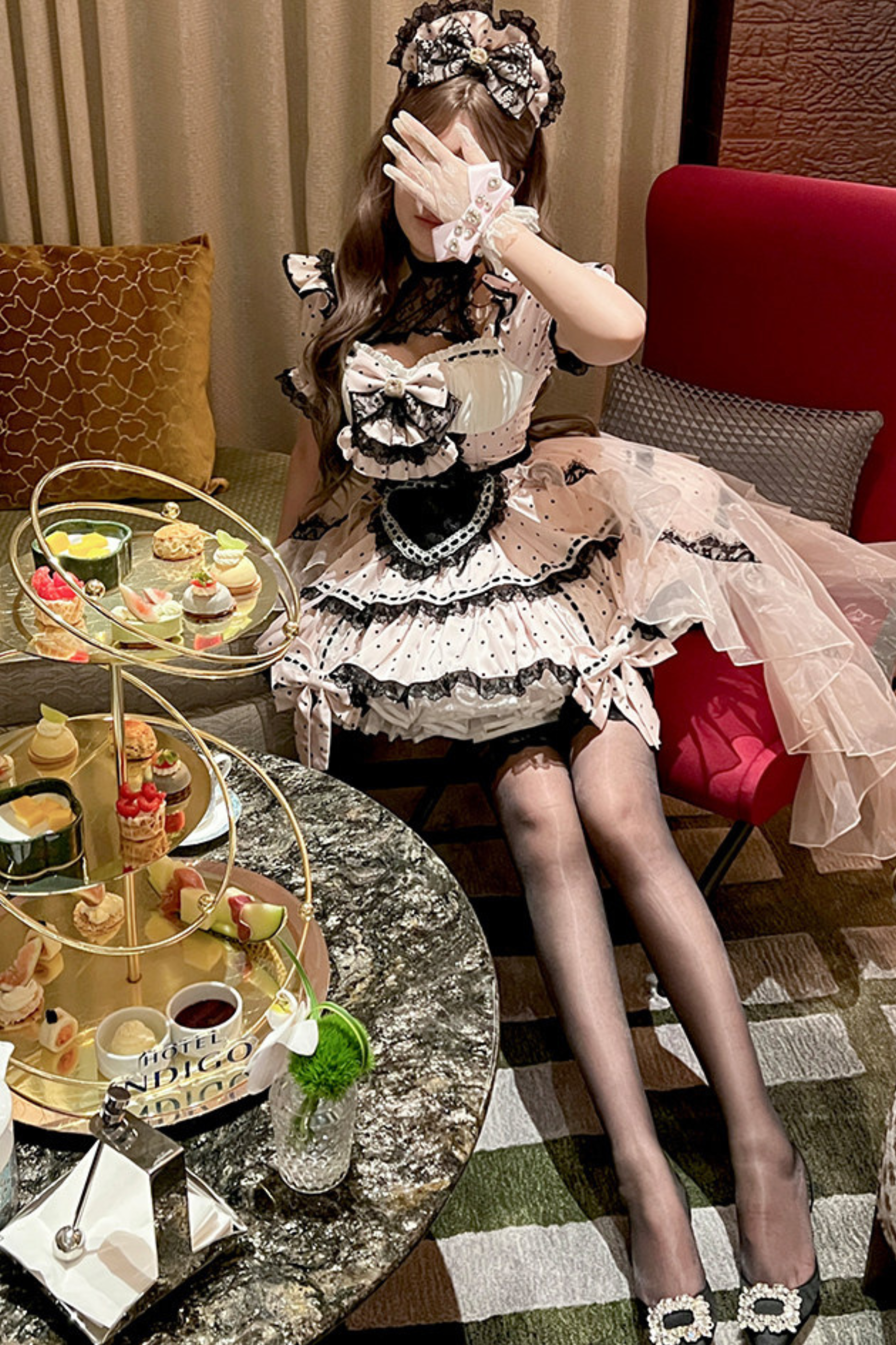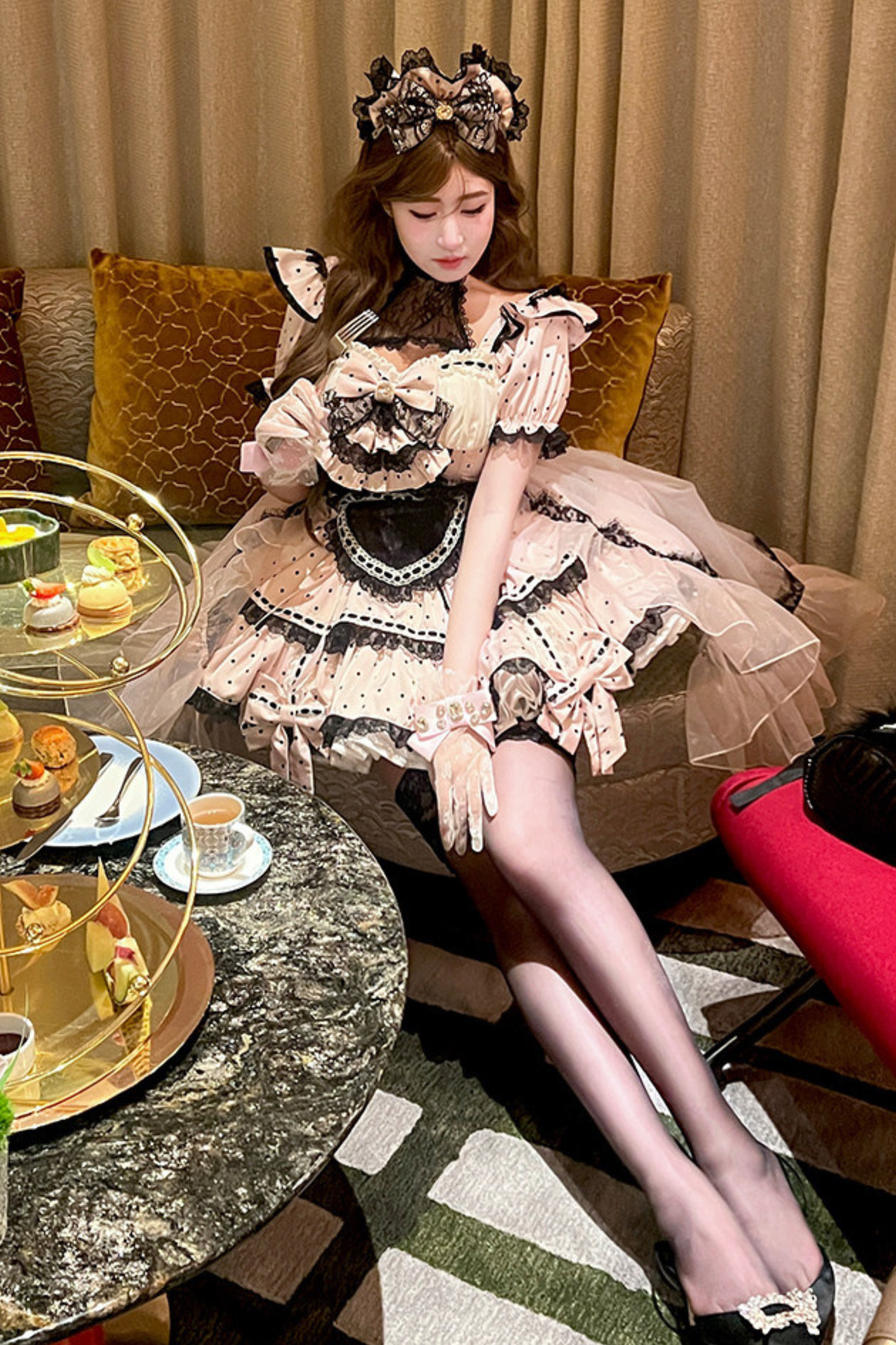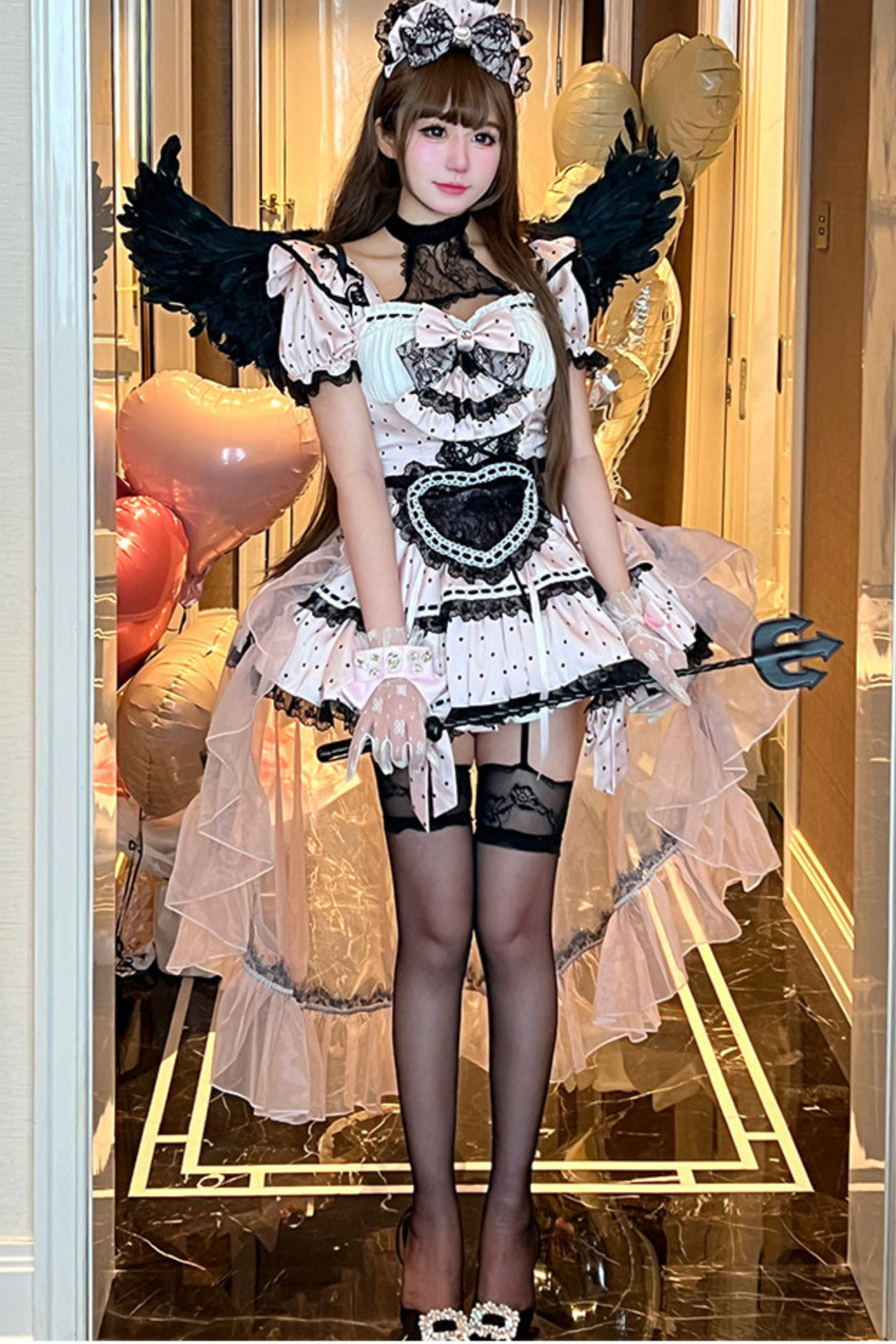 スイートリトルドットメイドロリータドレス+エプロン+ヘッドアクセサリー+ベール