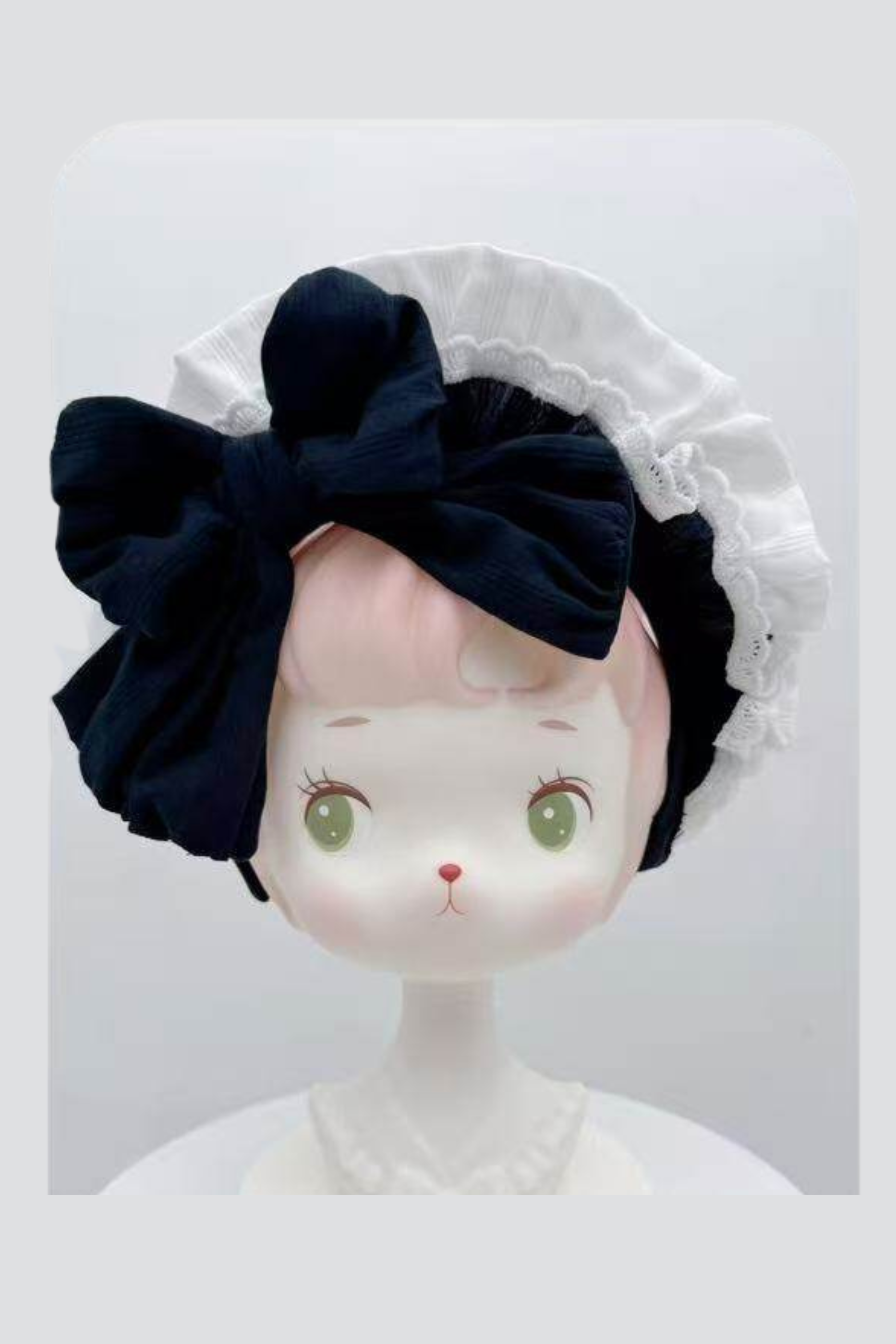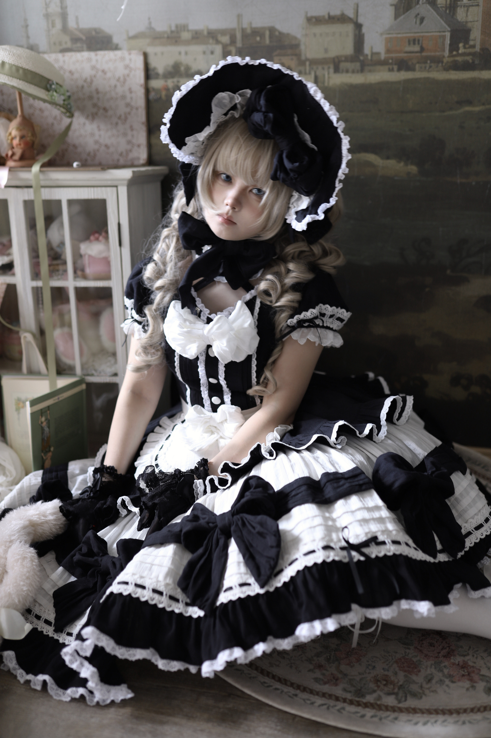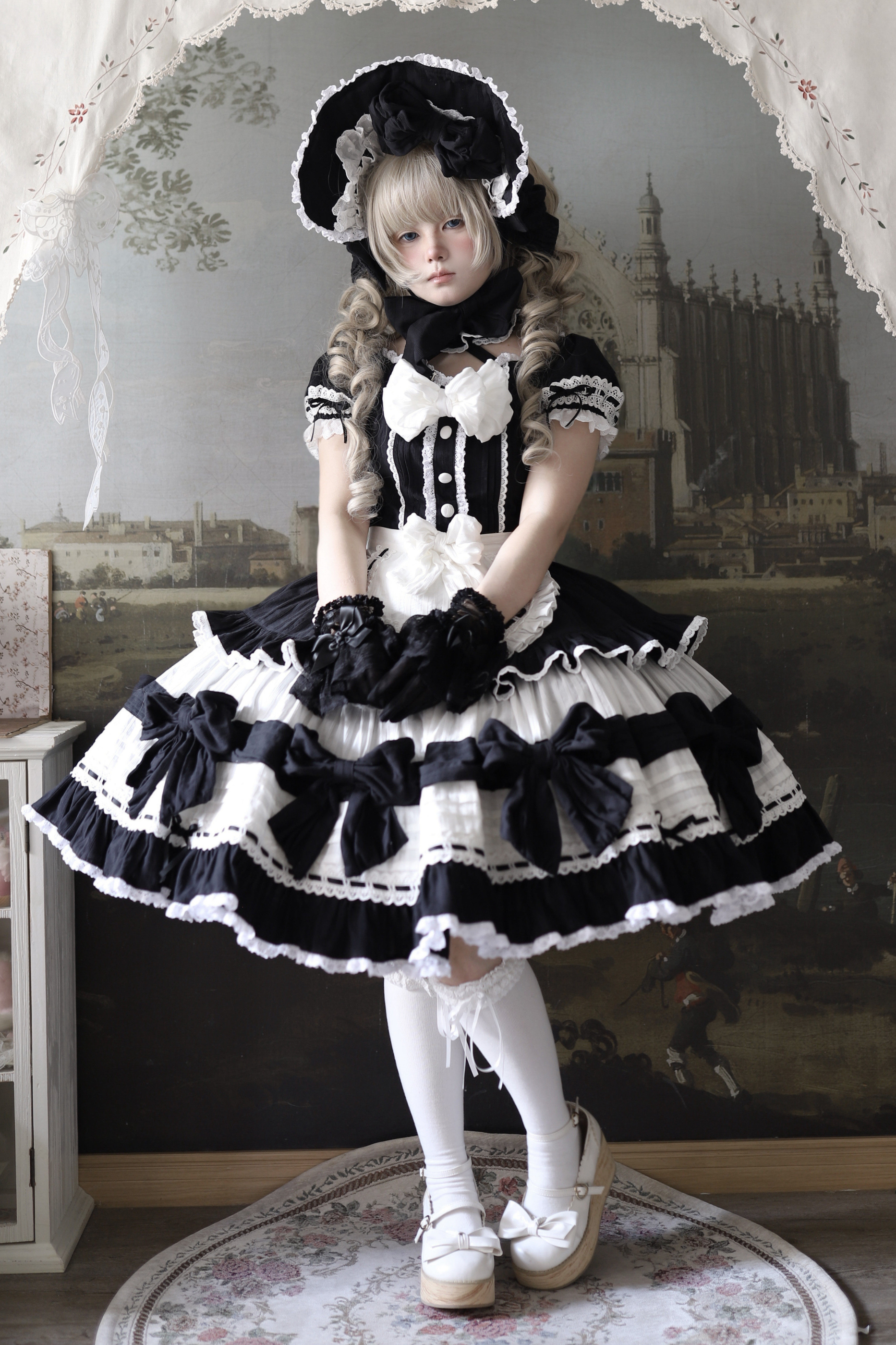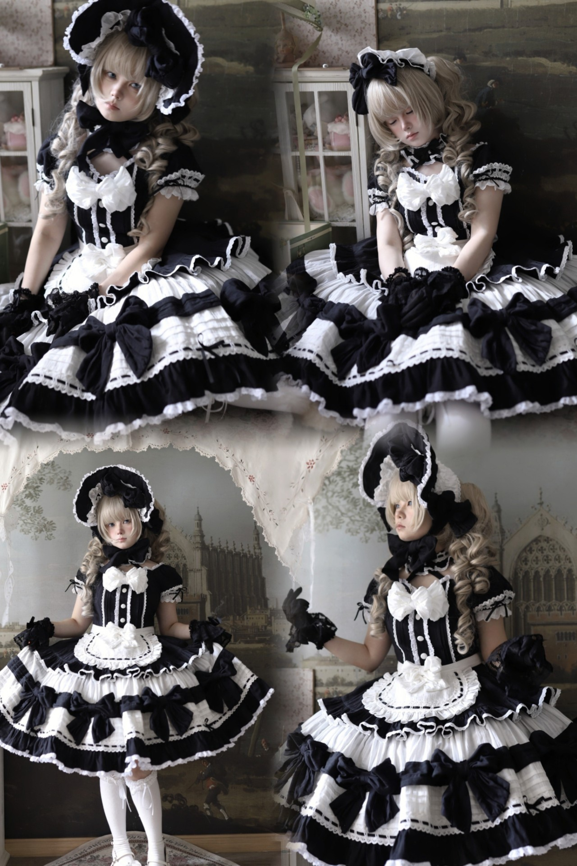 モノクロドールロリータドレス+カチューシャ+ボンネット+クリップ