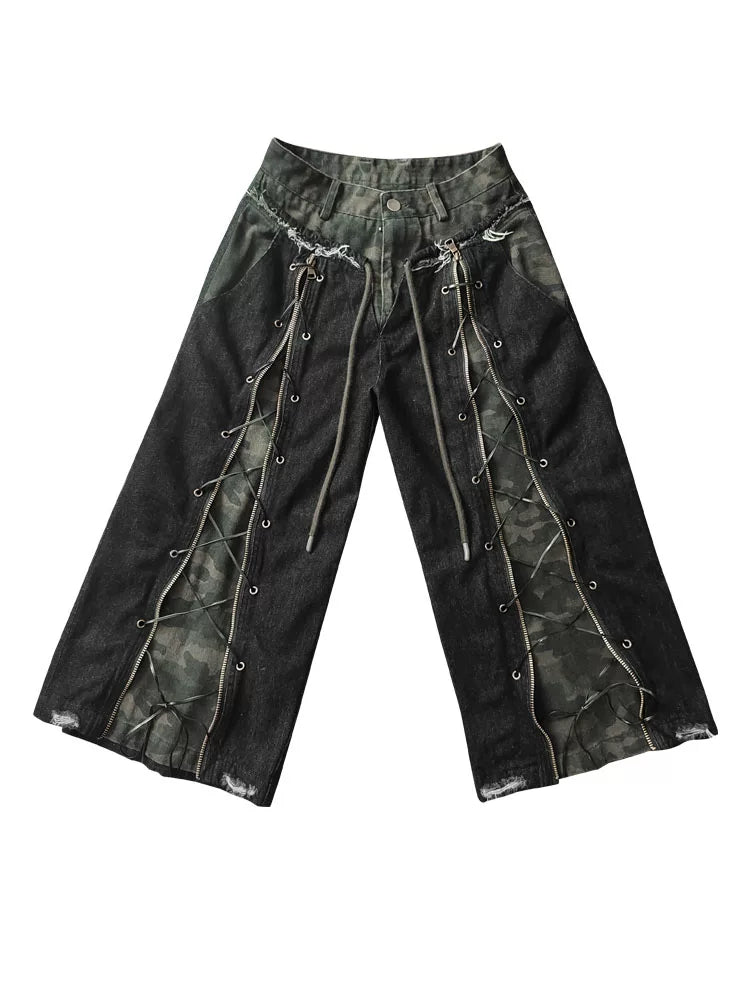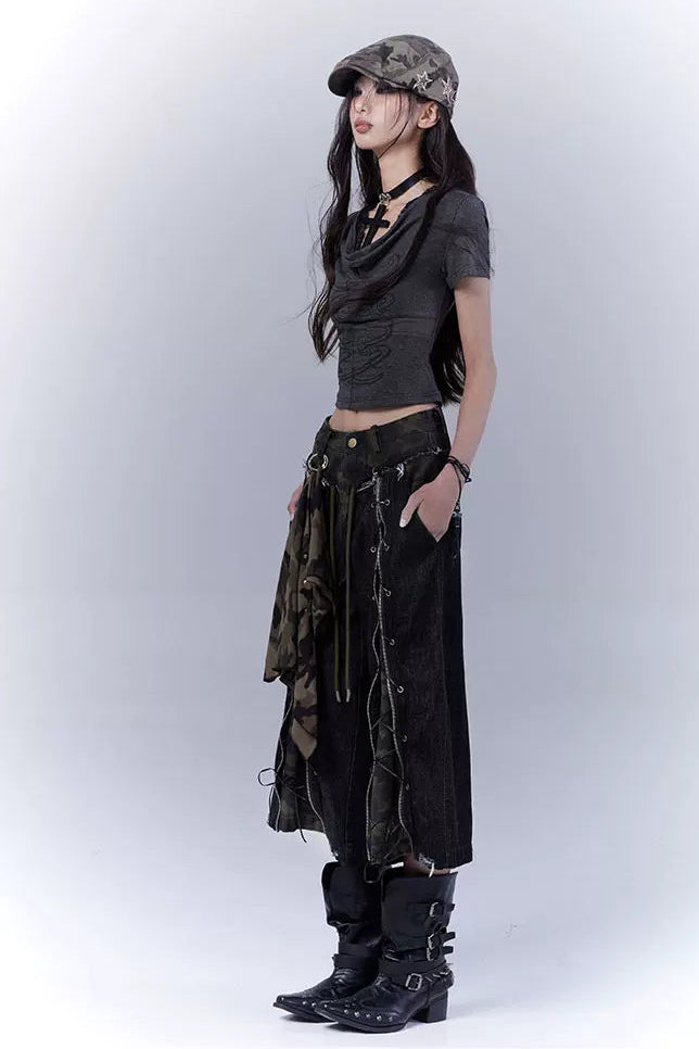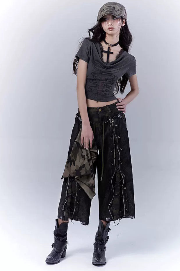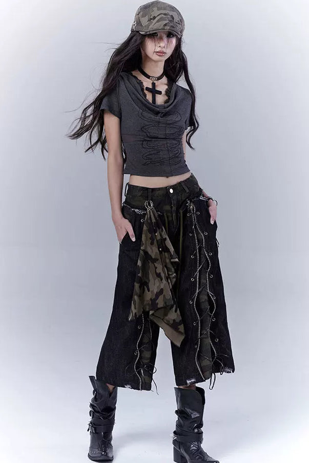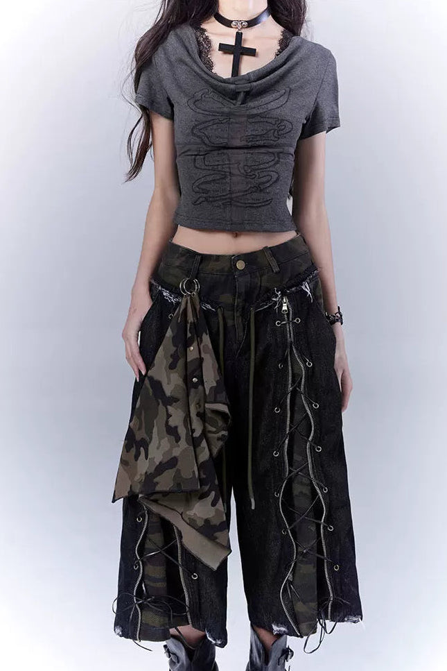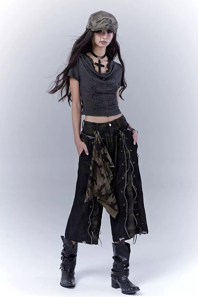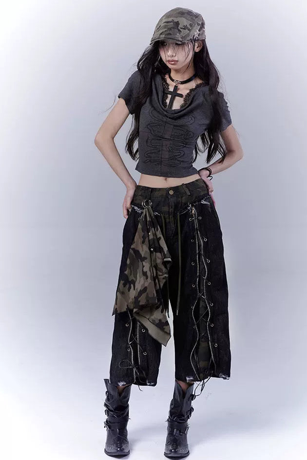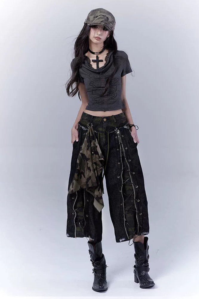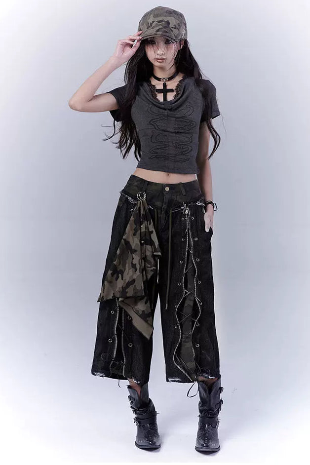 カモフラージュディストレストクロップドパンツ+スカーフ