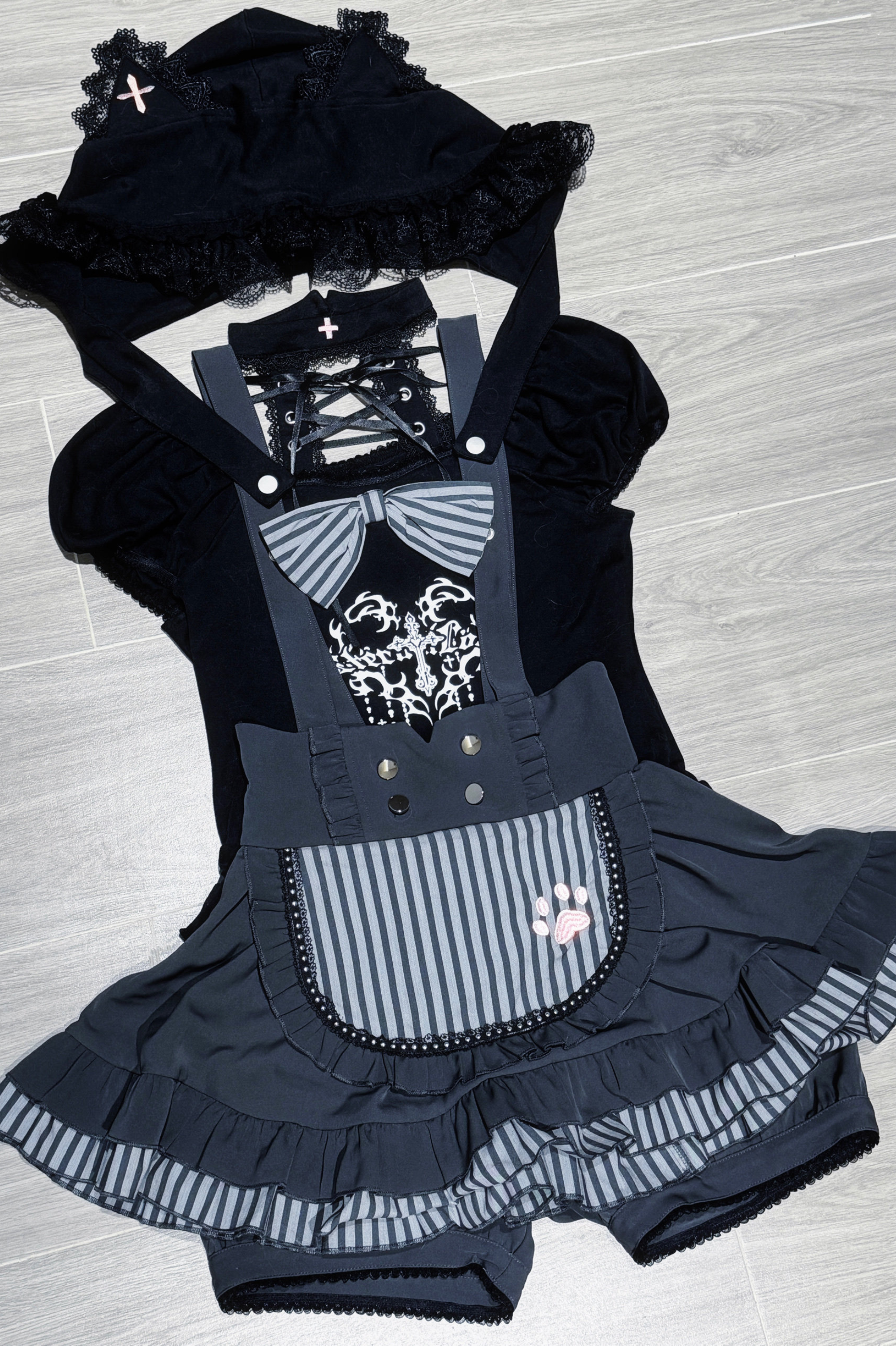 キュートキャットパフスリーブトップス+サスペンダースカート+パンツ+ハット