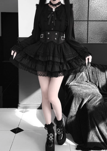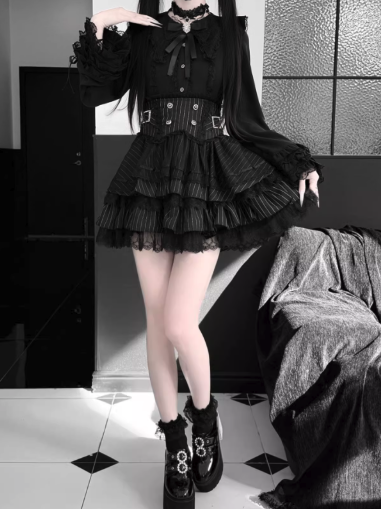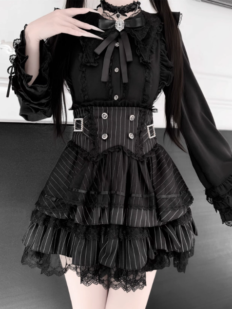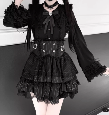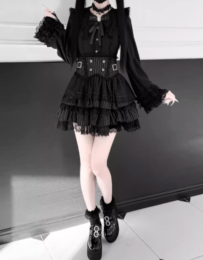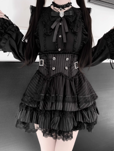 【1月7日予約締切】ジュエルリボンベルスリーブシャツ+ブラックストライプティアードスカート+セットアップ