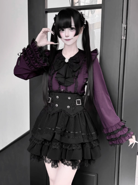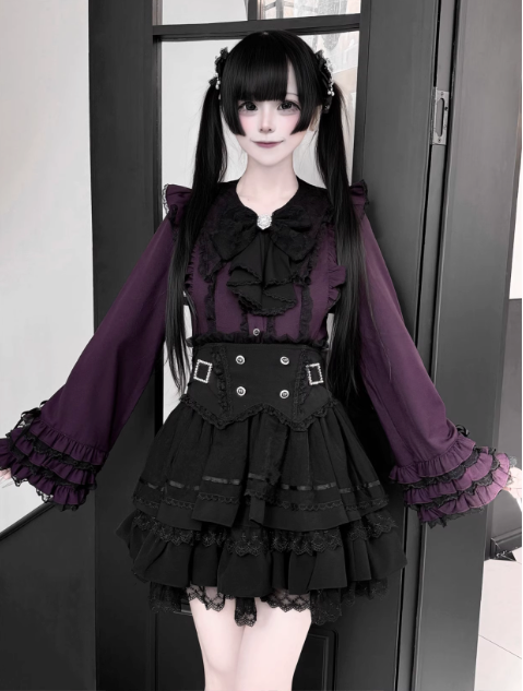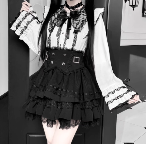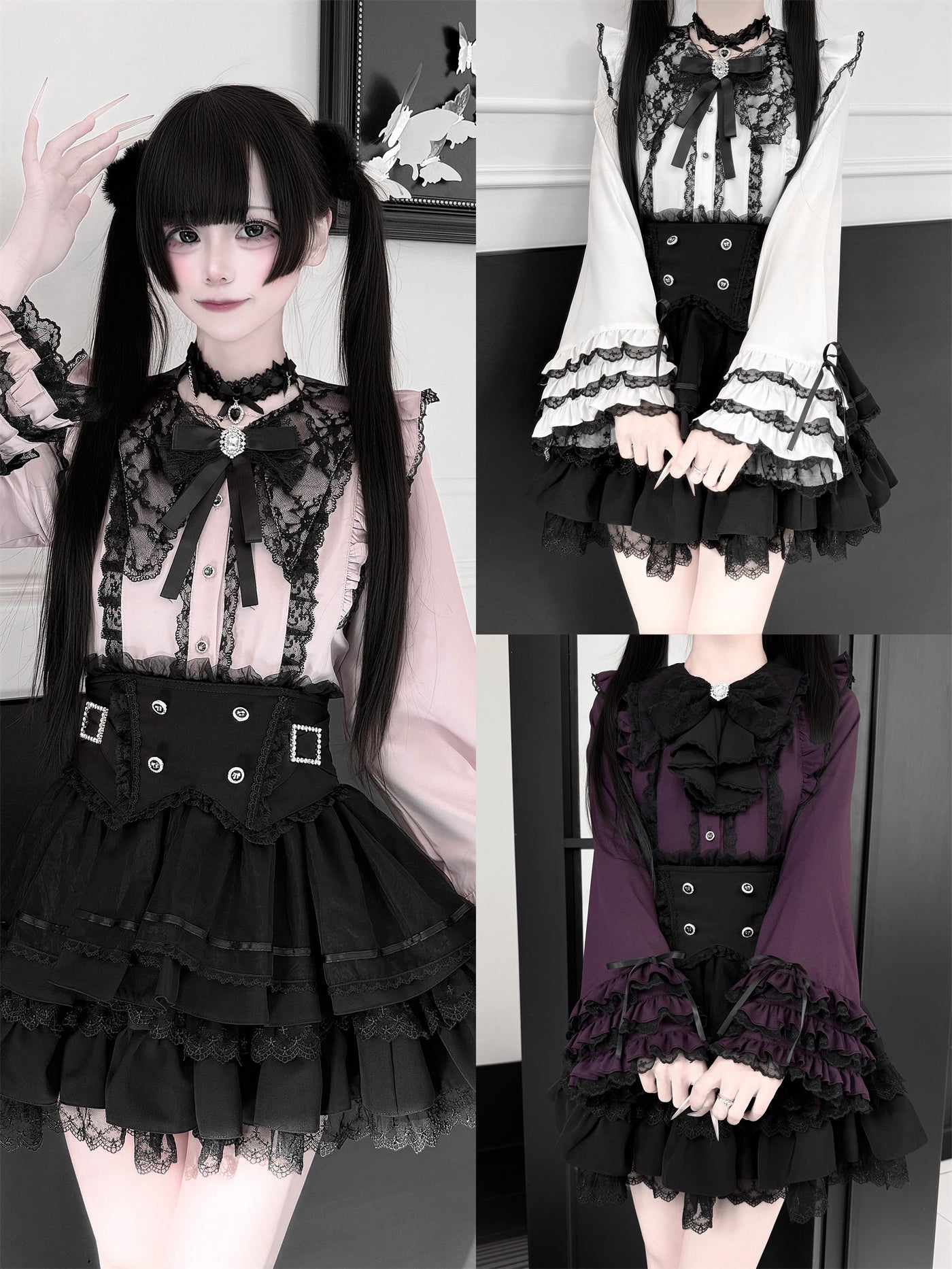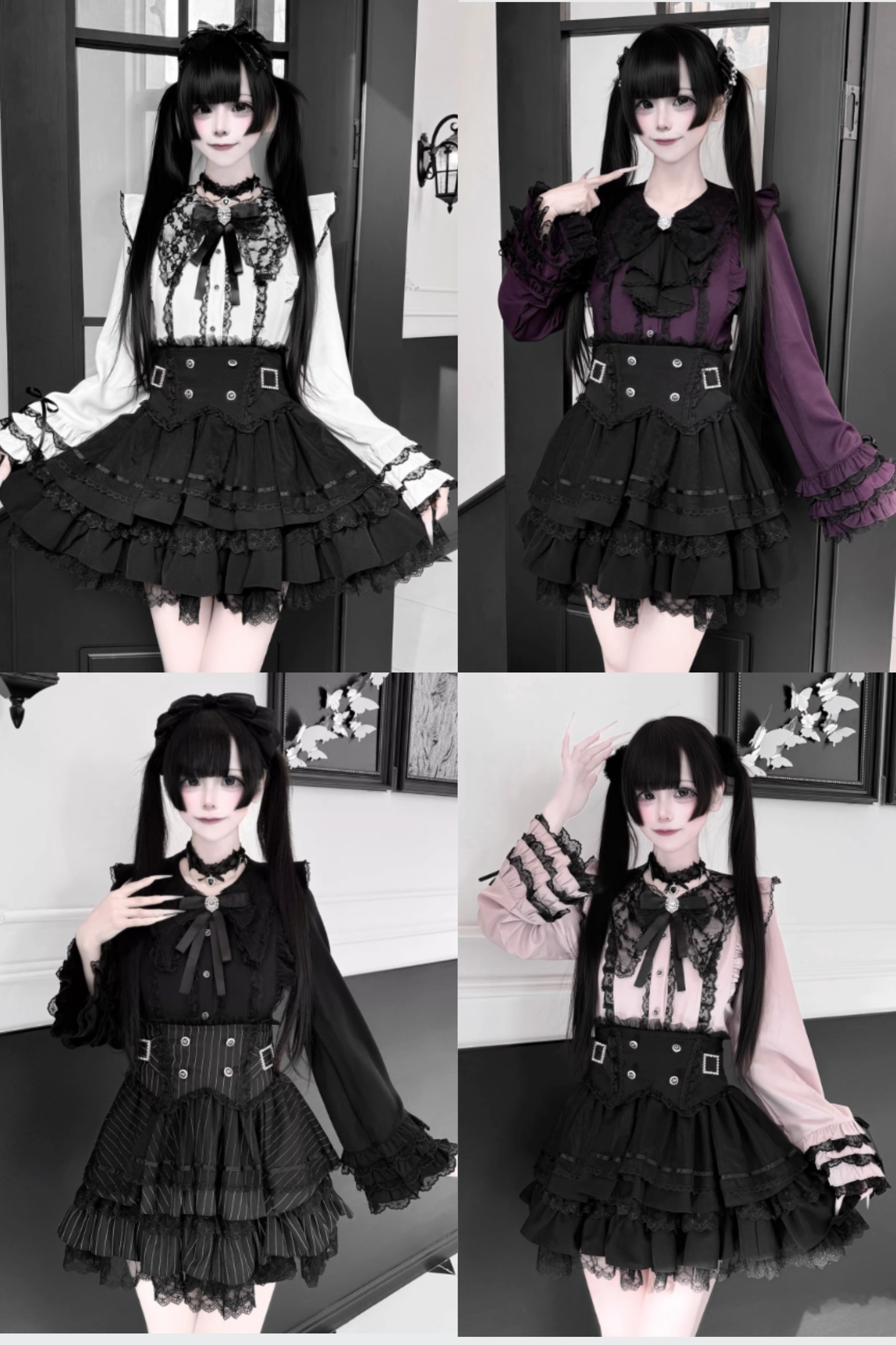 ❤︎【1月7日予約締切】ジュエルリボンベルスリーブシャツ+ブラックストライプティアードスカート+セットアップ❤︎                                                ⚠️人気商品のためお届けに2-3ヶ月ほどかかってしまう場合がございます