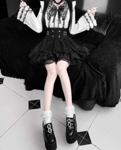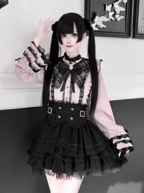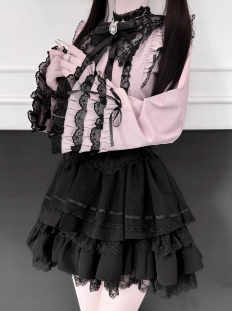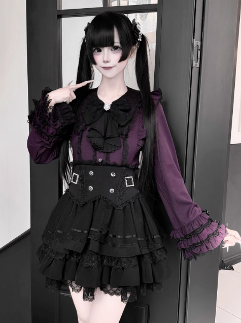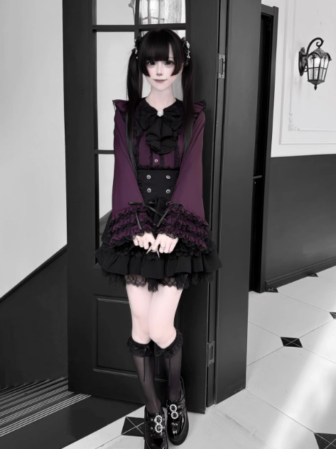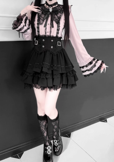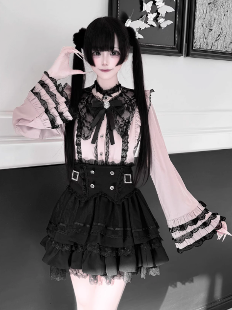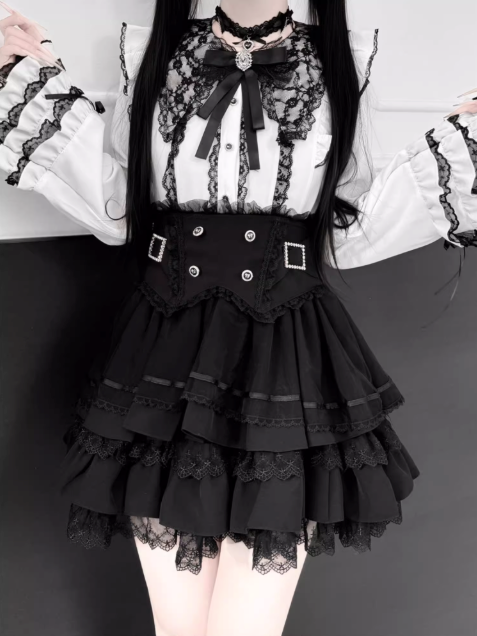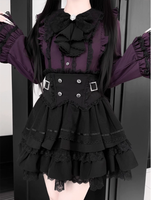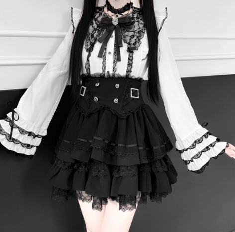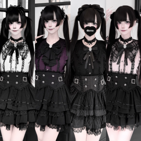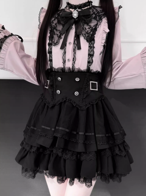 ❤︎【1月7日予約締切】ジュエルリボンベルスリーブシャツ+ブラックストライプティアードスカート+セットアップ❤︎                                                ⚠️人気商品のためお届けに2-3ヶ月ほどかかってしまう場合がございます