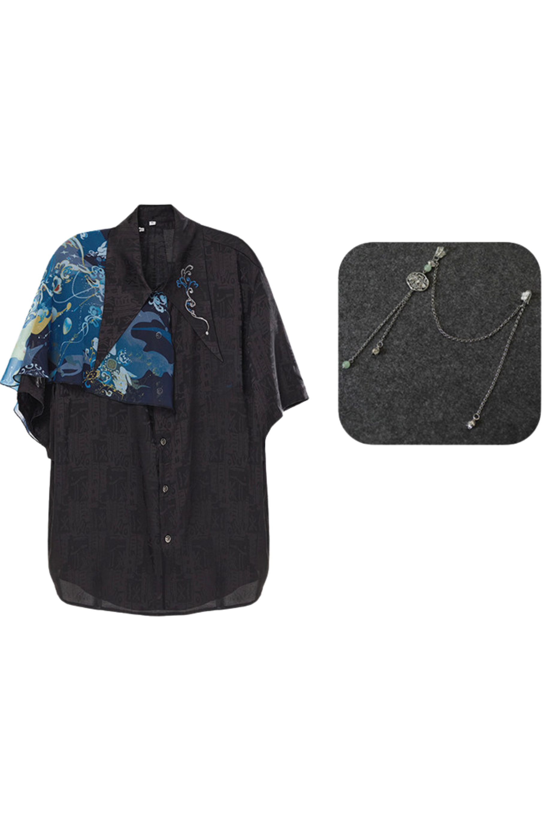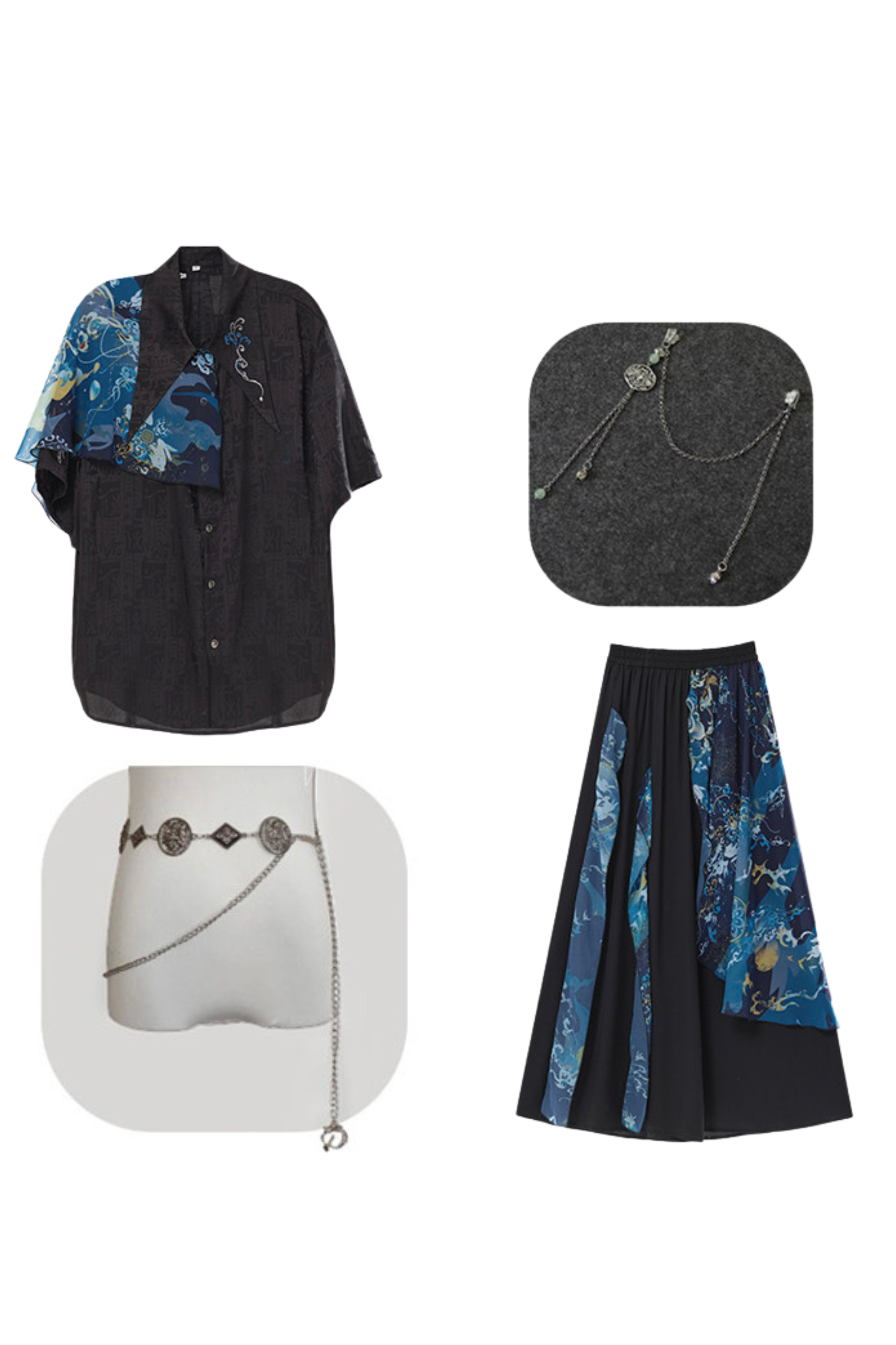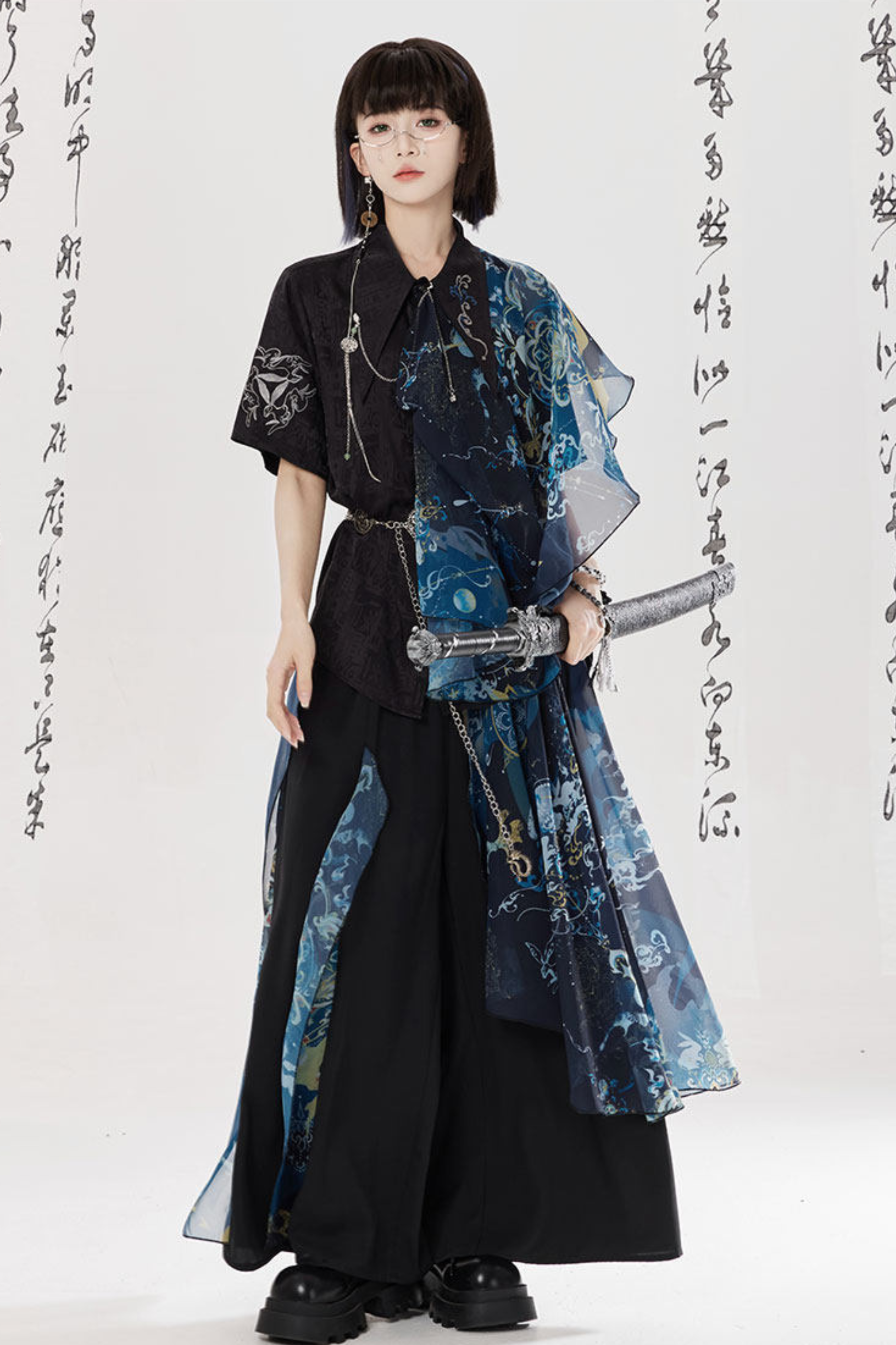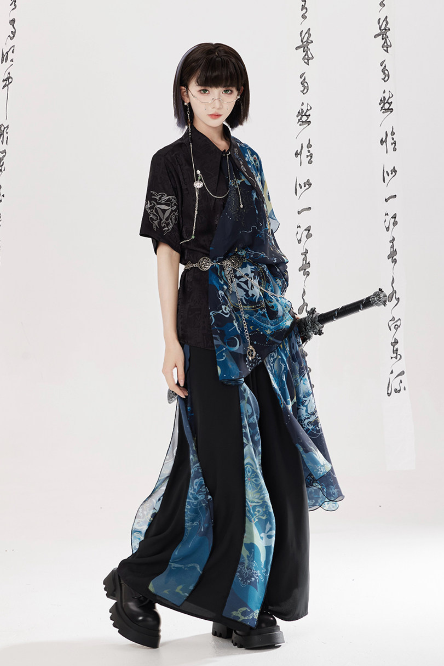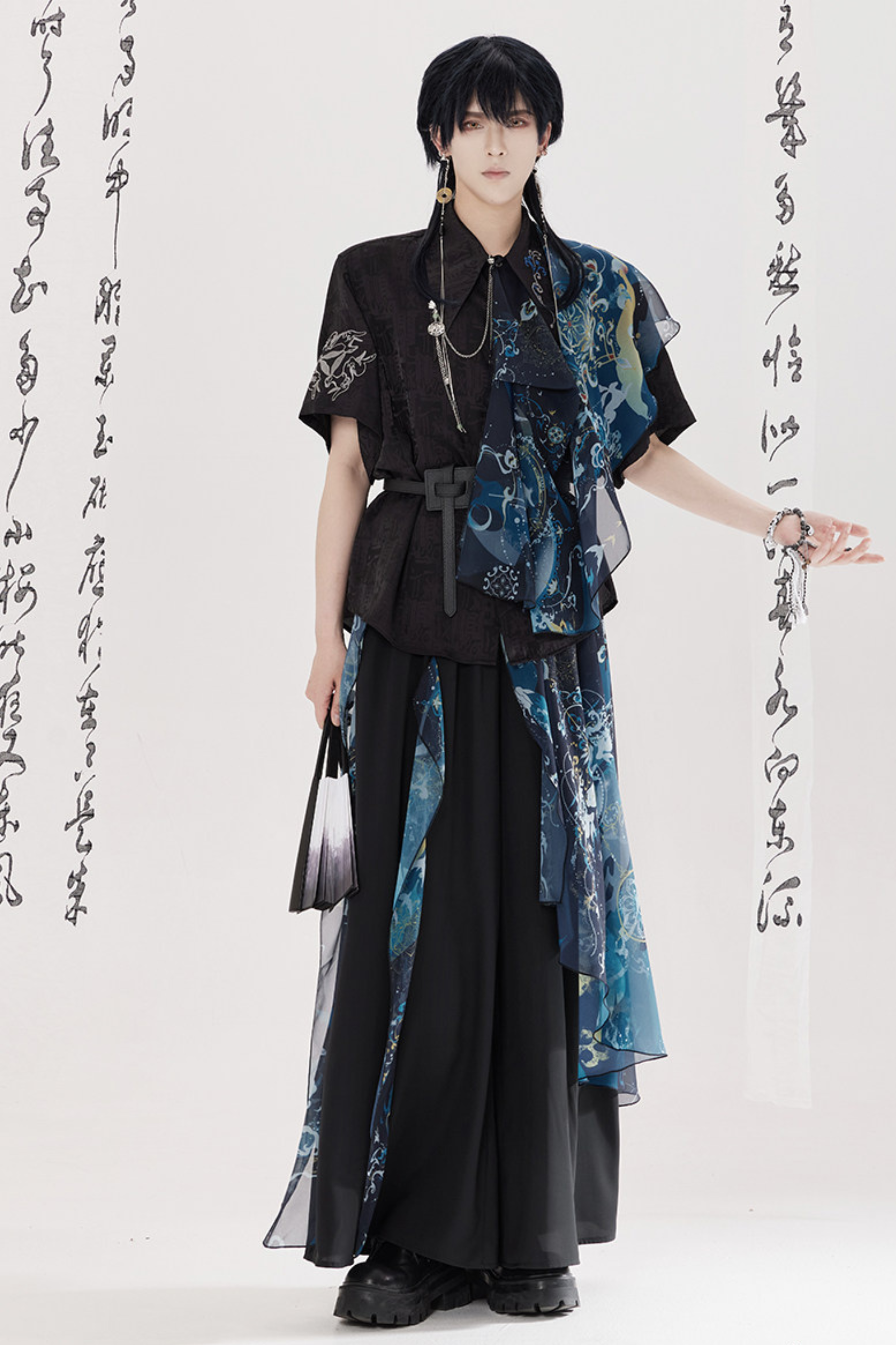 ダークチャイナシャツ+ワイドレッグパンツ+チェーン+ベルト