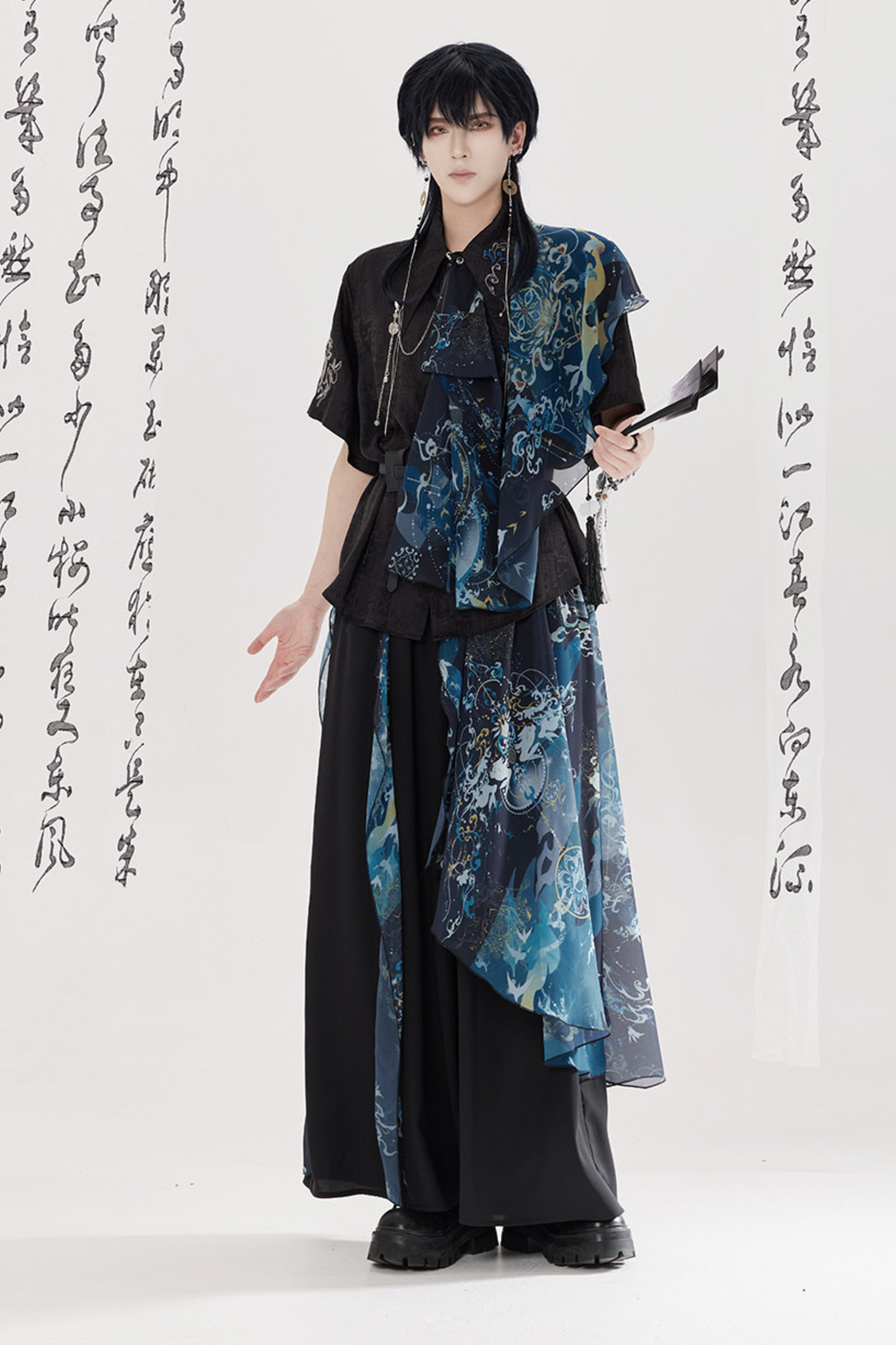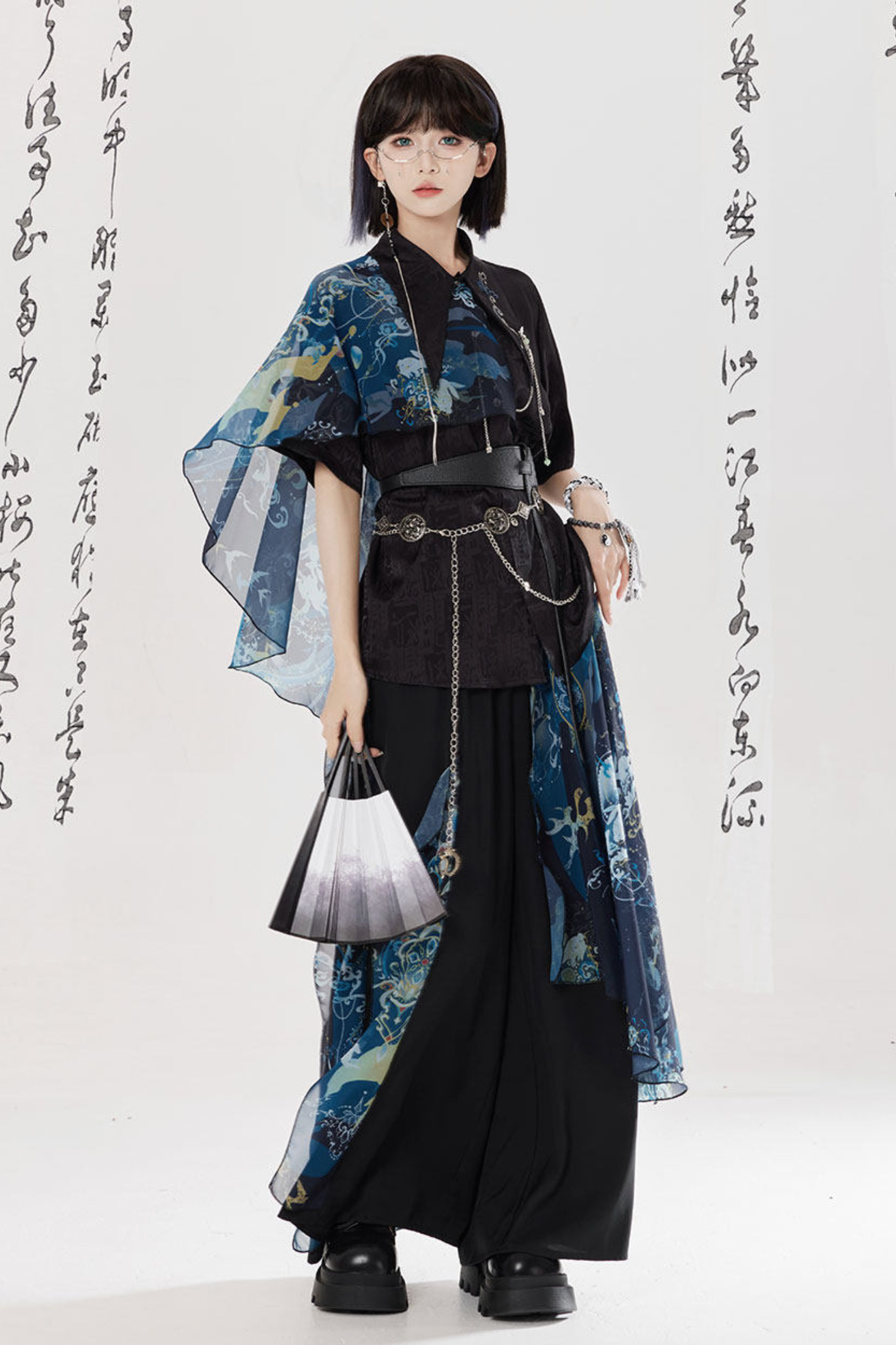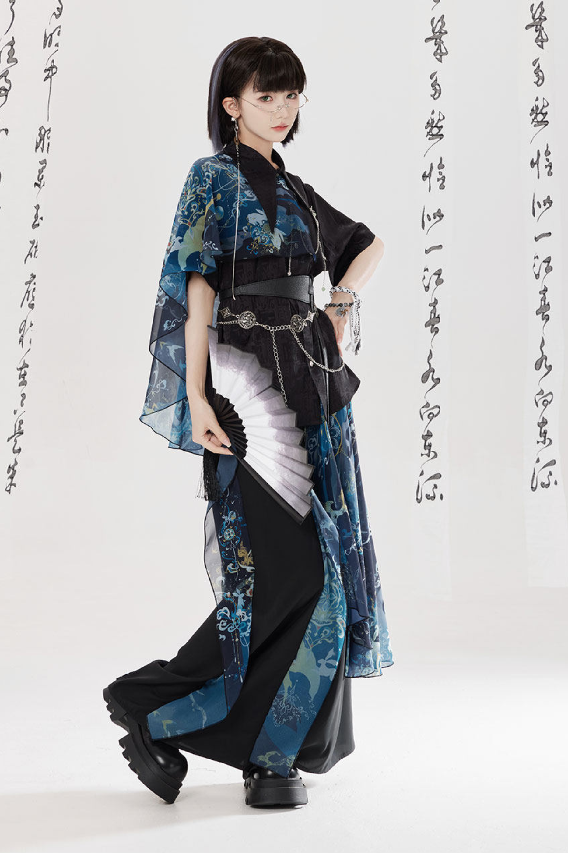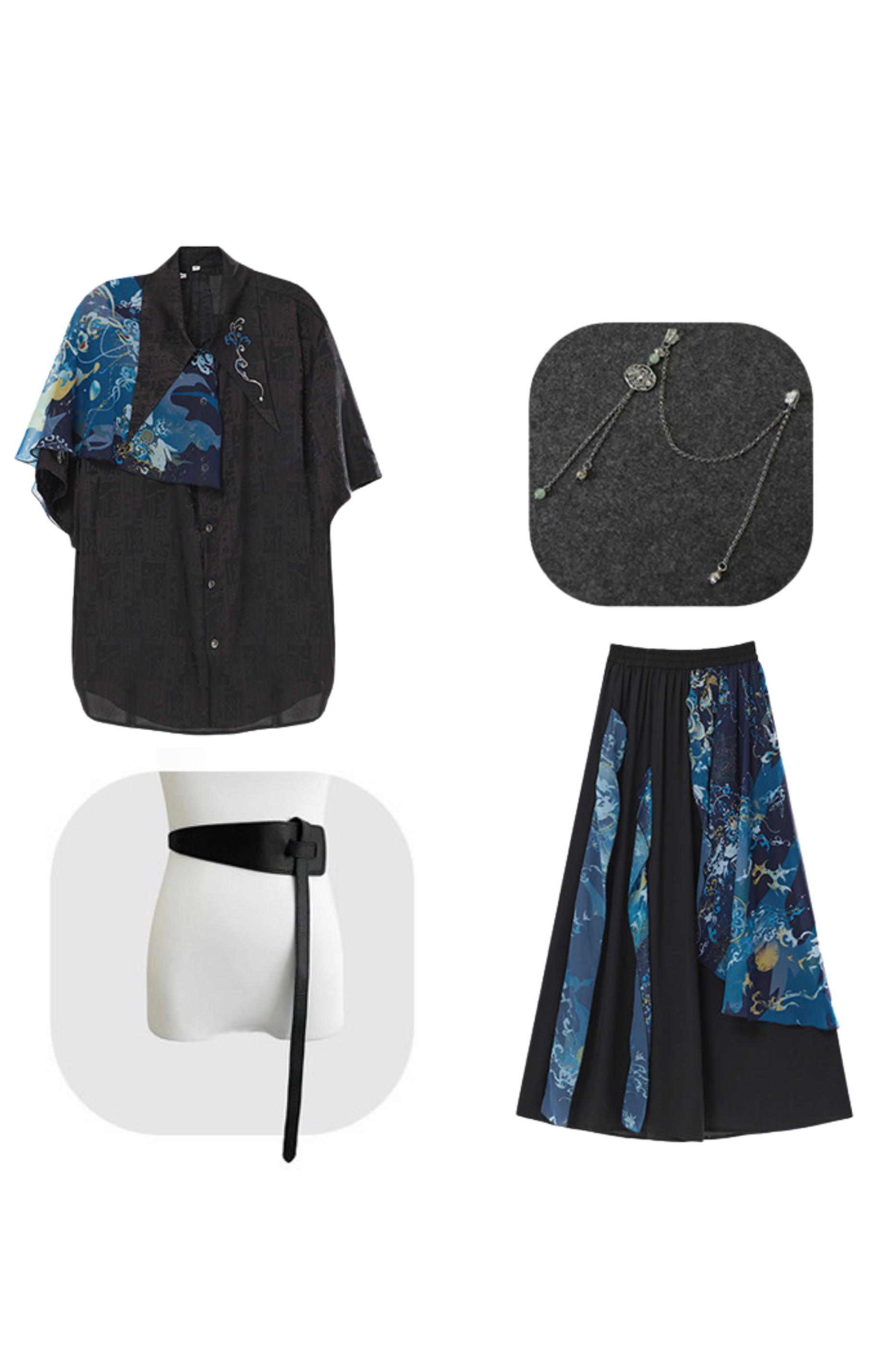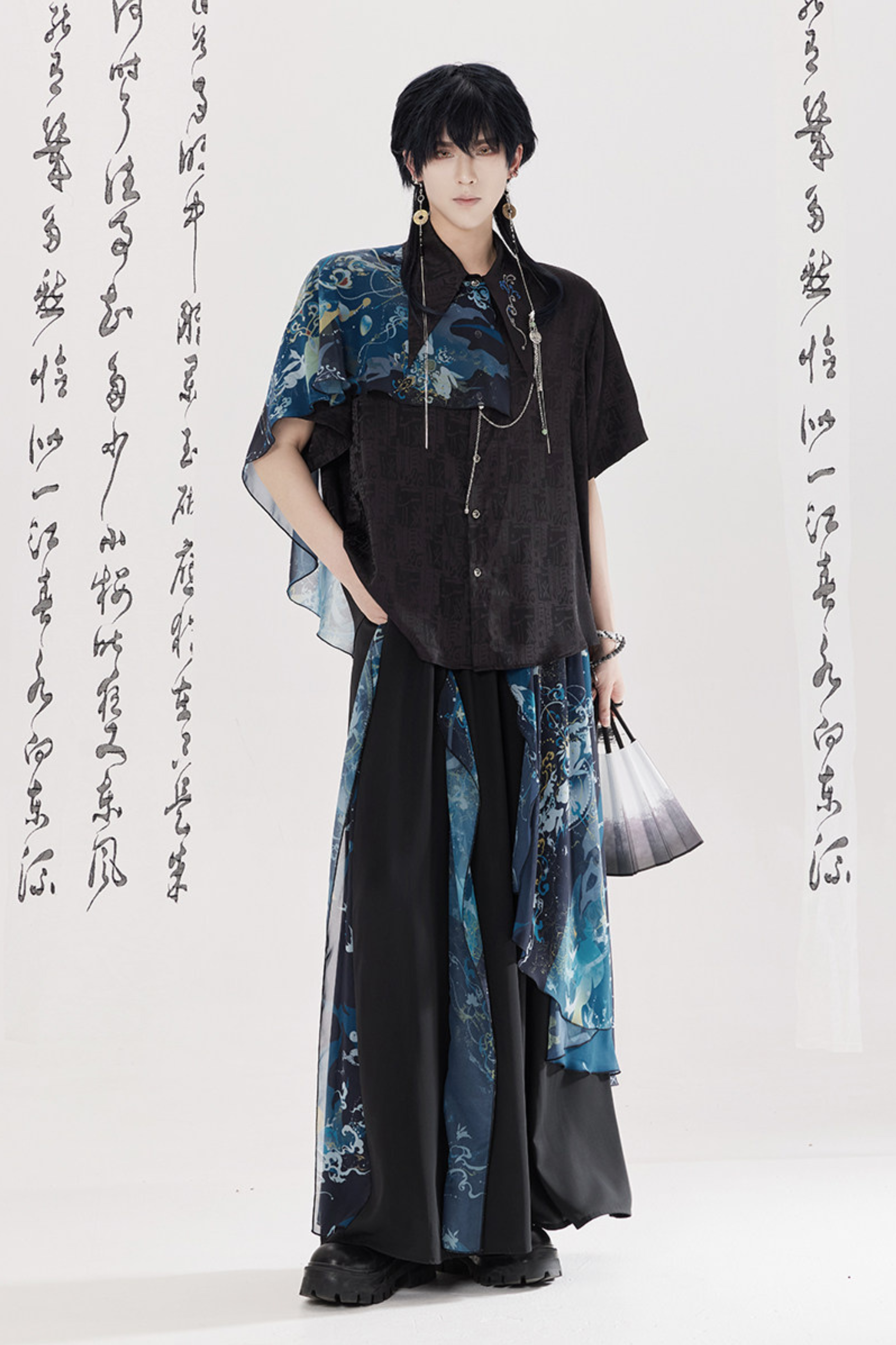 ダークチャイナシャツ+ワイドレッグパンツ+チェーン+ベルト