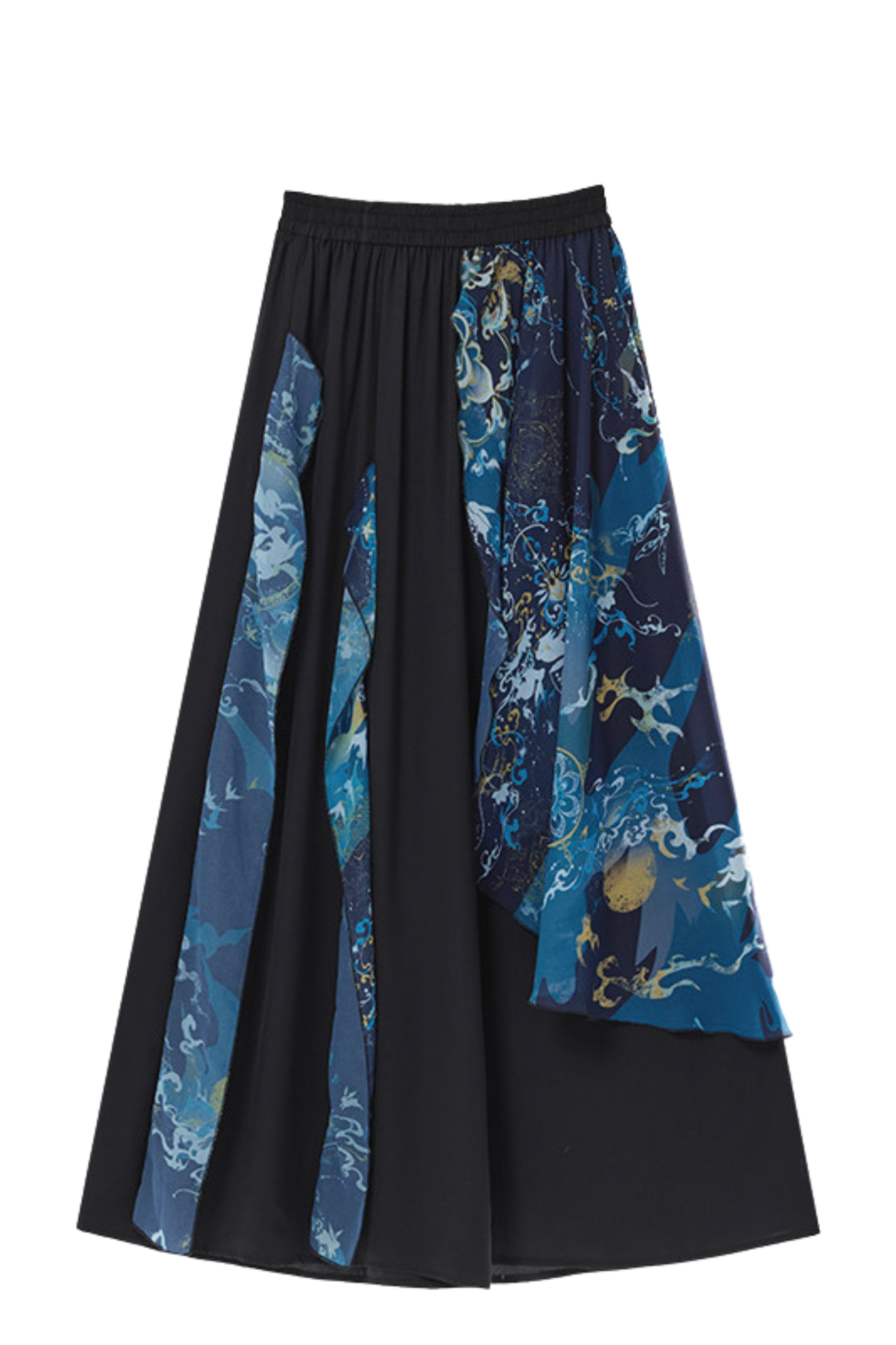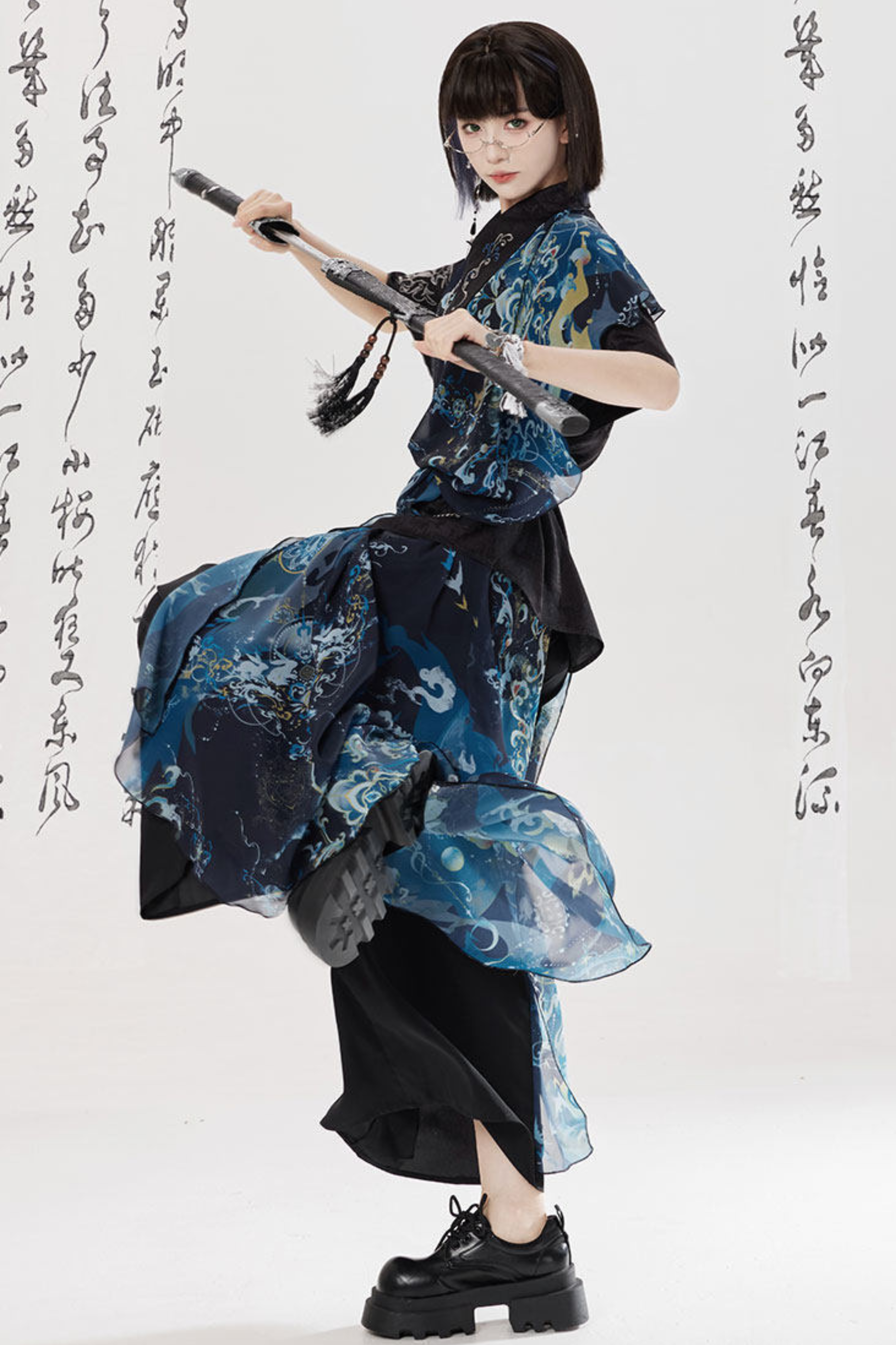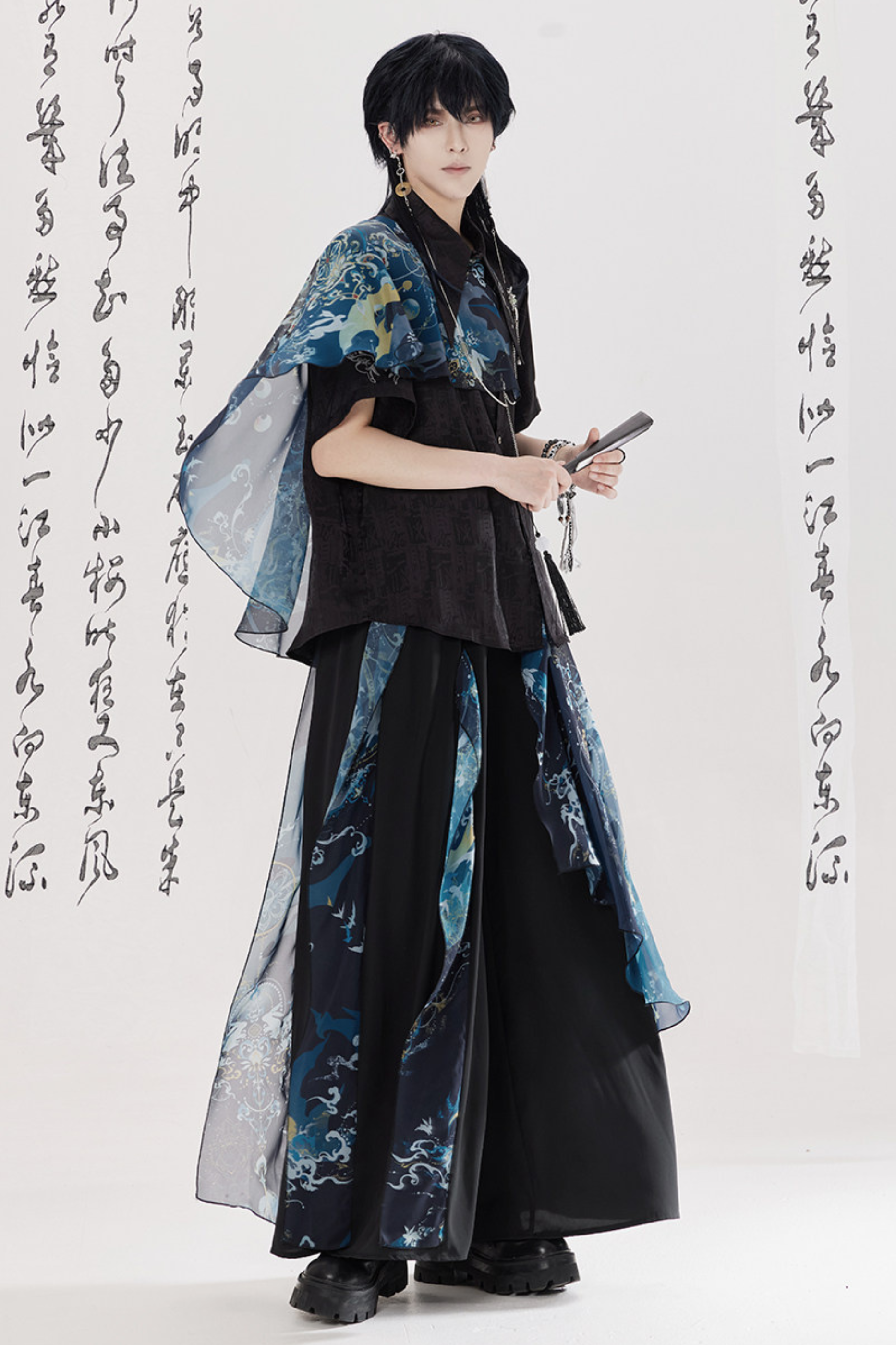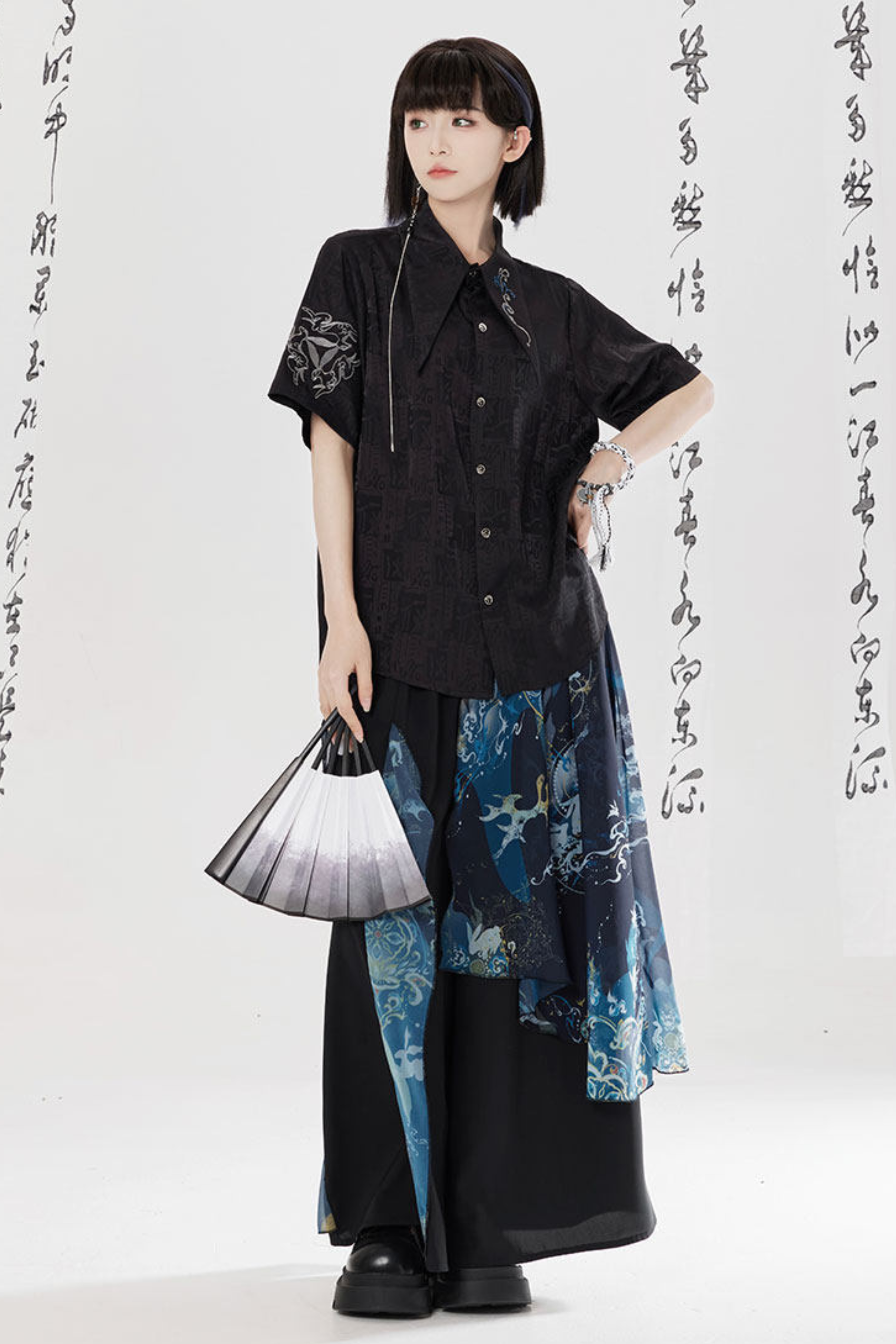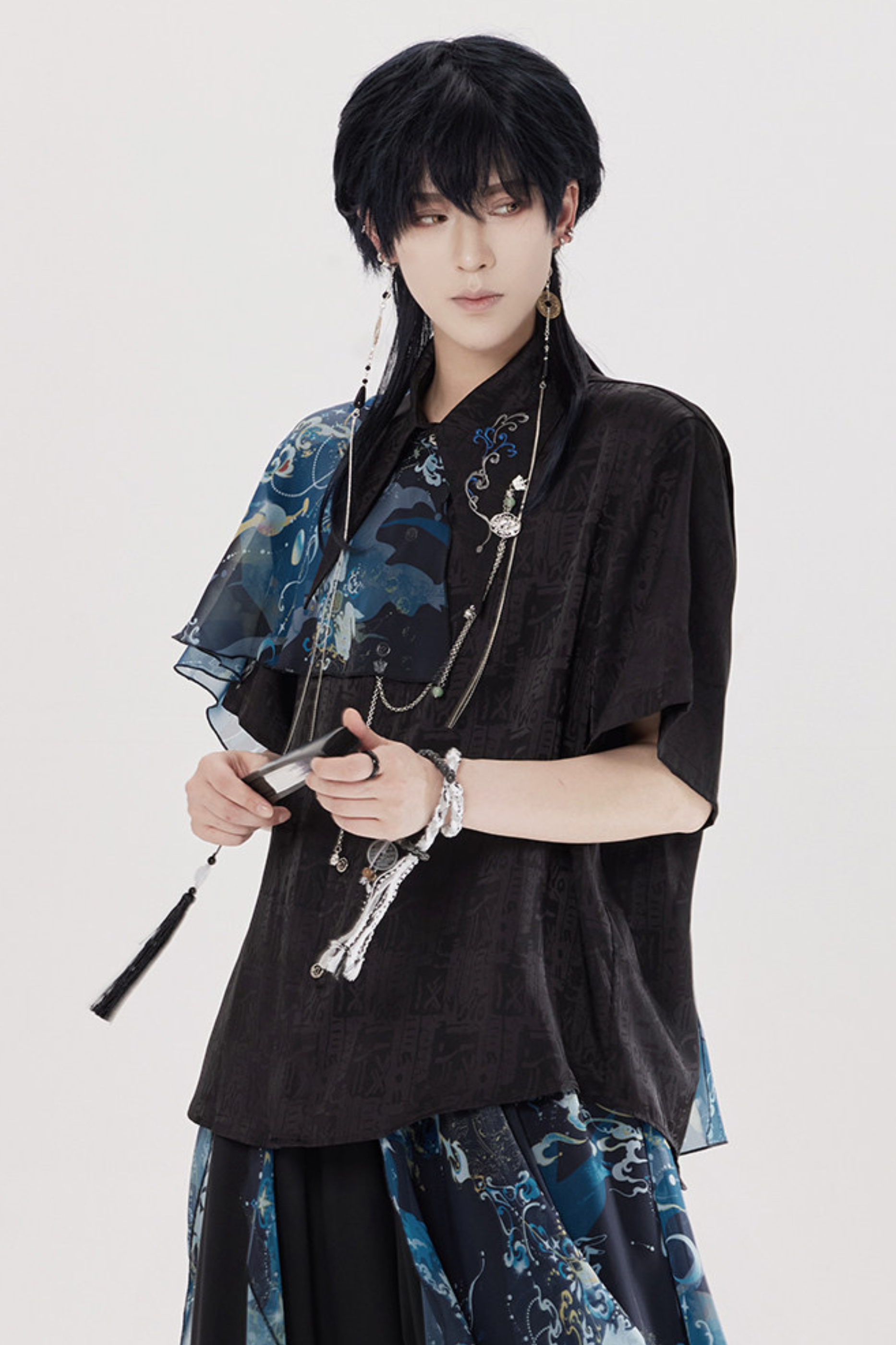 ダークチャイナシャツ+ワイドレッグパンツ+チェーン+ベルト