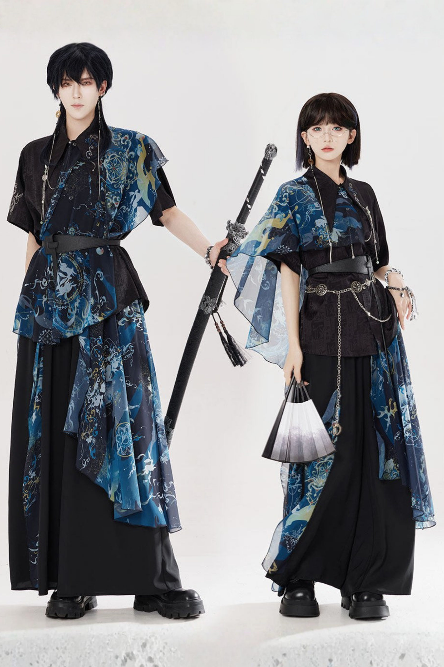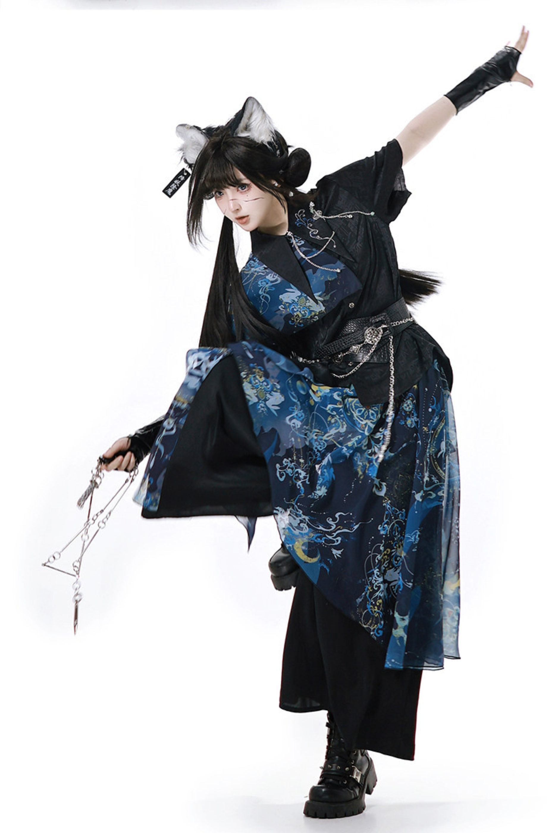 ❤ダークチャイナシャツ+ワイドレッグパンツ+チェーン+ベルト❤