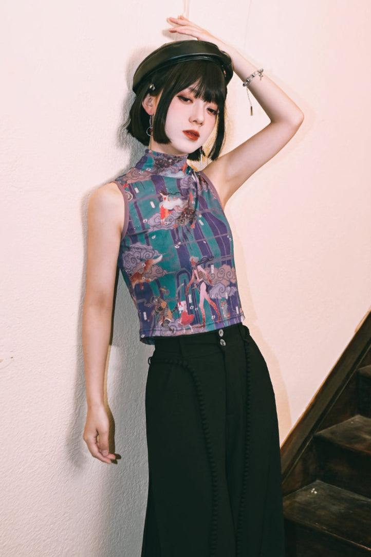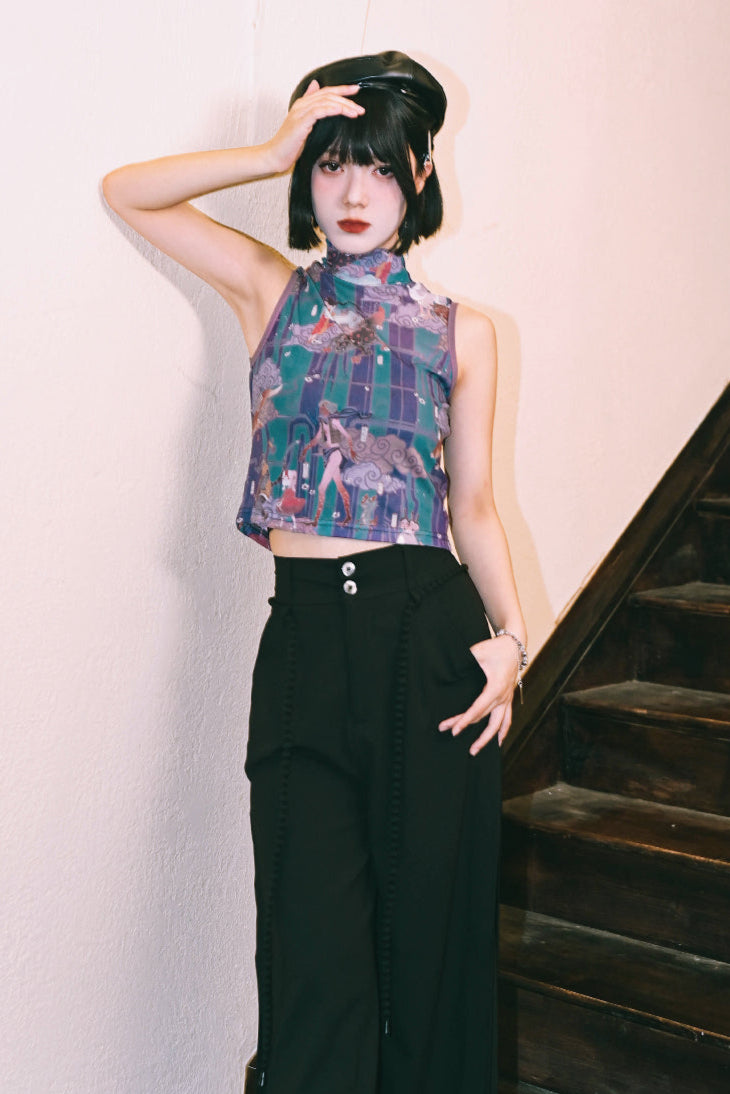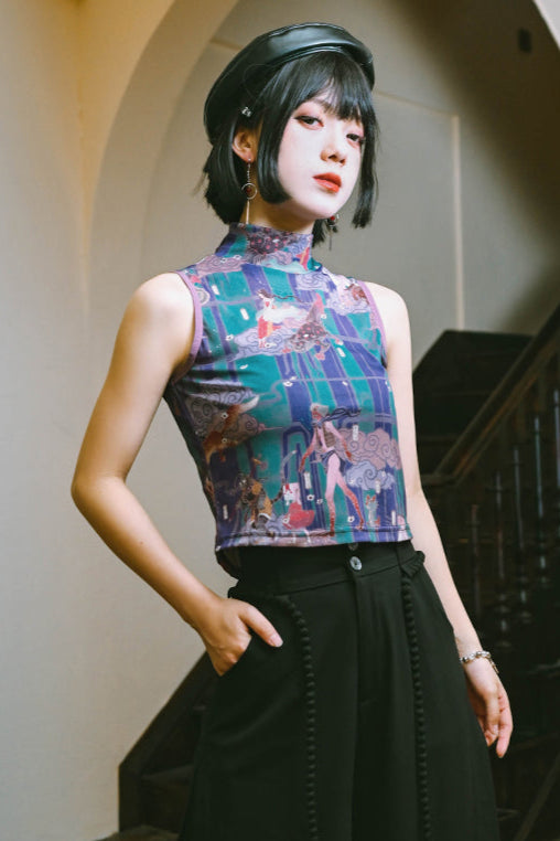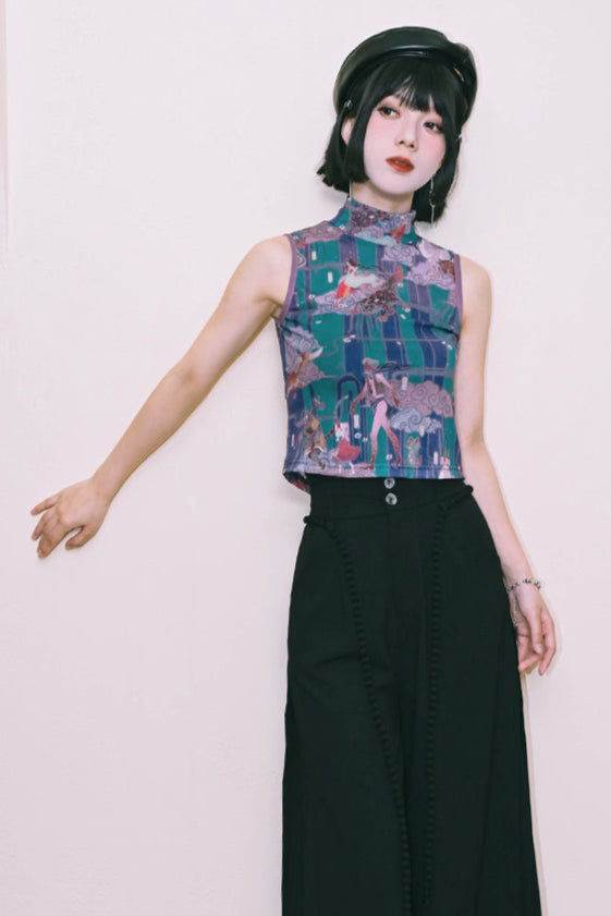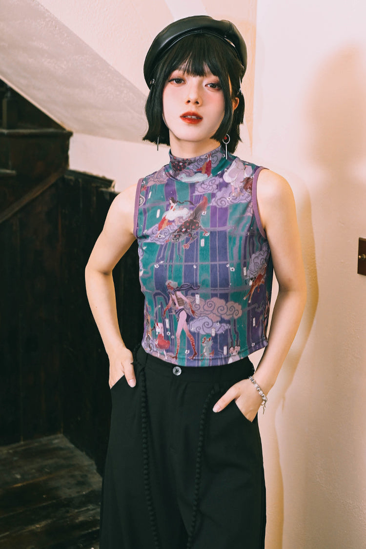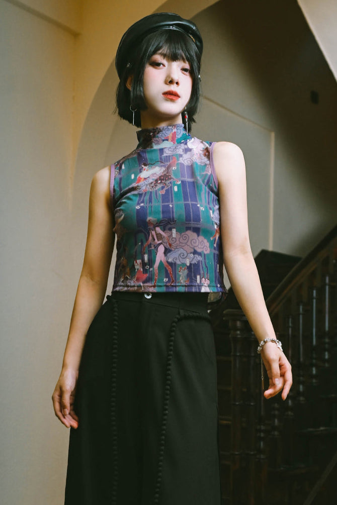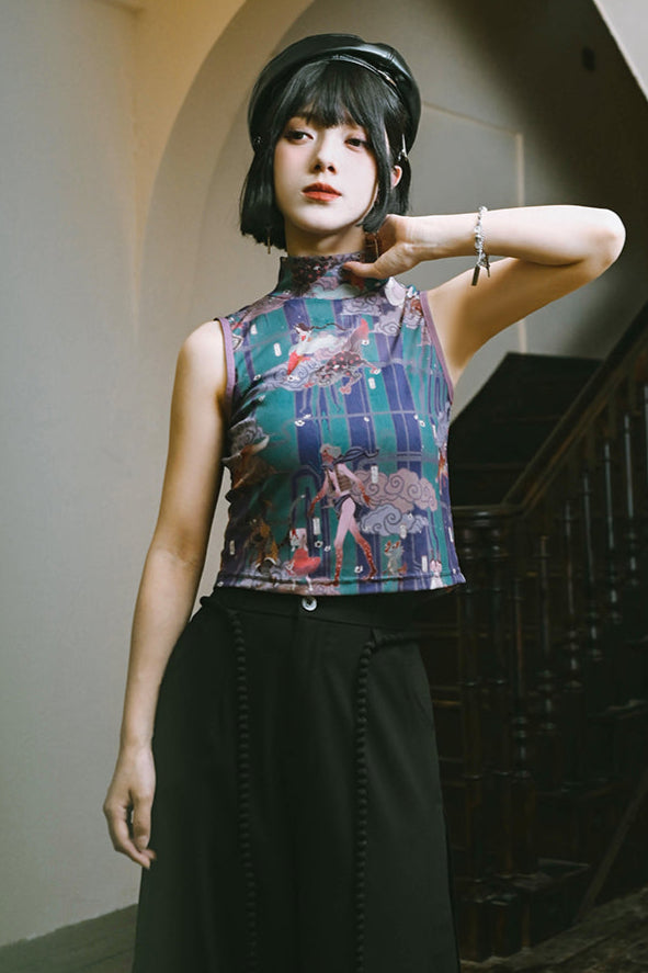 プリントメッシュハイネックノースリーブトップス